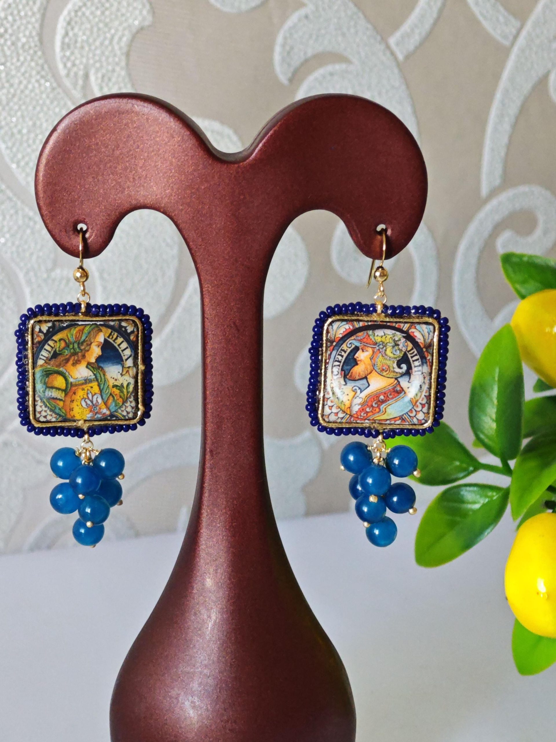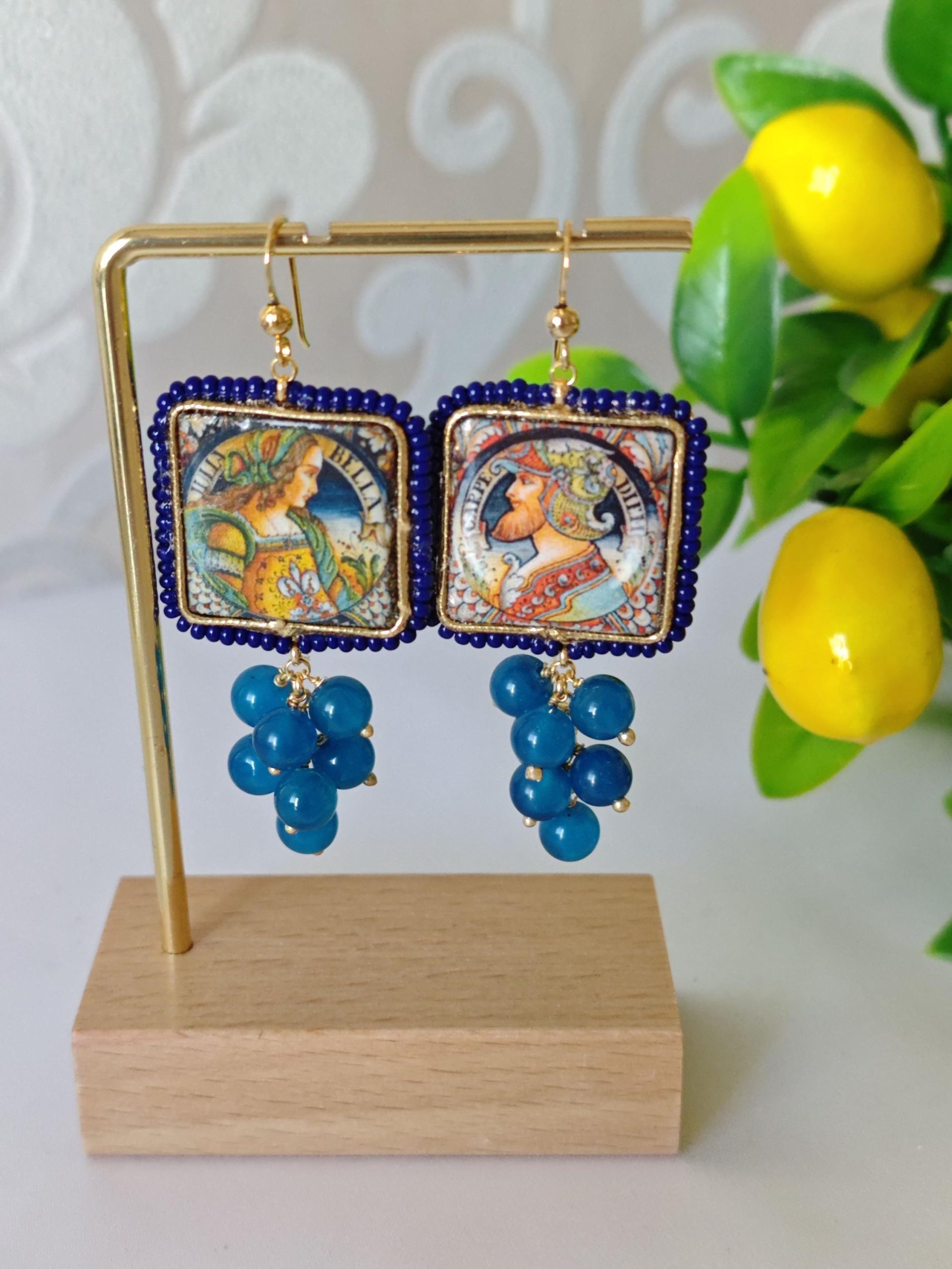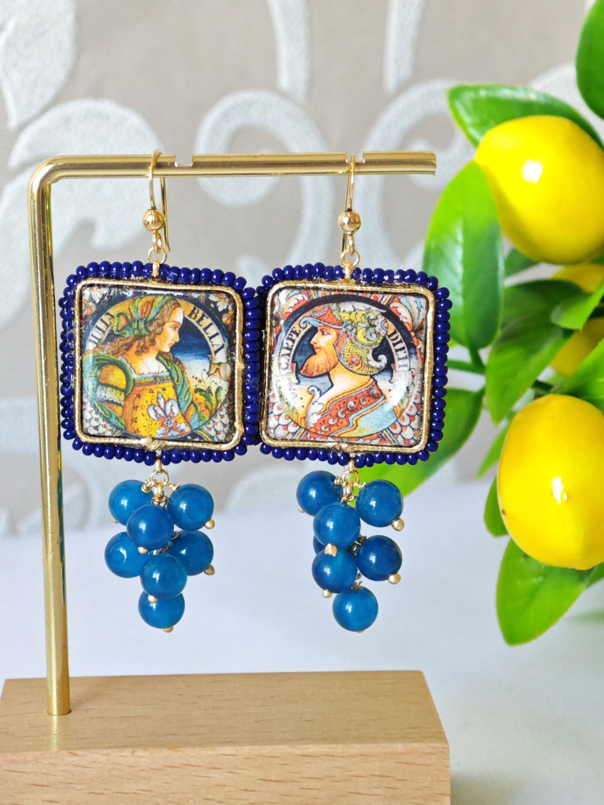 Orecchini piastrelle ceramica Caltagirone con grappolo pietre dure agata blu, orecchini siciliani
