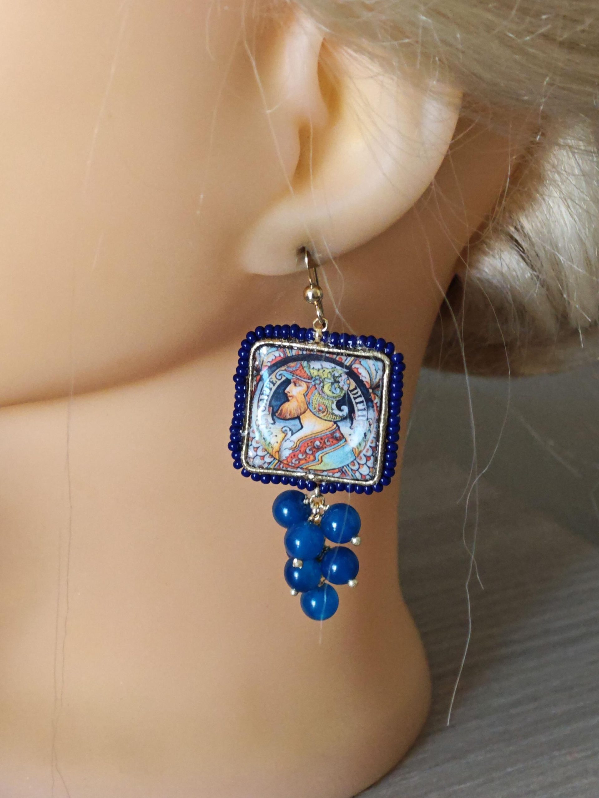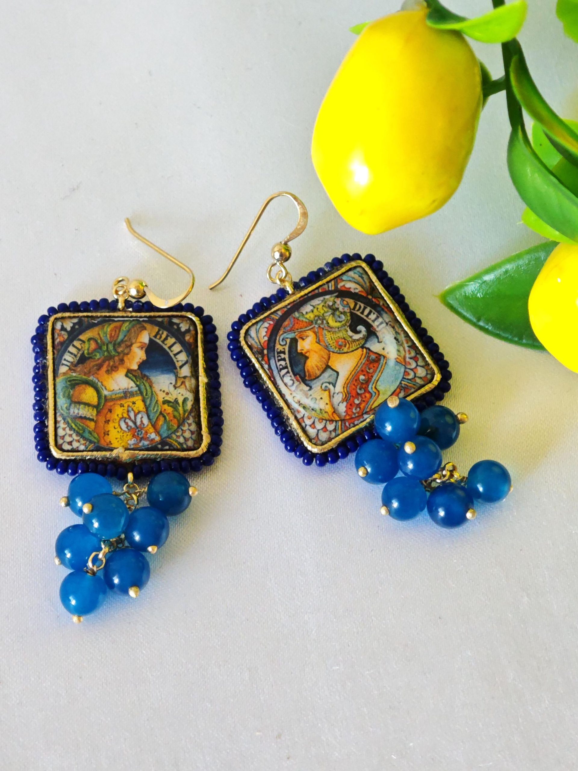 Orecchini pendenti con piastrelle in pietra lavica smaltata con motivi ceramica di Caltagirone realizzata a mano, 2×2 cm dimensioni, cornice perline e grappolo pietre dure agata blu , chiusura a monachelle in ottone anallergico placcato oro.