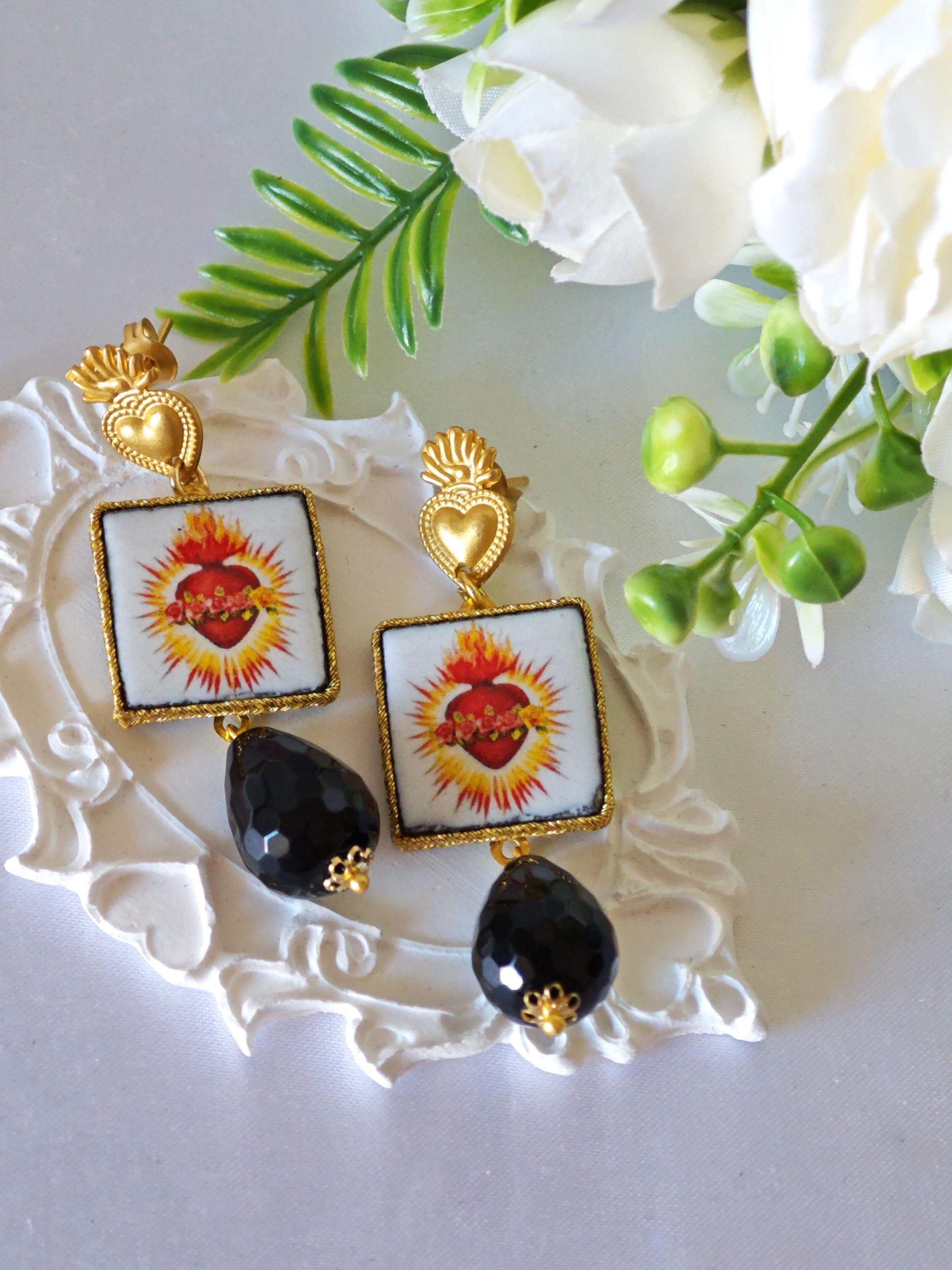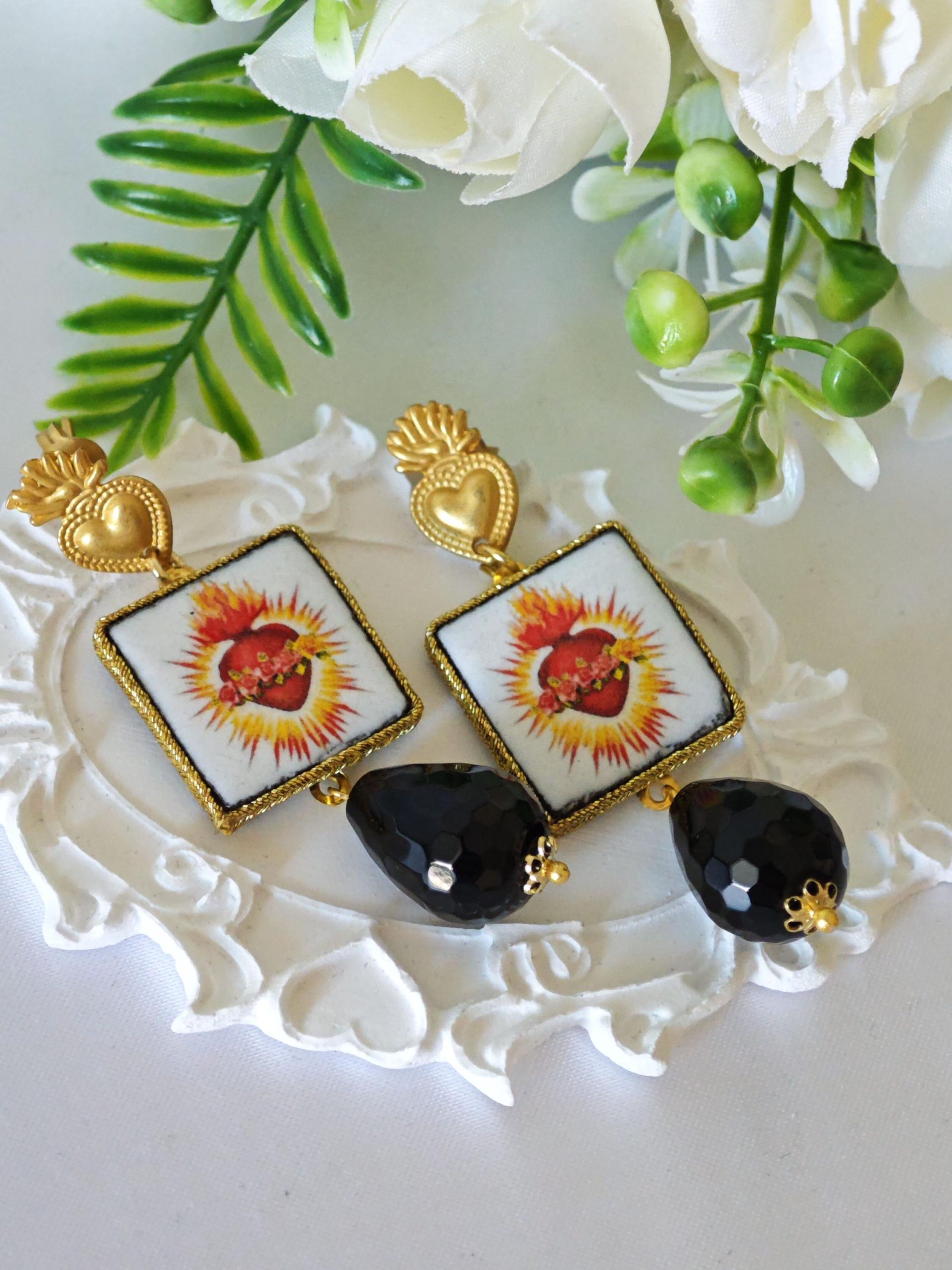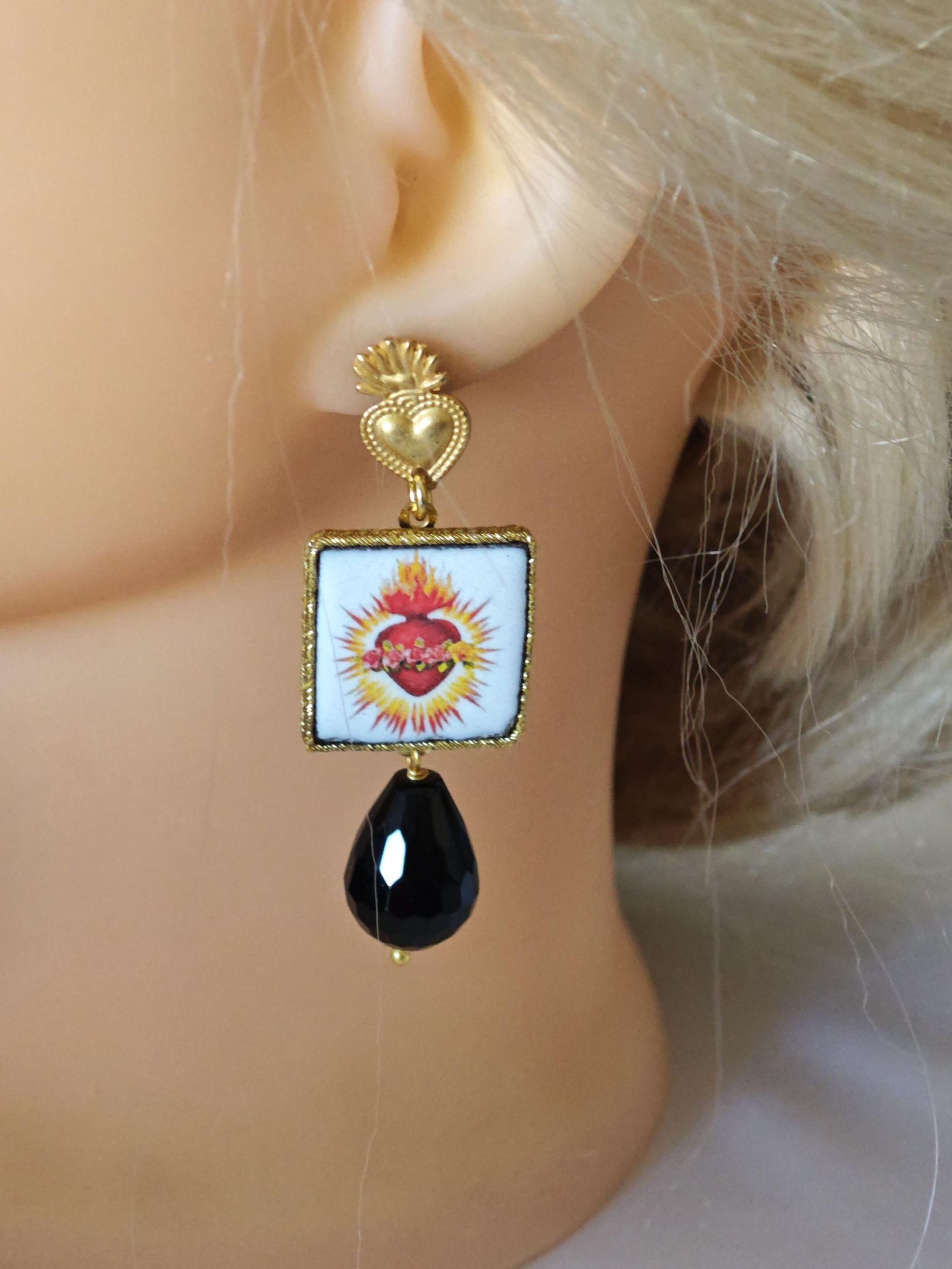 Orecchini pendenti con piastrelle in pietra lavica smaltata con motivi Caltagirone realizzata a mano, 2×2 cm, pietre dure sfaccettate a goccia onice nero, chiusura a perno con farfallina a forma di Cuore Sacro in ottone dorato satinato.
