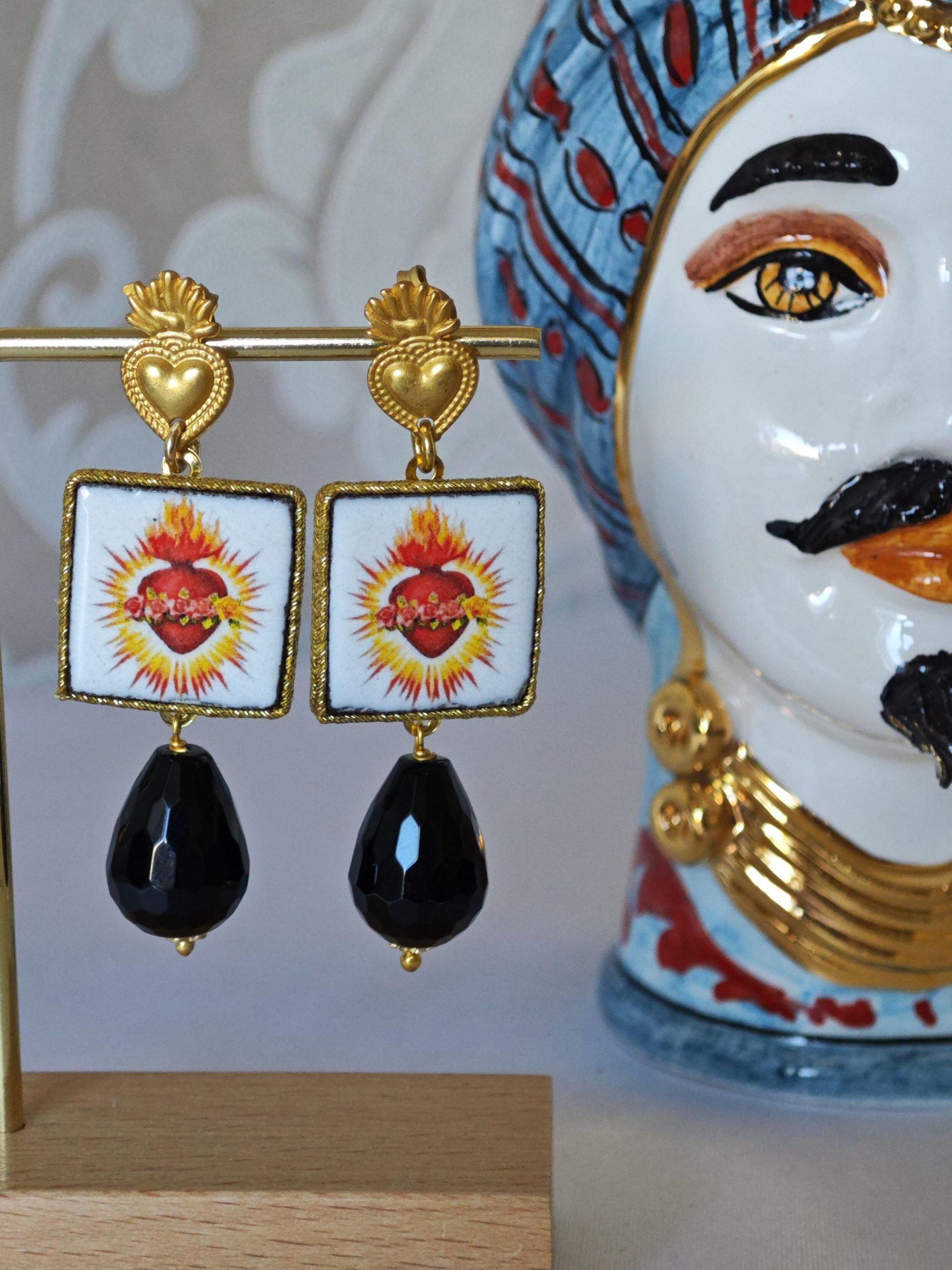 Orecchini piastrelle ceramica Caltagirone, orecchini goccia onice nero , orecchini siciliani Cuore Sacro