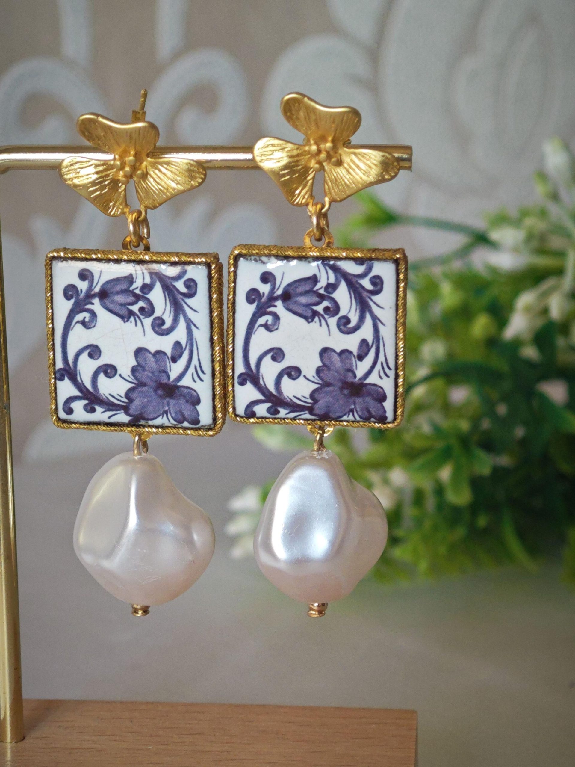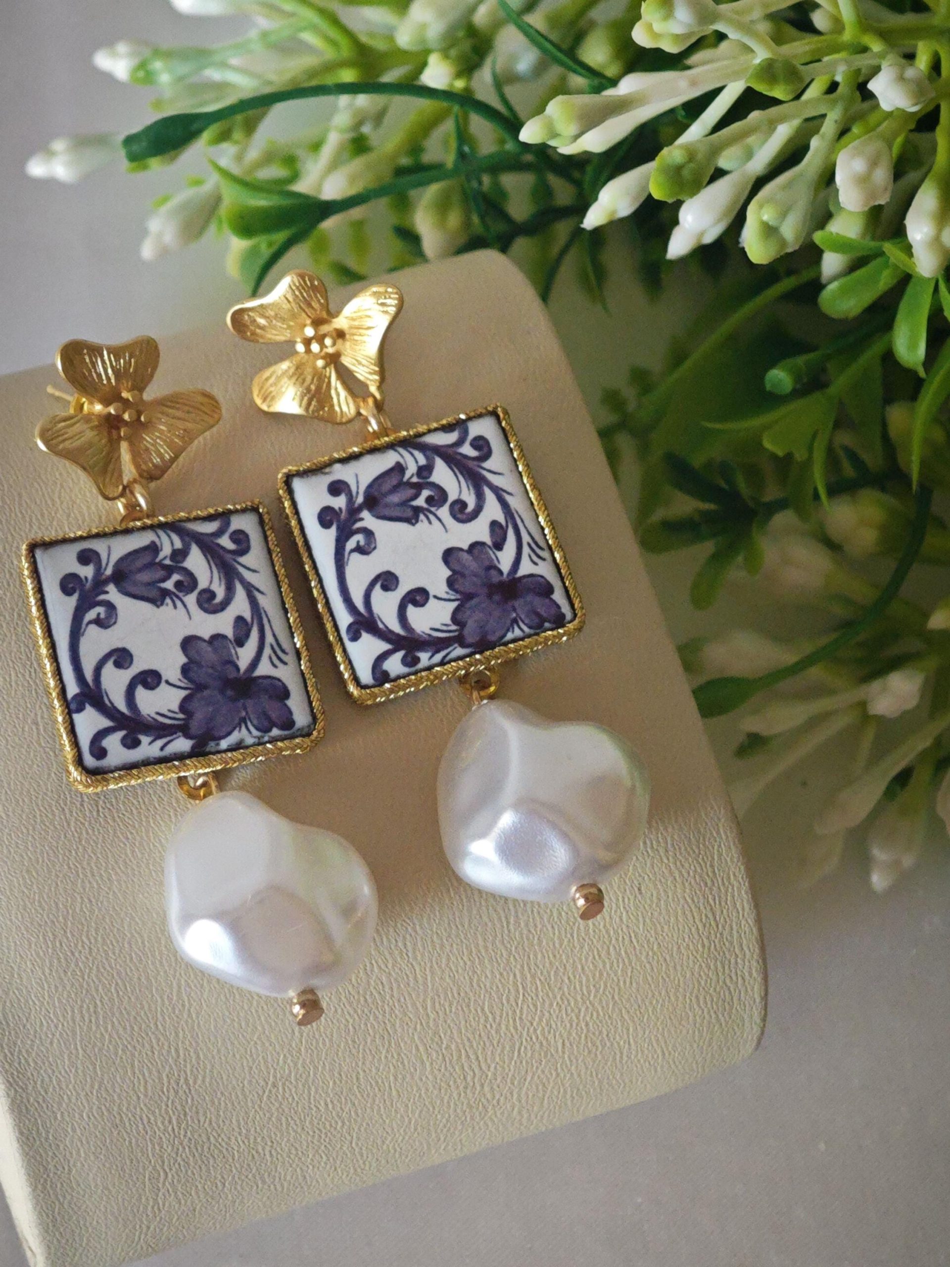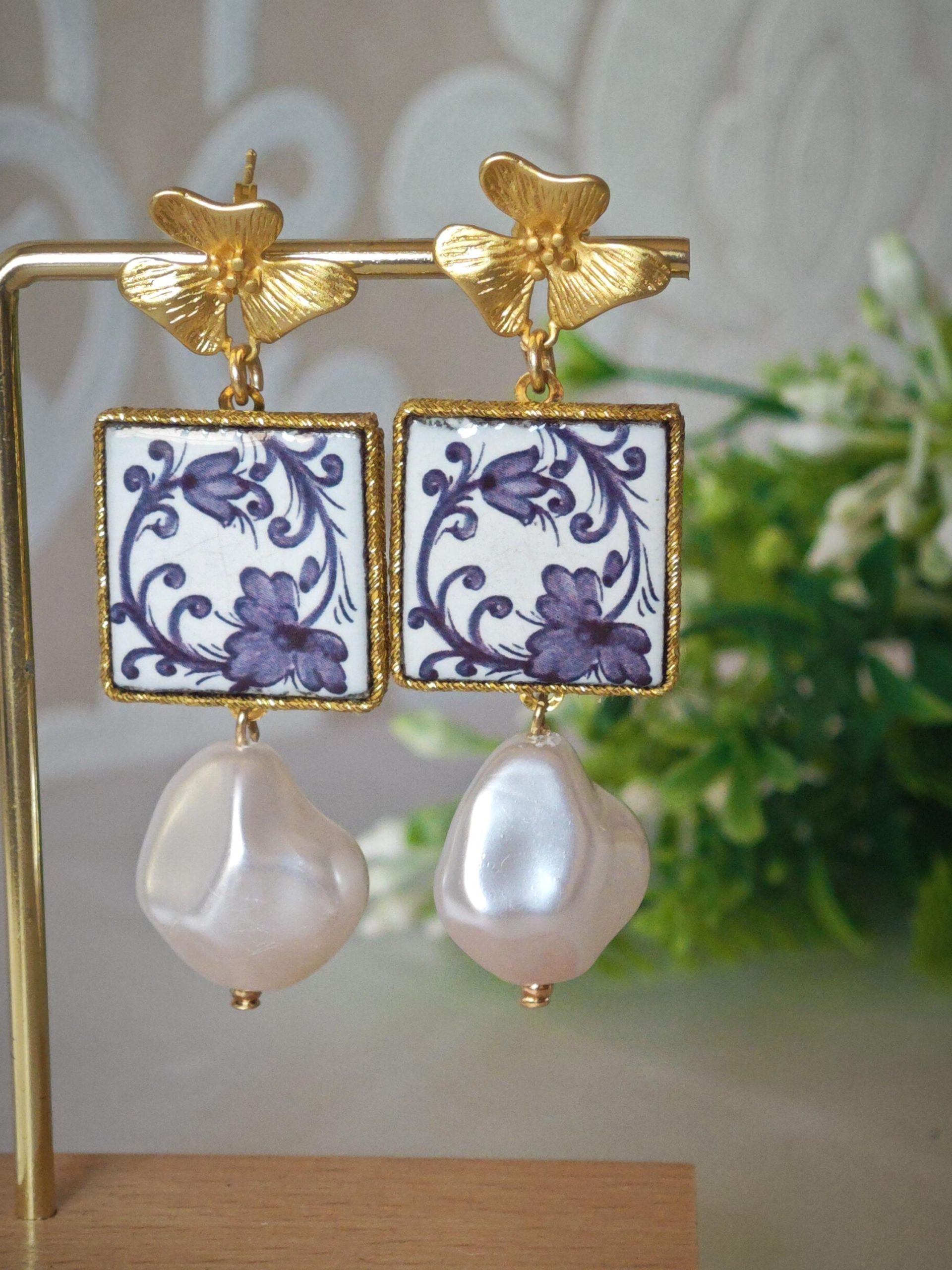 Orecchini piastrelle ceramica di Caltagirone con perle bianche barocche , orecchini siciliani
