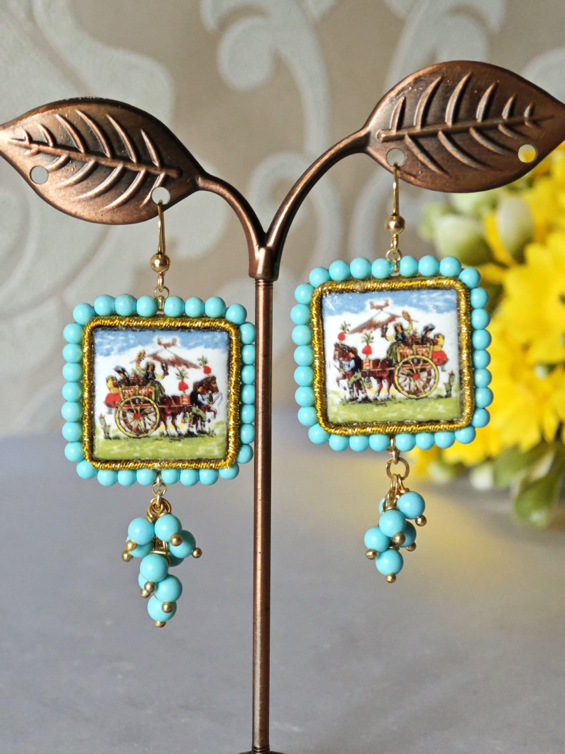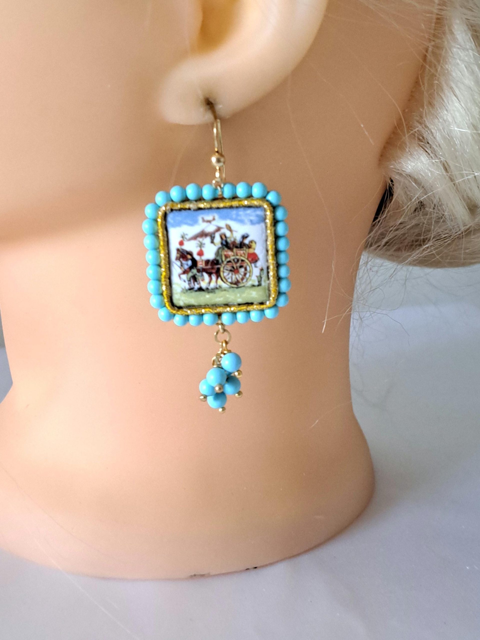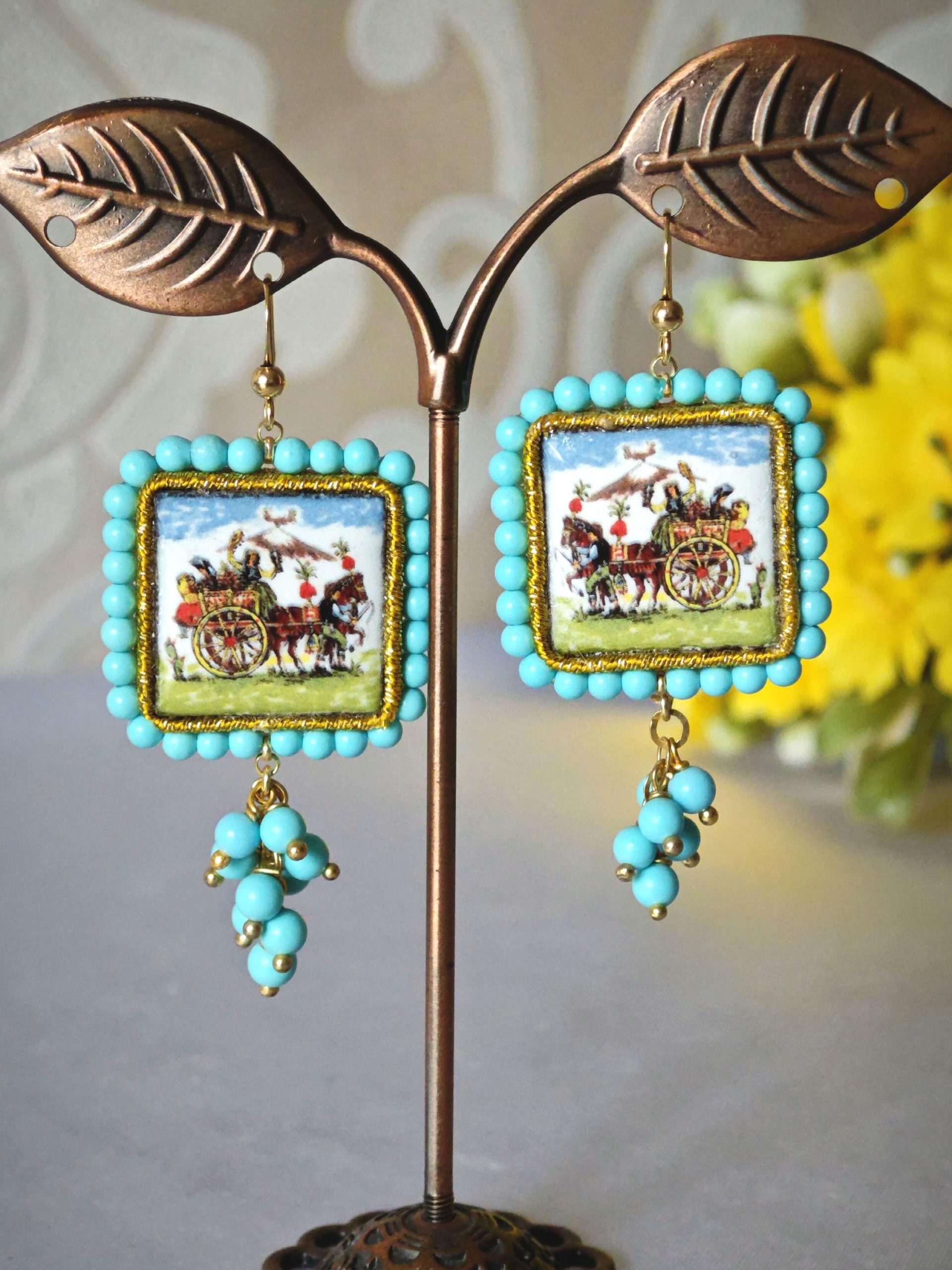 Orecchini pendenti con piastrelle in pietra lavica smaltata stampata con motivi ceramica di Caltagirone realizzata a mano, 2×2 cm dimensioni, cornice e grappoli perline pasta di turchese, chiusura a monachelle in argento 925 placcato oro.