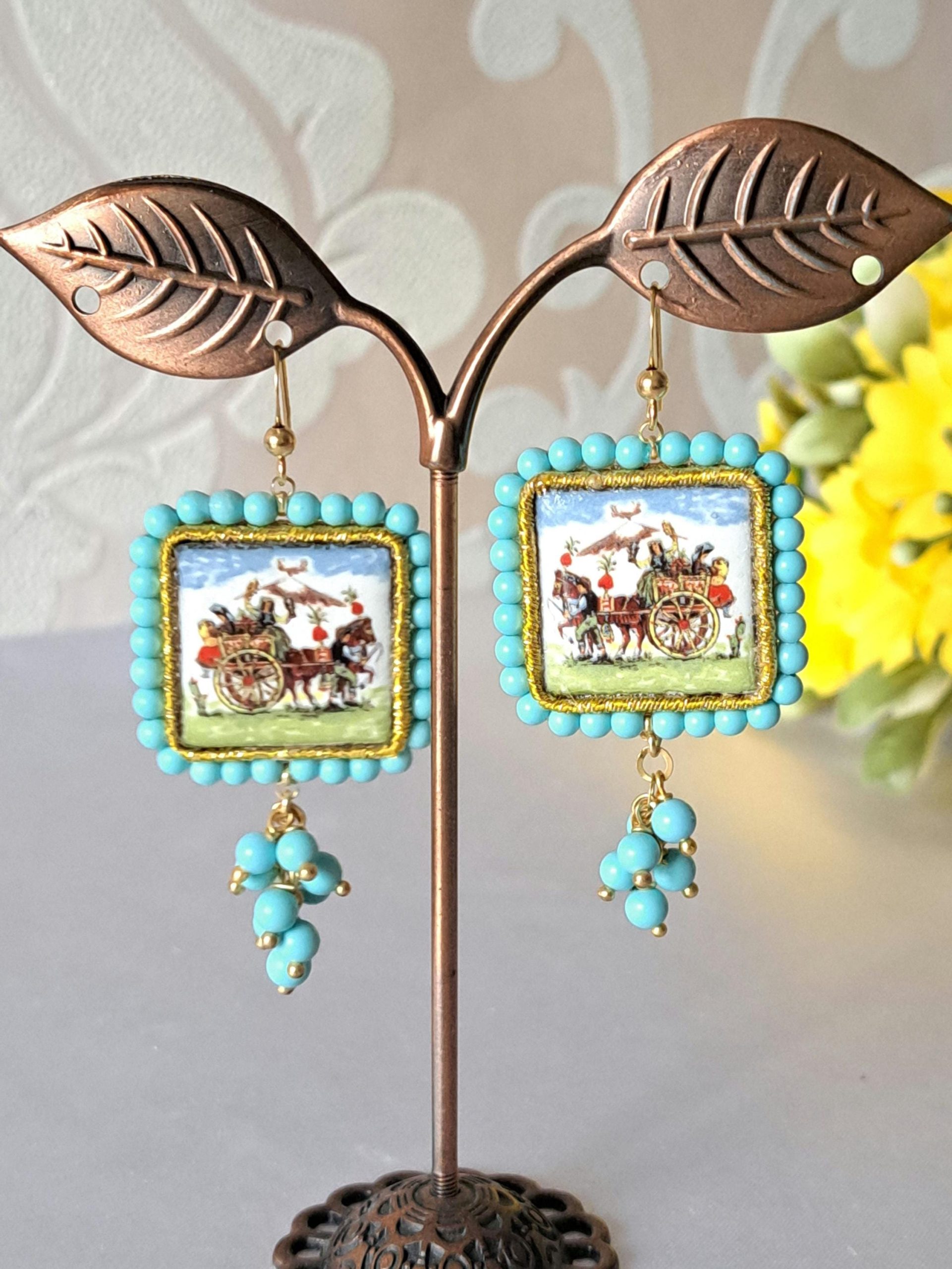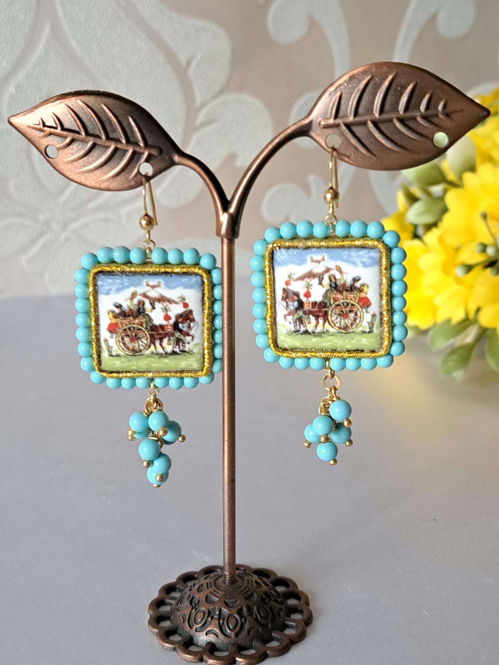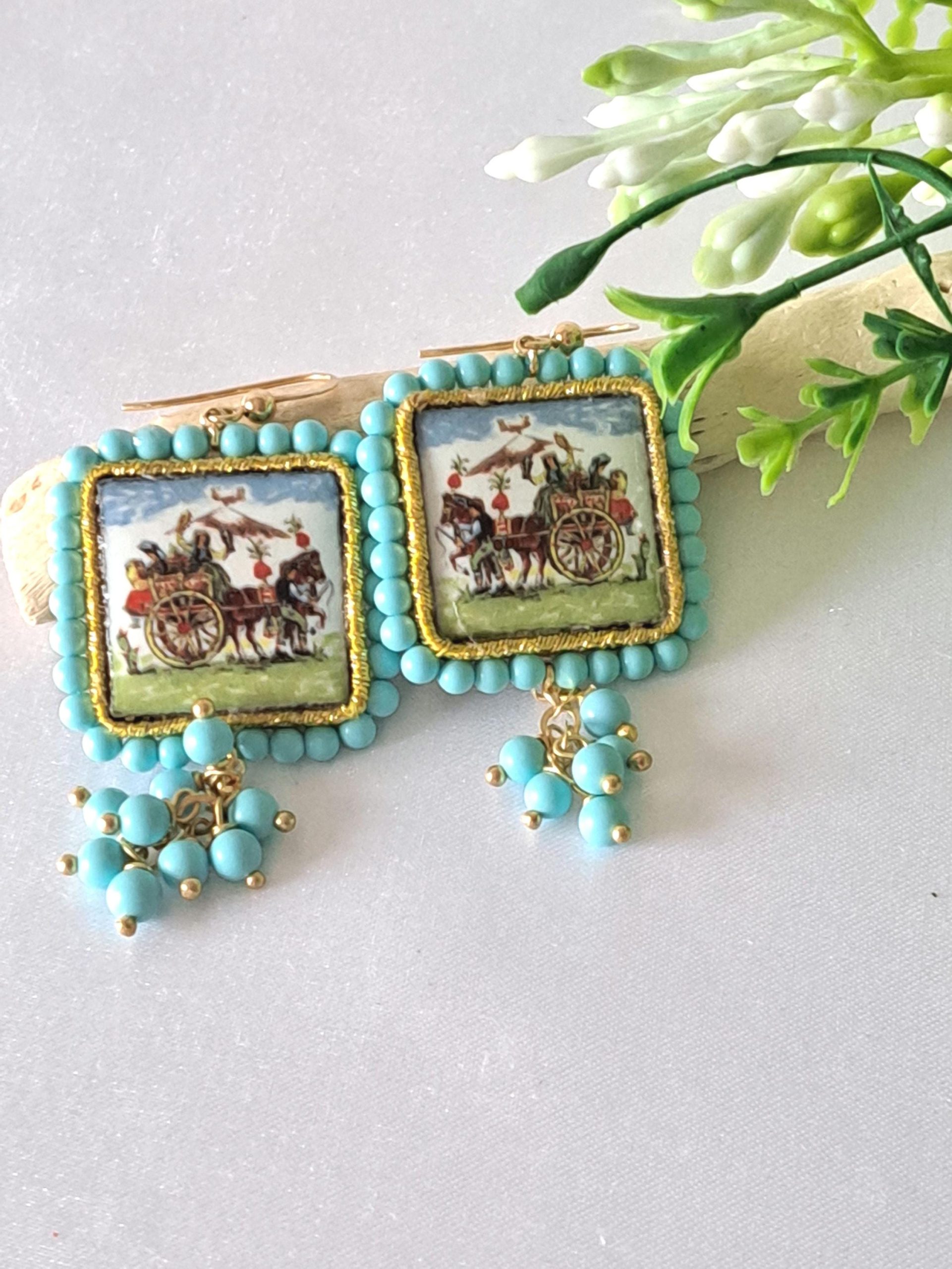 Orecchini pendenti con piastrelle in pietra lavica smaltata stampata con motivi ceramica di Caltagirone realizzata a mano, 2×2 cm dimensioni, cornice e grappoli perline pasta di turchese, chiusura a monachelle in argento 925 placcato oro.