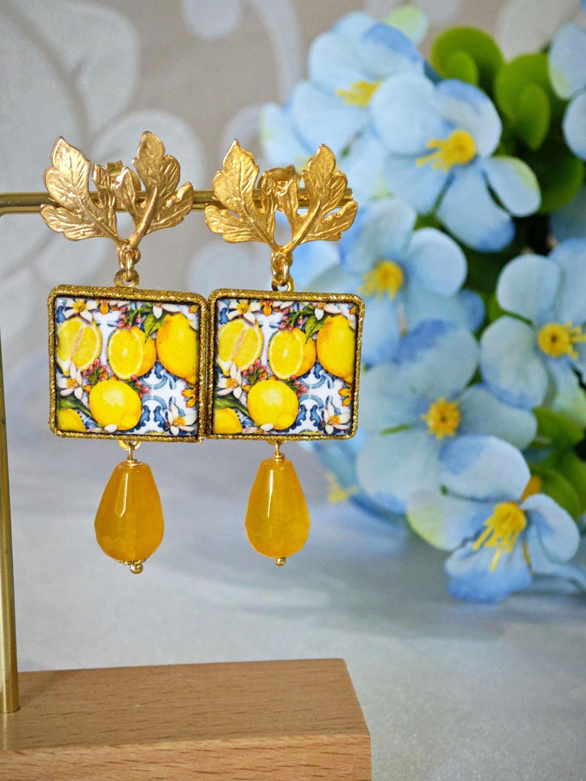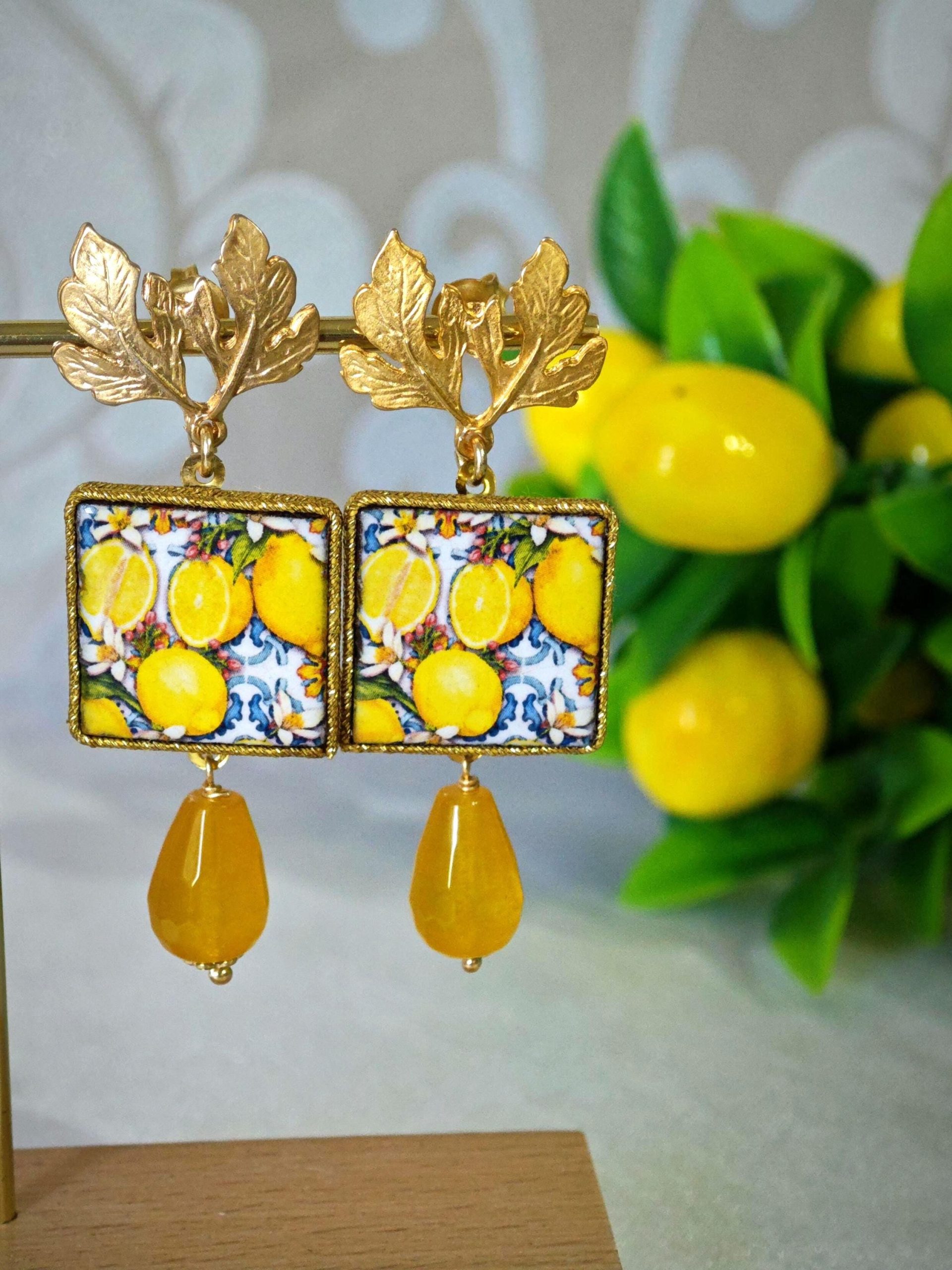 Orecchini piastrelle ceramica di Caltagirone, orecchini gocce agata gialla, orecchini siciliani