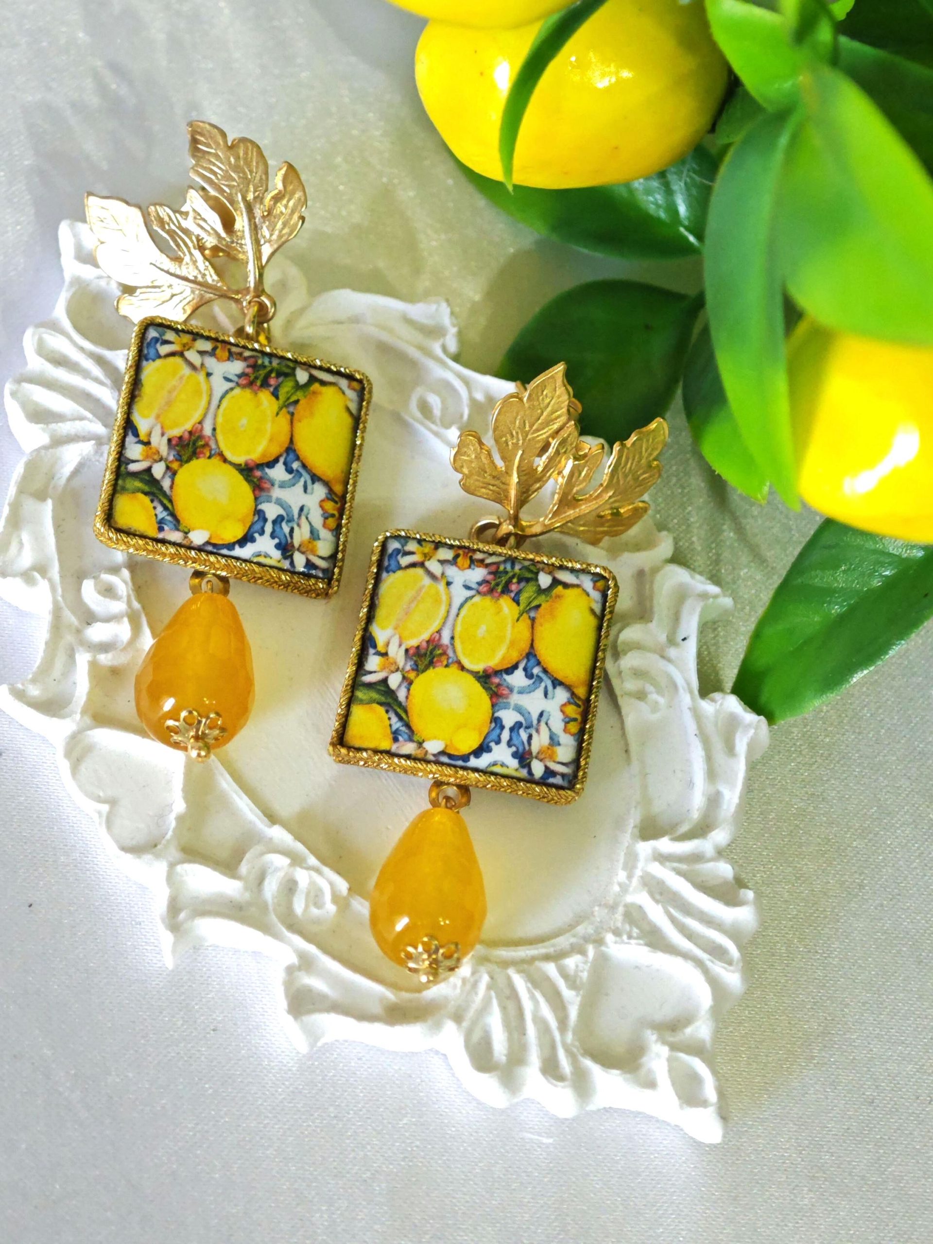 Orecchini limoni ceramica Caltagirone e fiori bianchi , orecchini siciliani