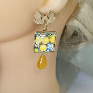 Orecchini pendenti con piastrelle in pietra lavica smaltata con motivi Caltagirone realizzata a mano 2×2 cm dimensioni, con gocce pietre dure agata gialla.