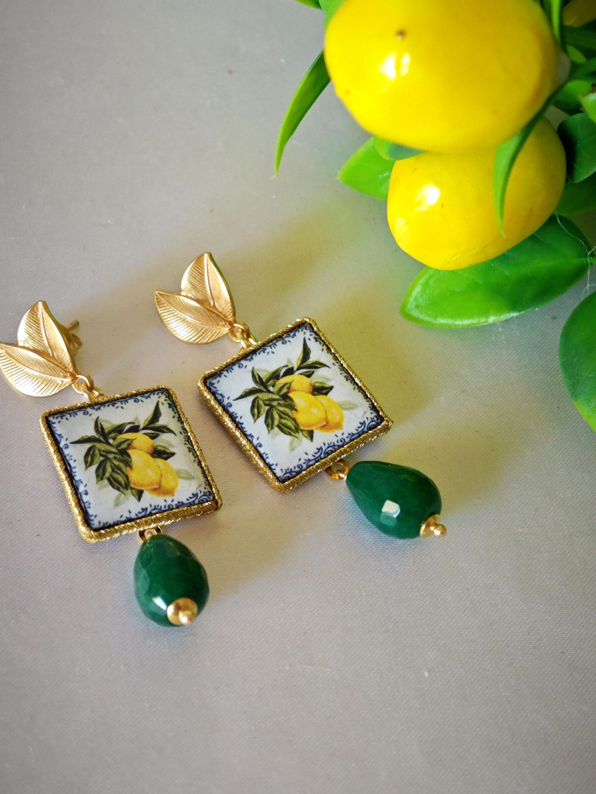 Orecchini piastrelle ceramica di Caltagirone, orecchini goccia giada verde, orecchini siciliani