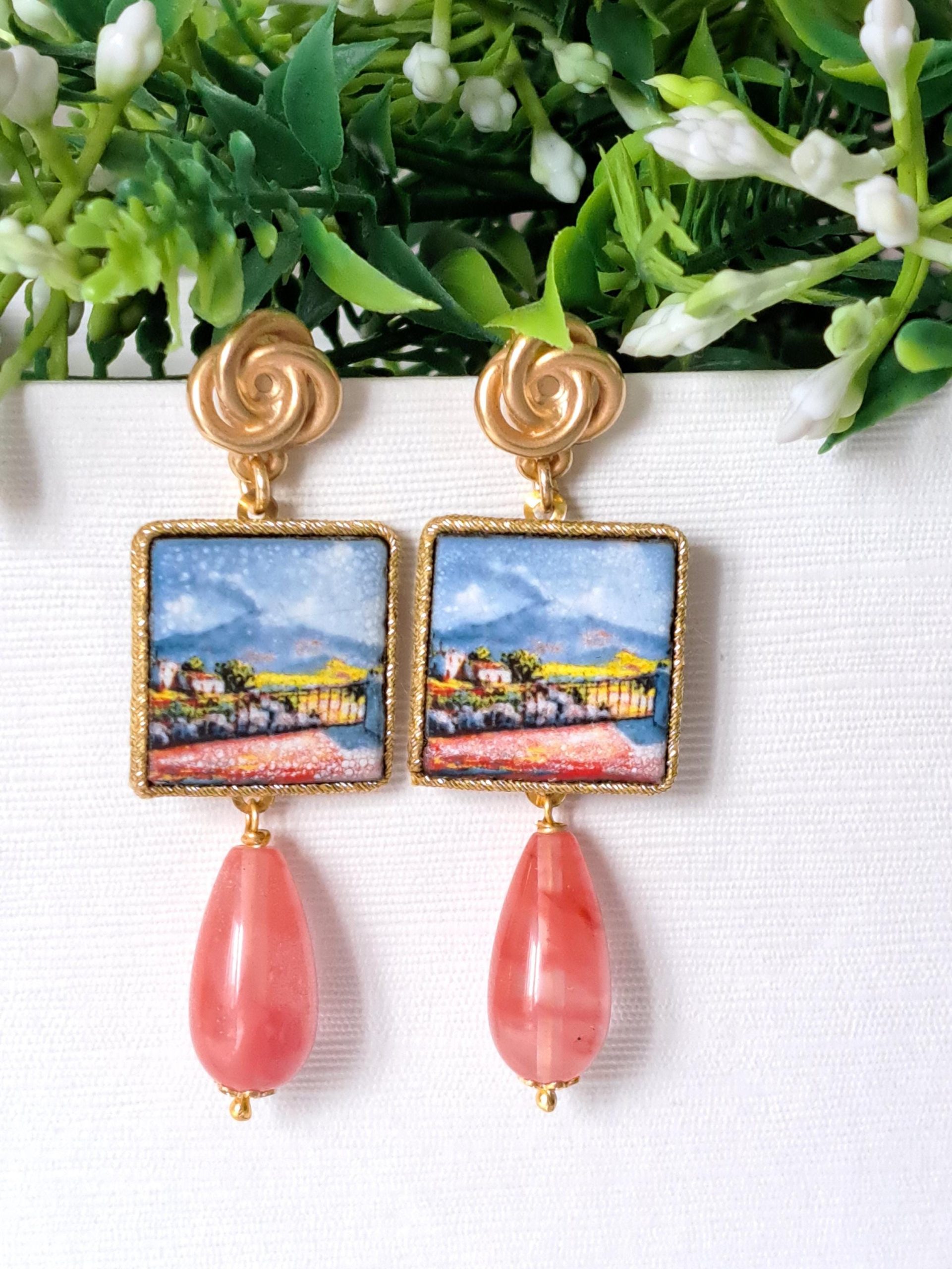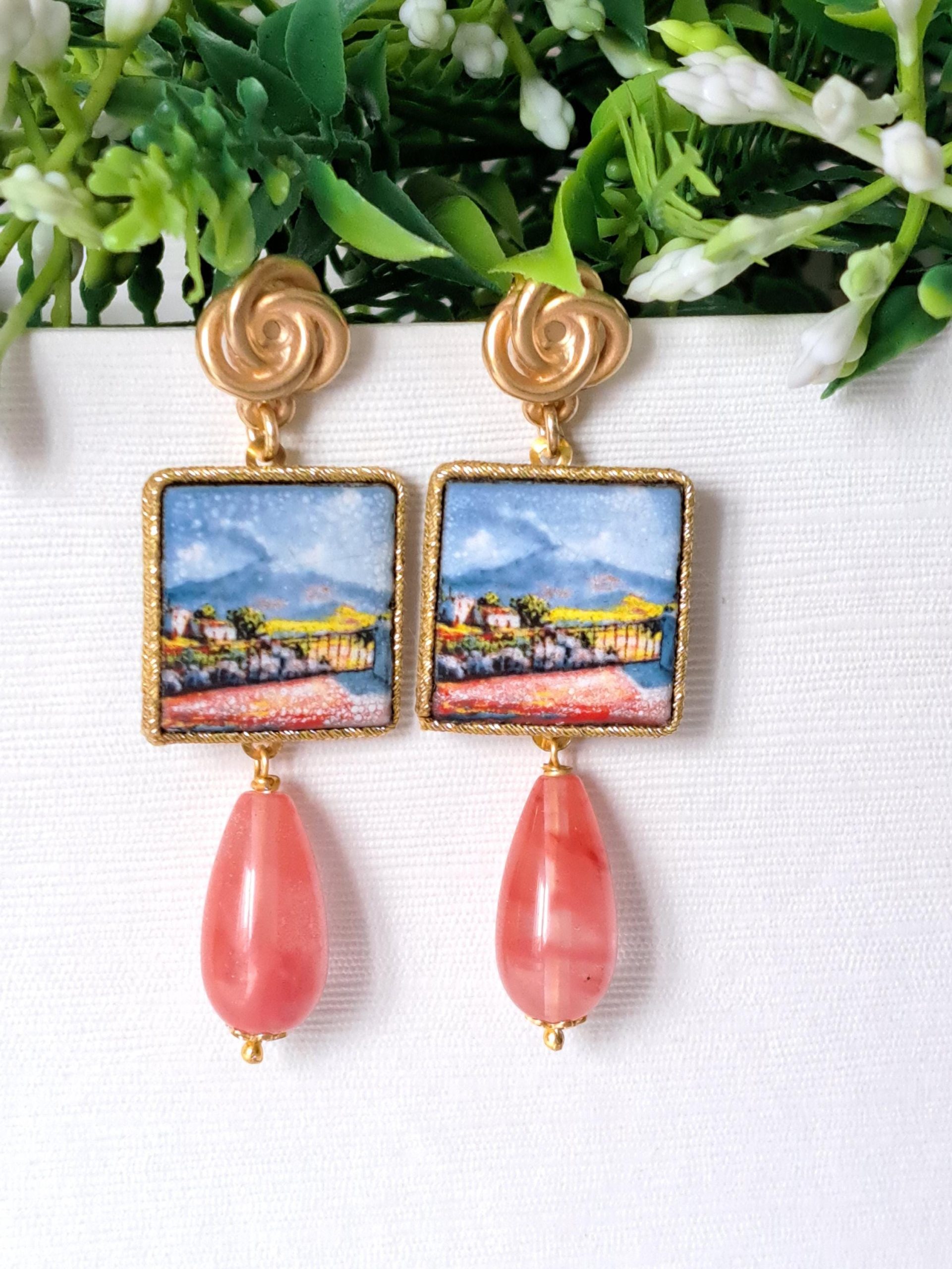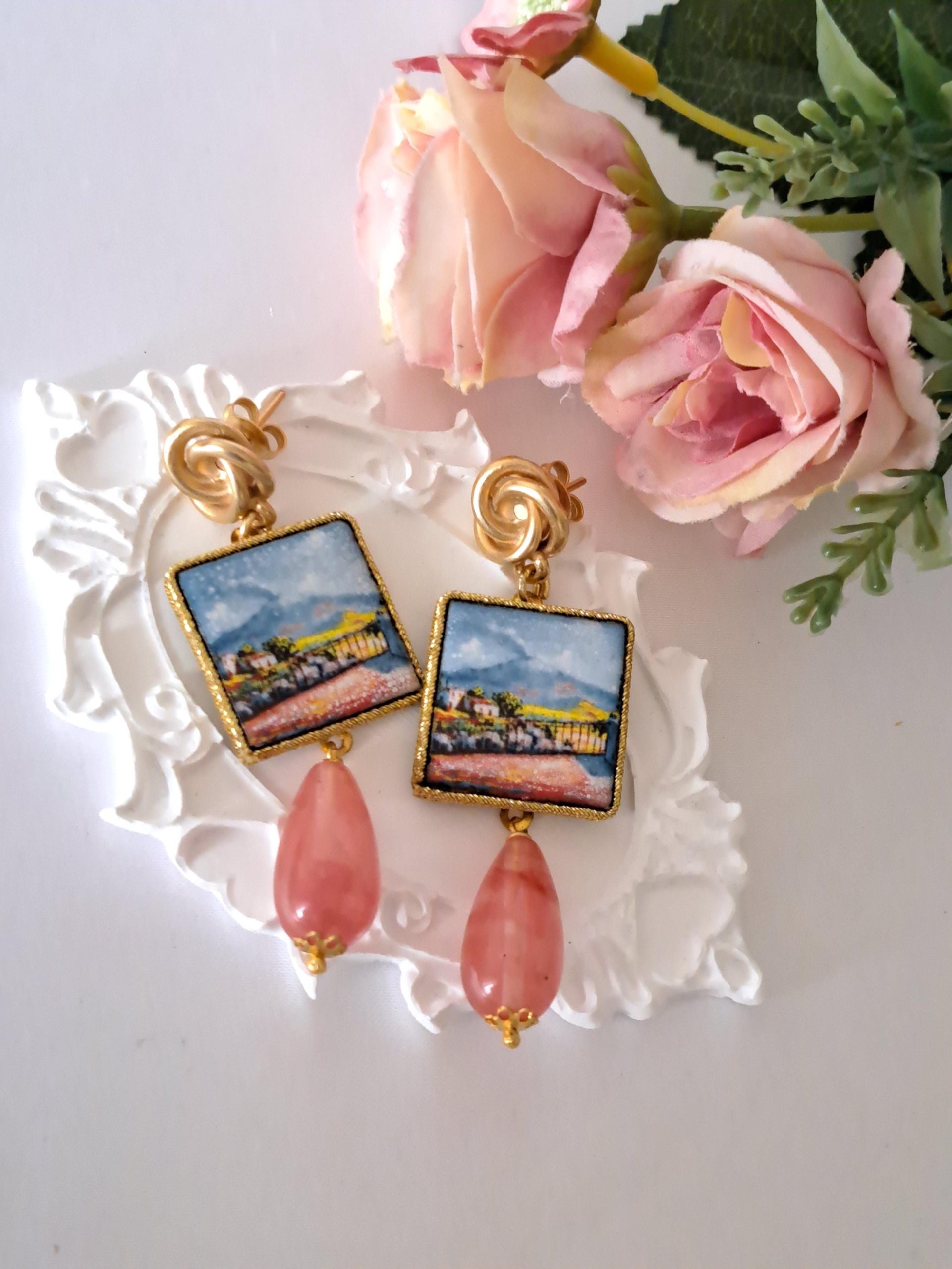 Orecchini piastrelle ceramica di Caltagirone, orecchini goccia quarzo rosa , orecchini siciliani