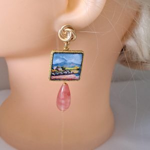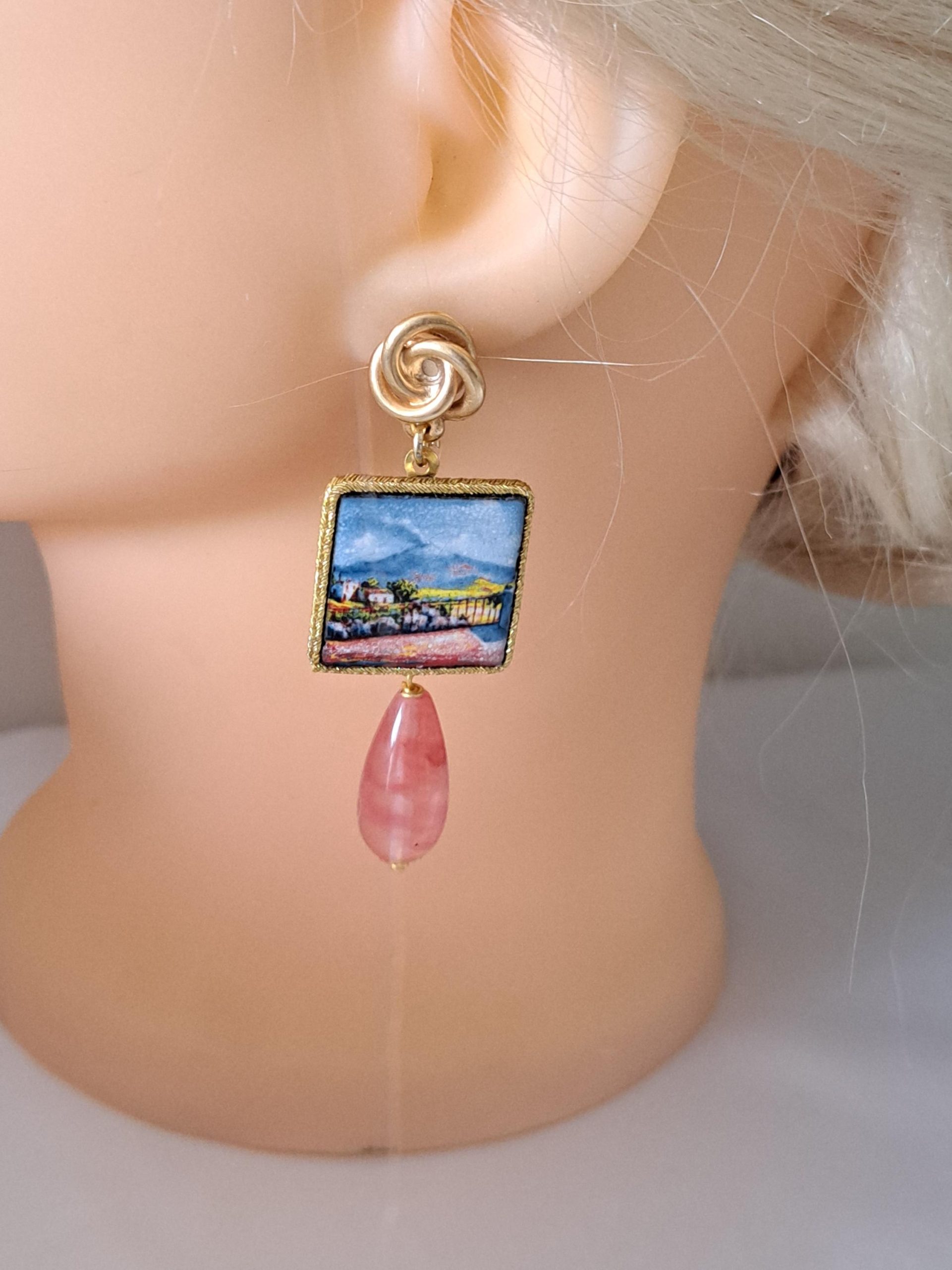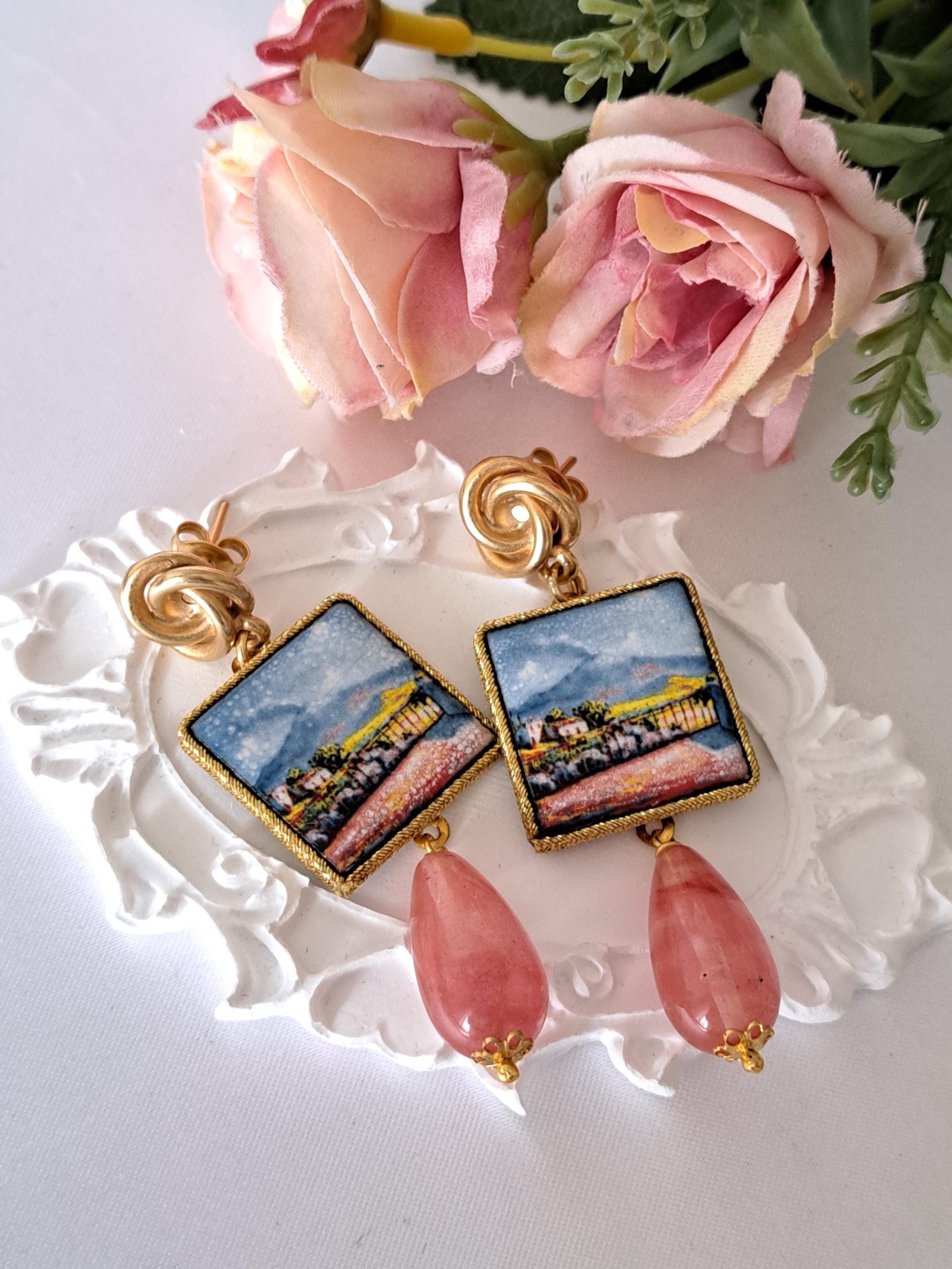 Orecchini pendenti con piastrelle in pietra lavica smaltata con motivi Caltagirone realizzata a mano, 2×2 cm, pietre dure a goccia quarzo rosa fragola , chiusura a perno con farfallina in ottone dorato satinato .