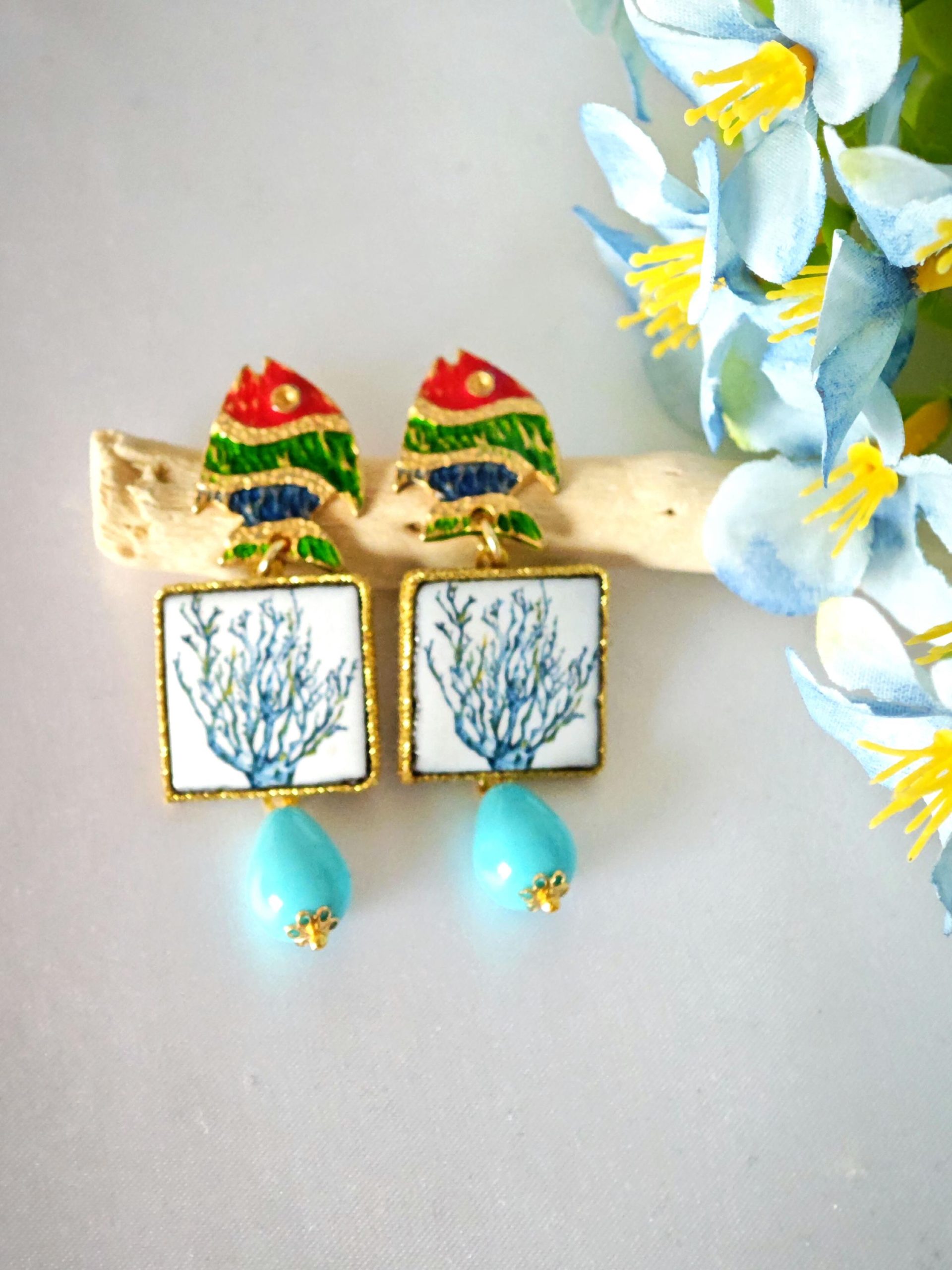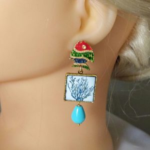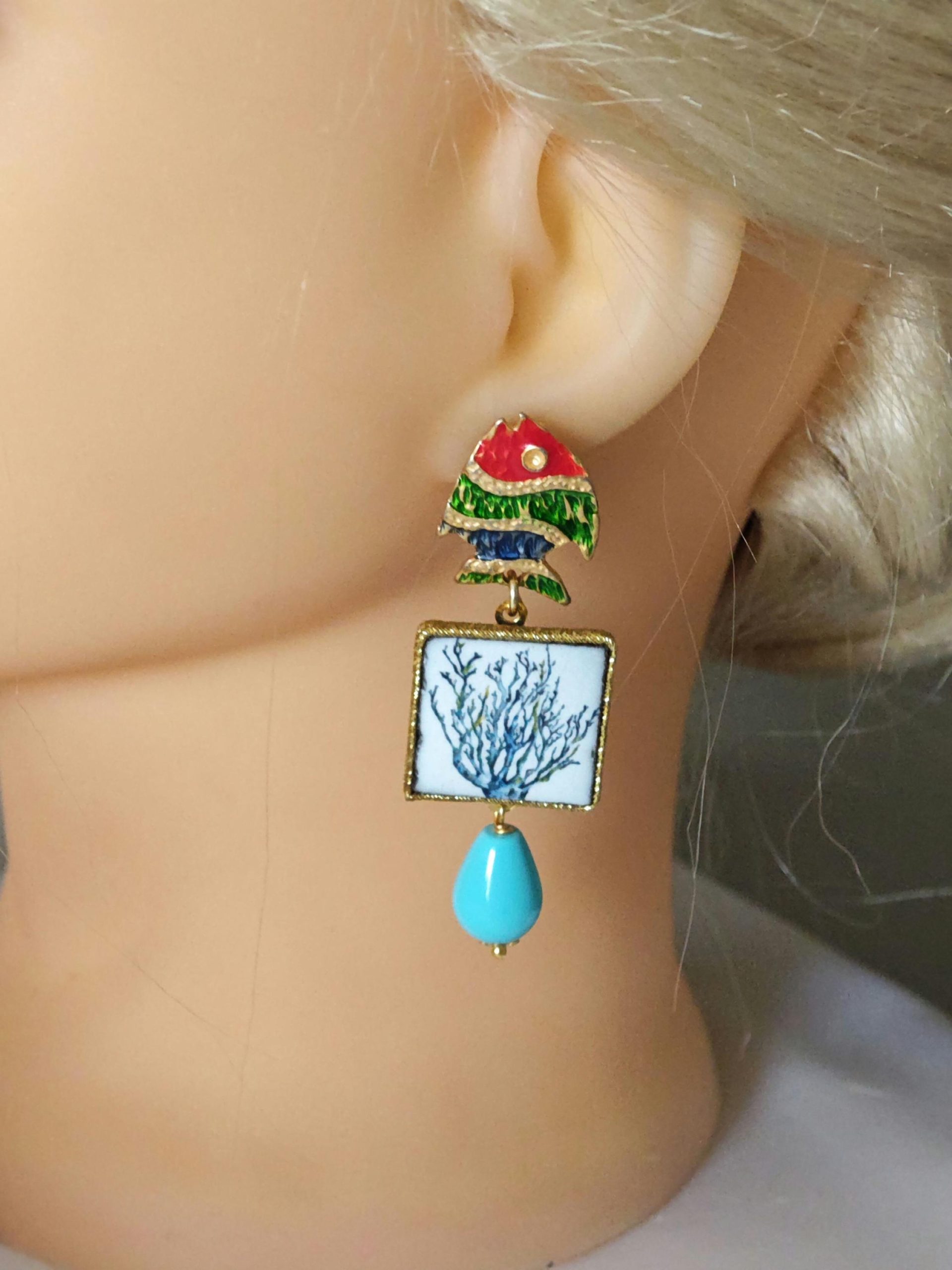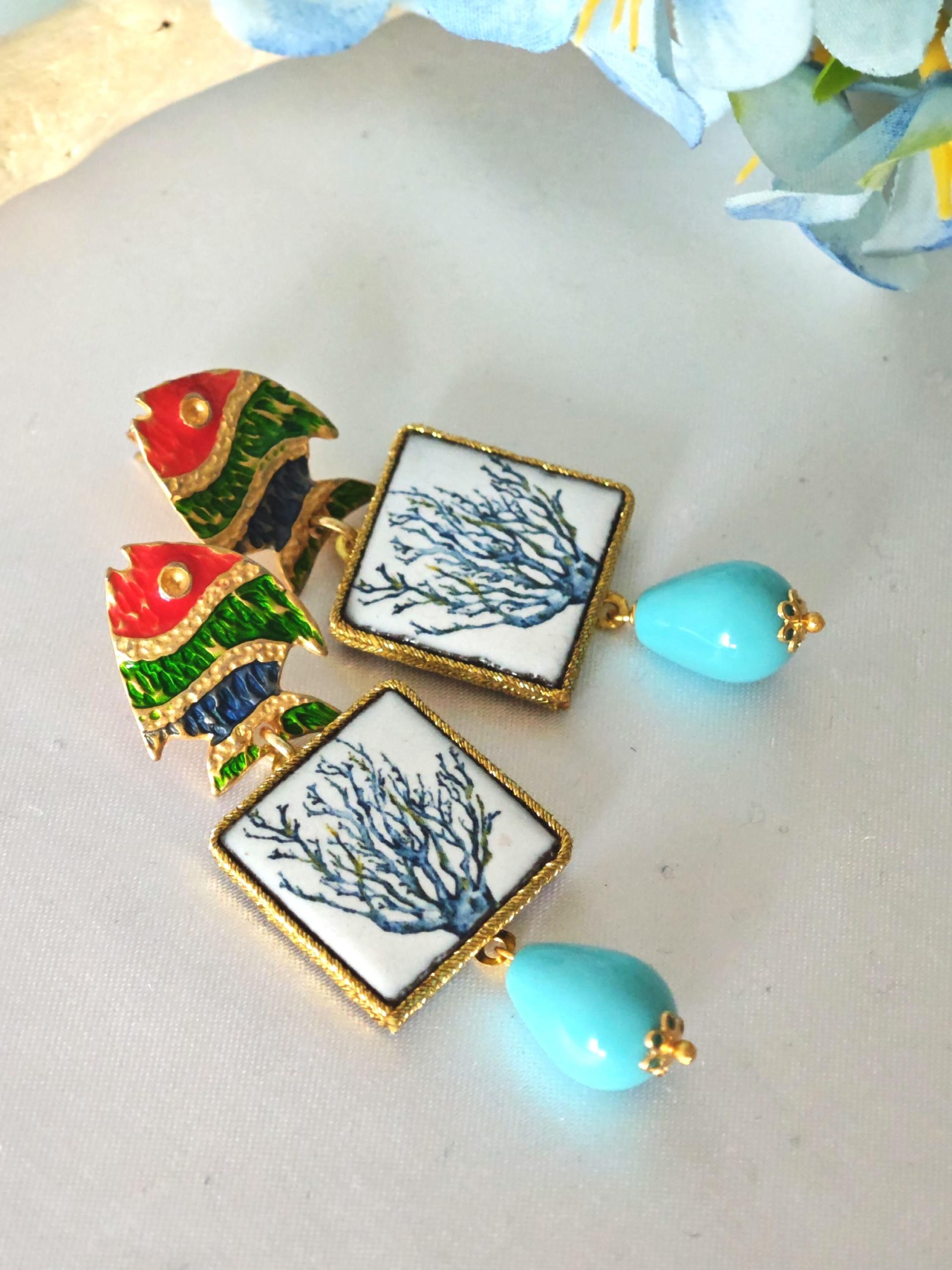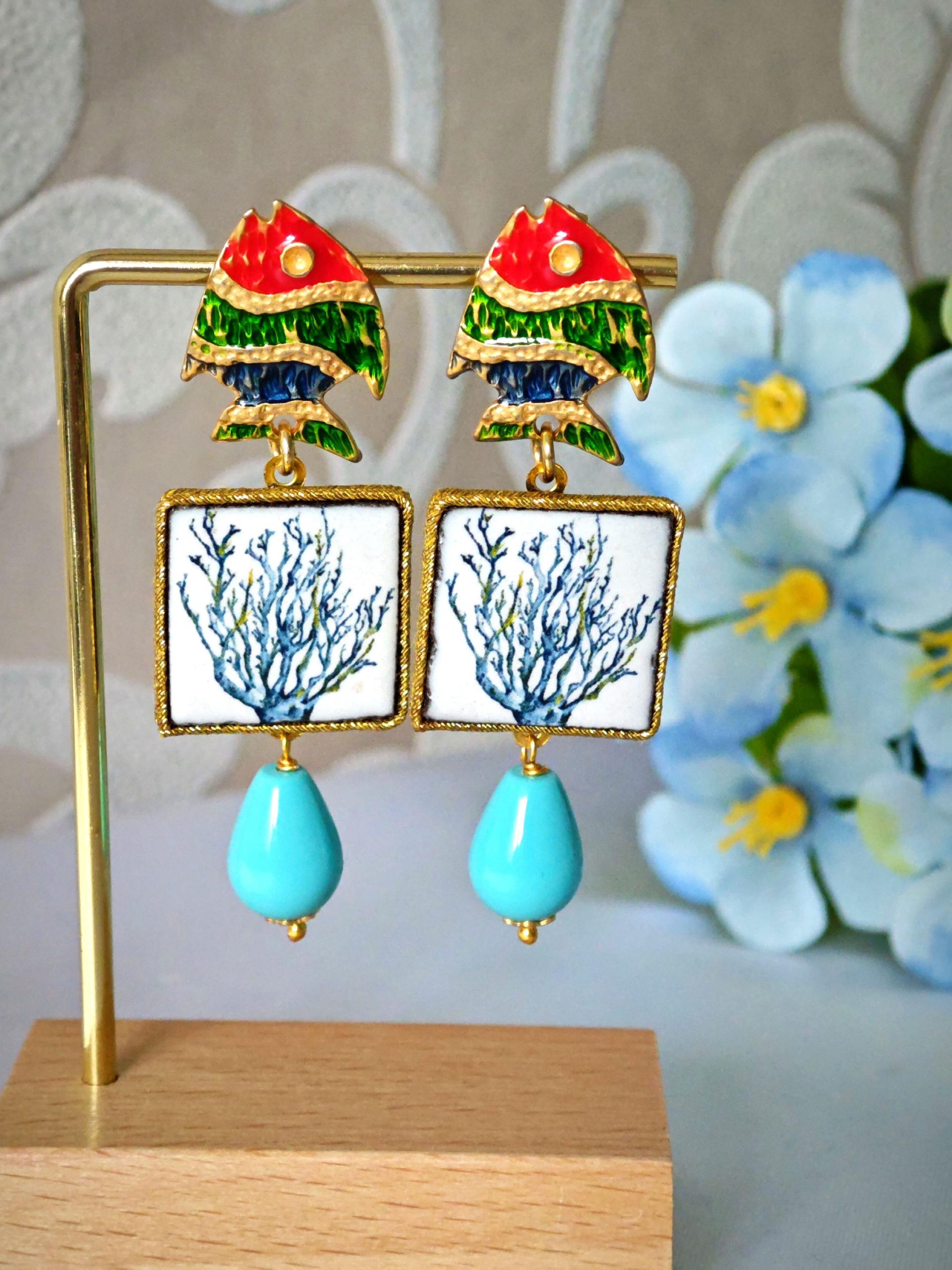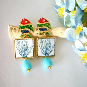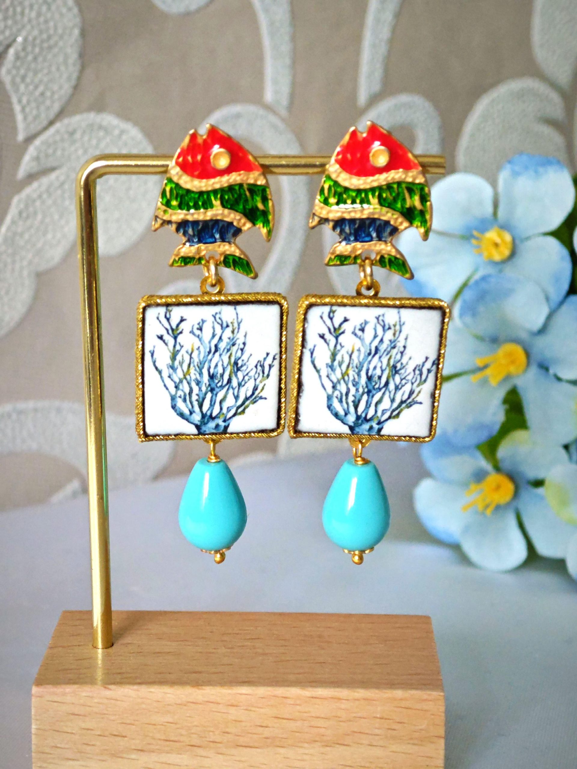 Orecchini piastrelle in ceramica di Caltagirone con pesciolini e gocce turchese , orecchini siciliani