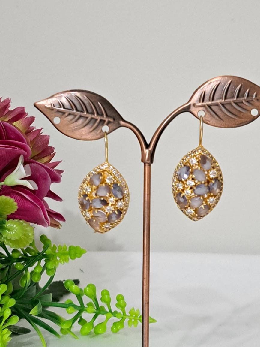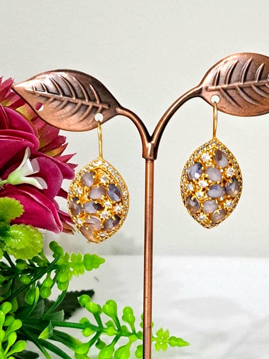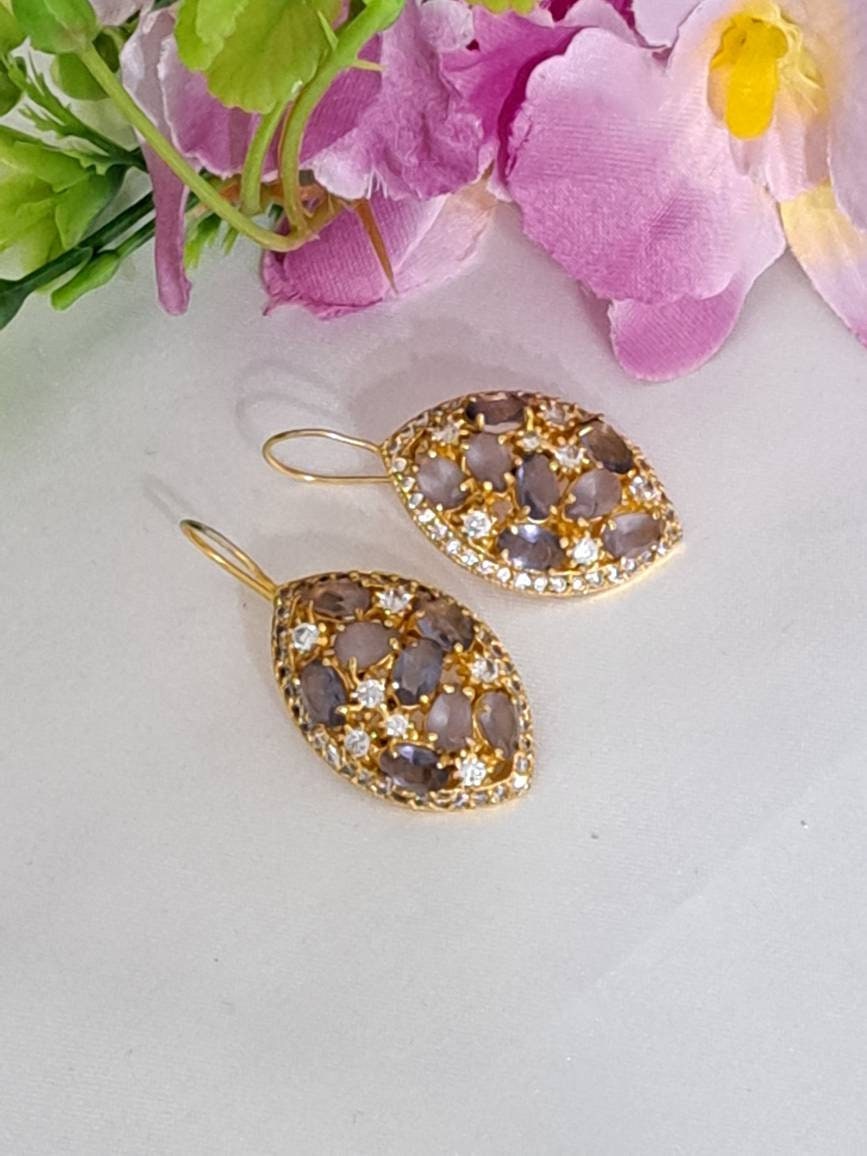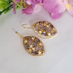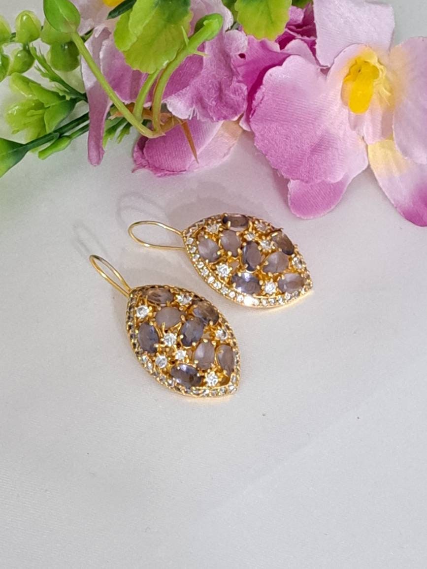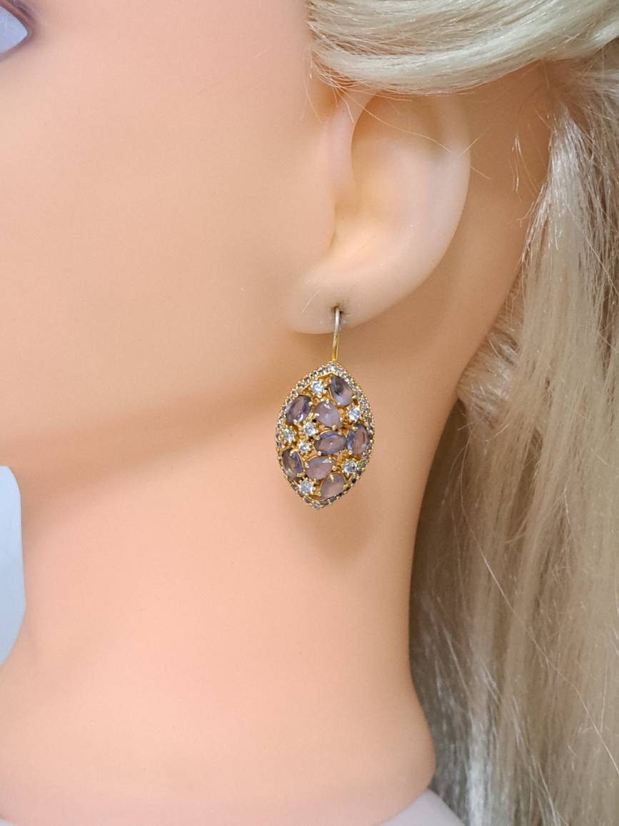 Orecchini in ottone dorato pietre dure ametista e zirconi bianchi, chiusura a monachelle , lunghezza 4 cm.