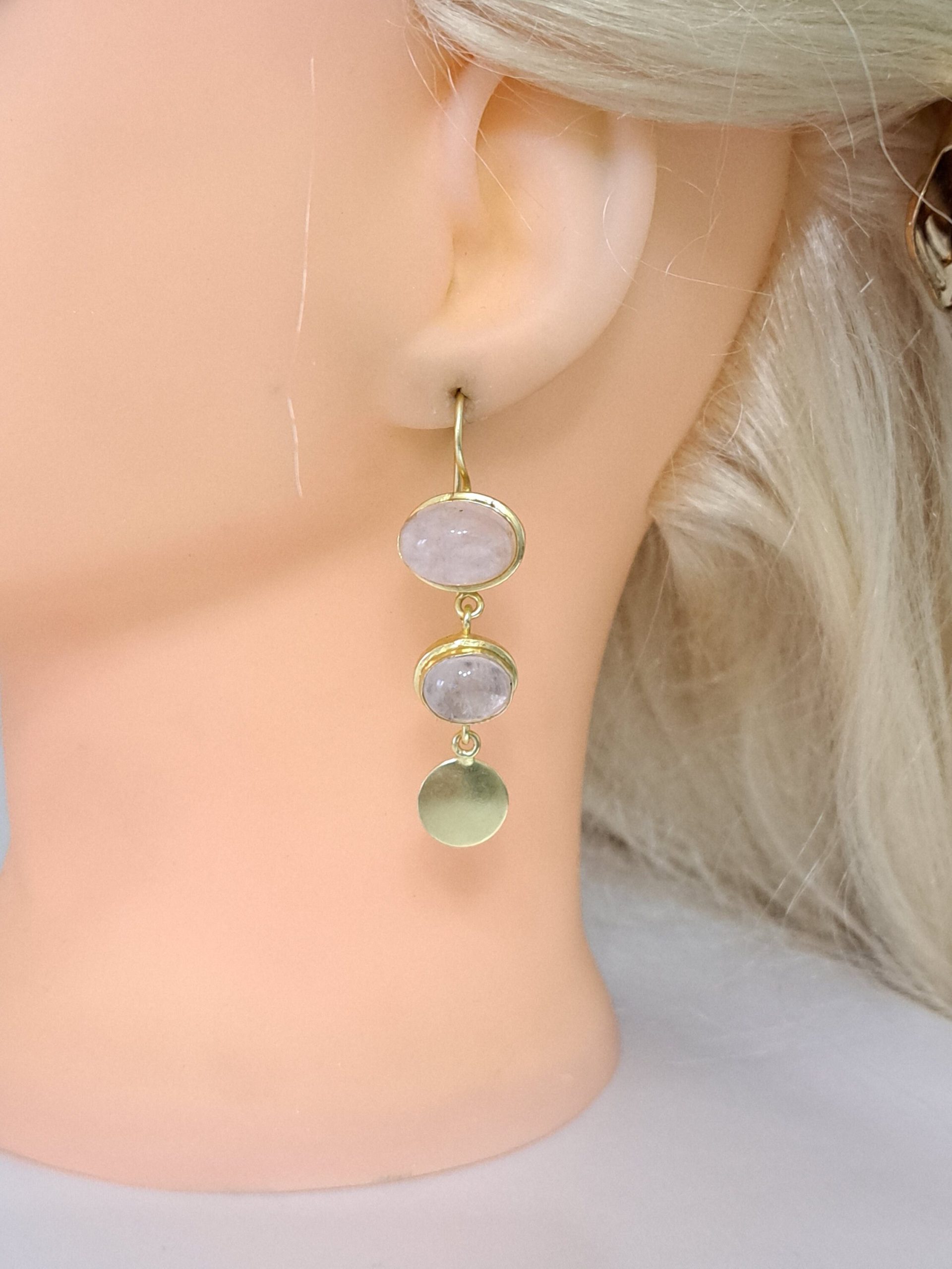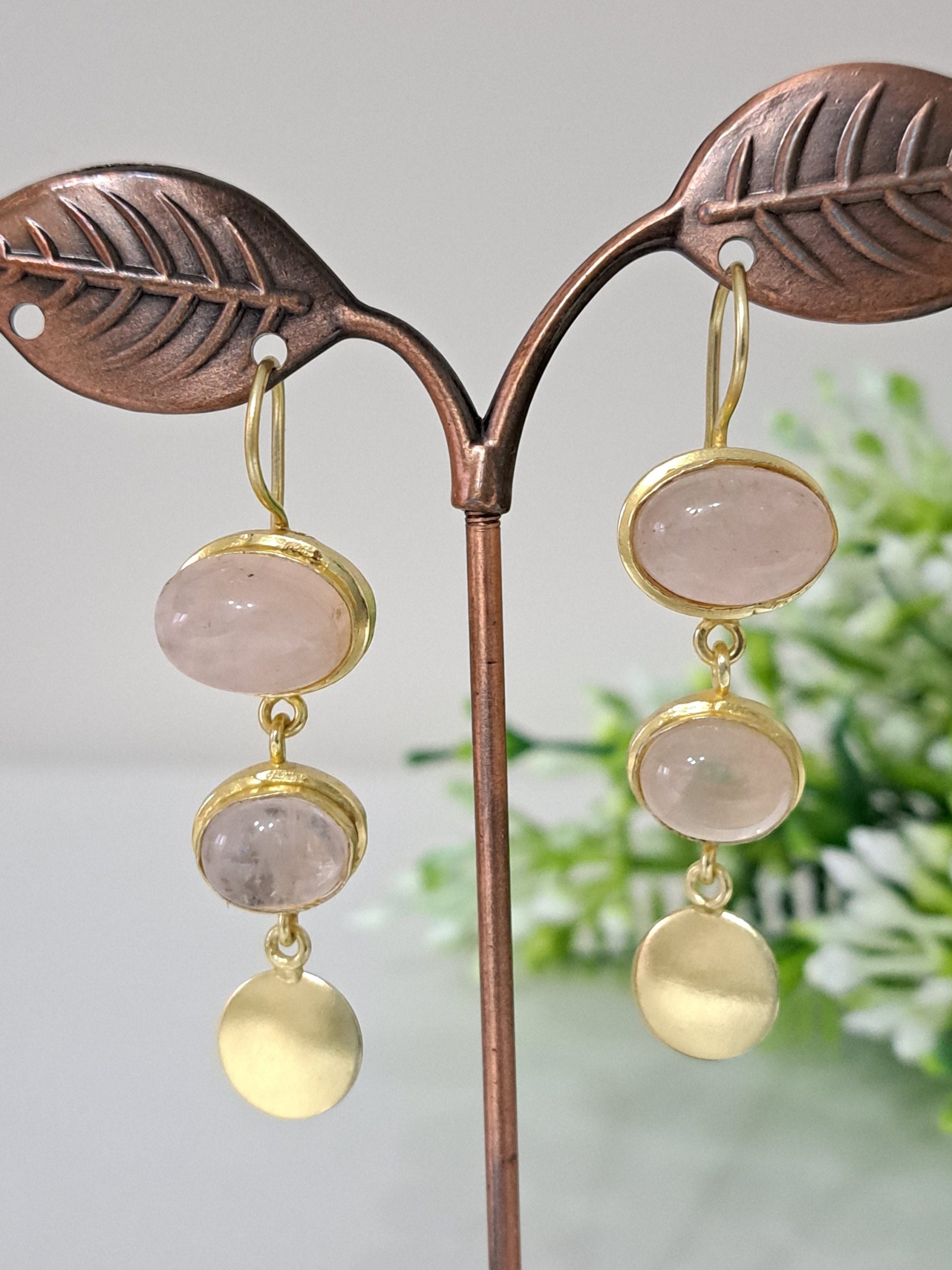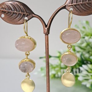 Orecchini pietre dure quarzo rosa, orecchini monete ottone