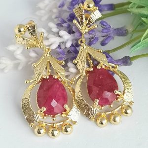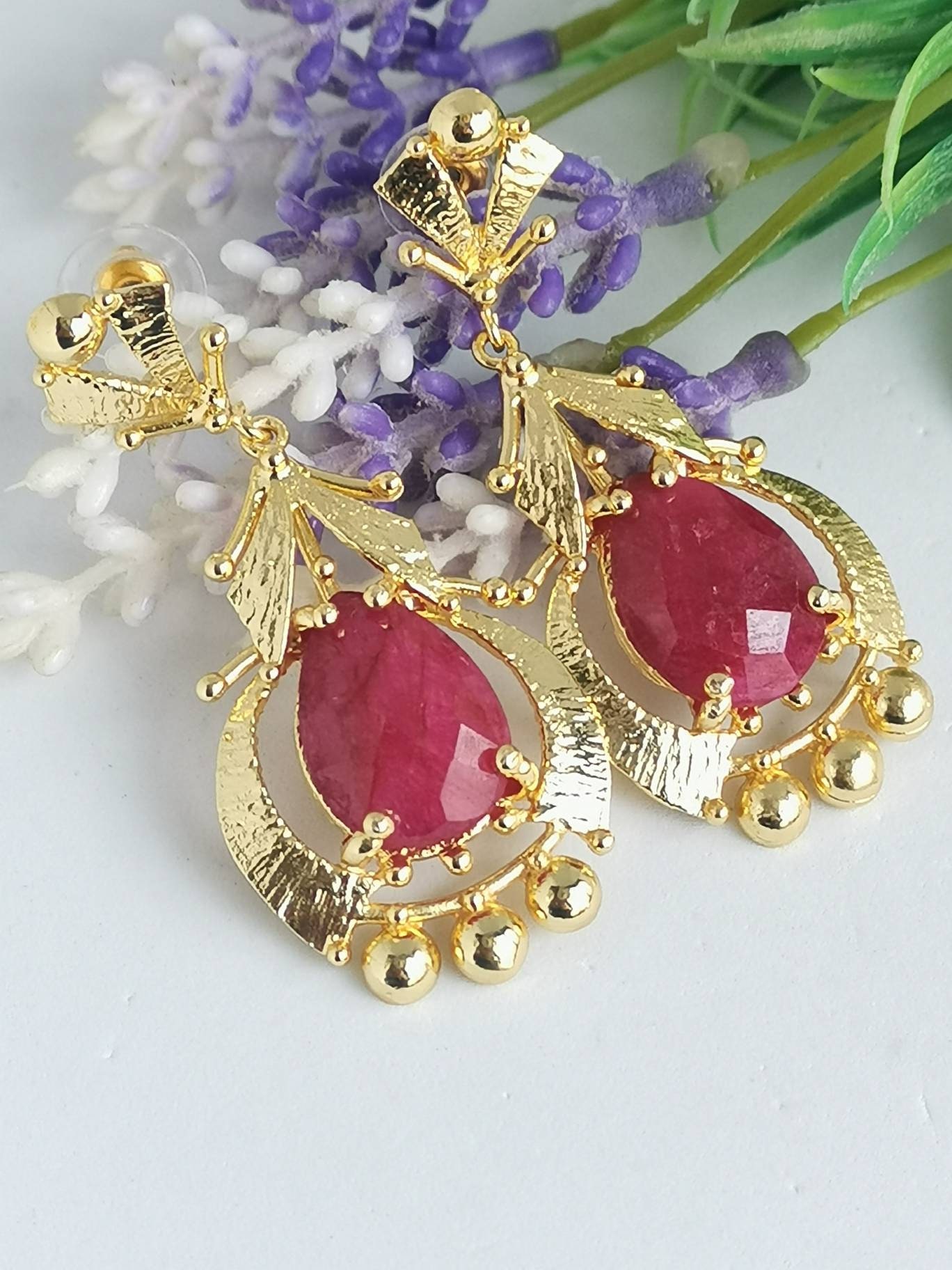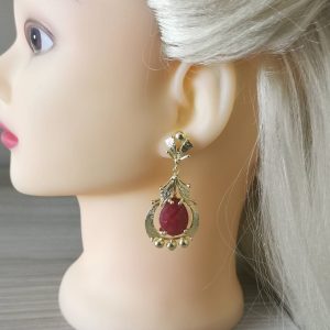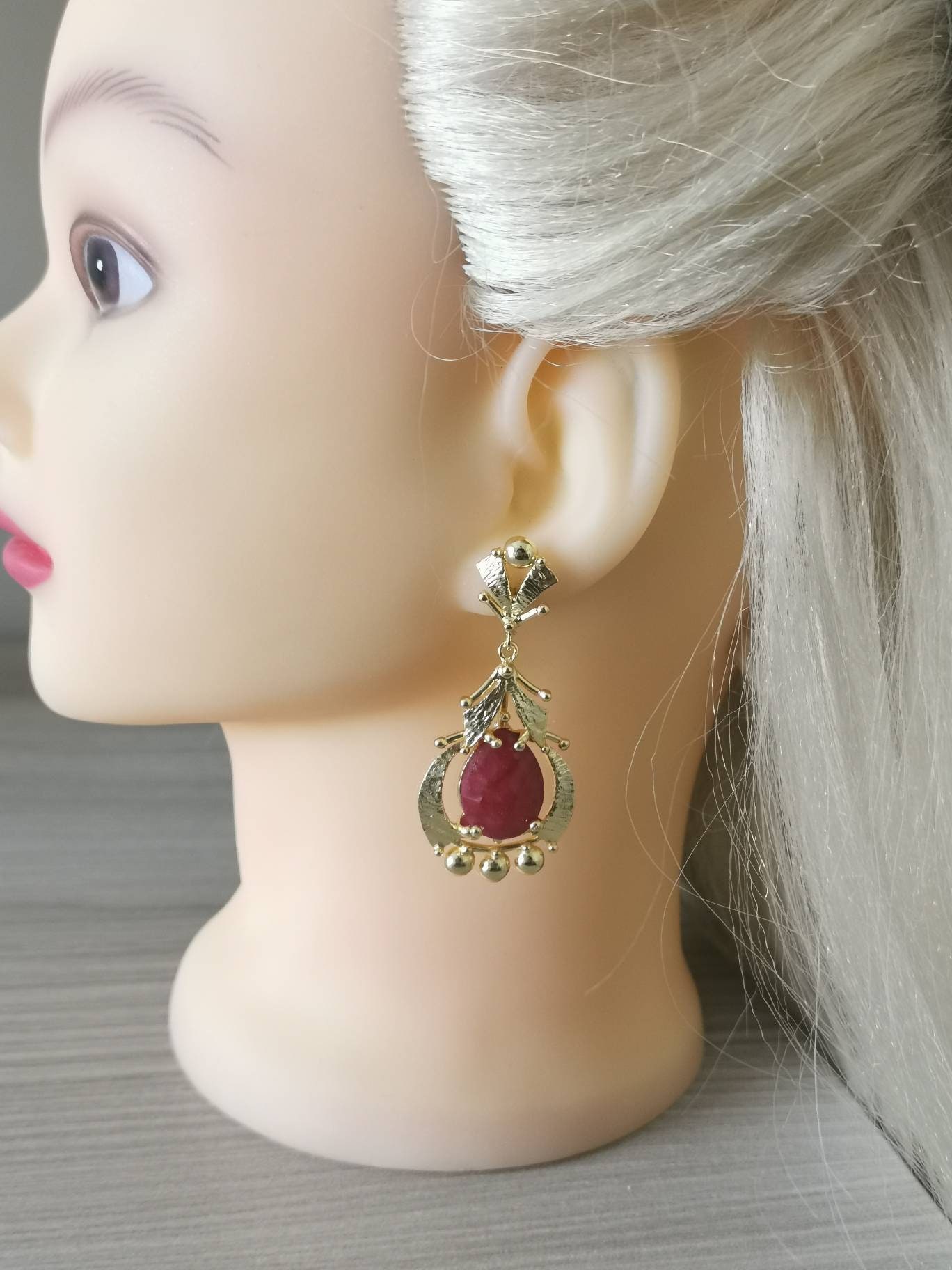 Orecchini artigianali con pietre dure sfaccettate radice di rubino con foglie e chiusure a perno con farfallina in ottone dorato .