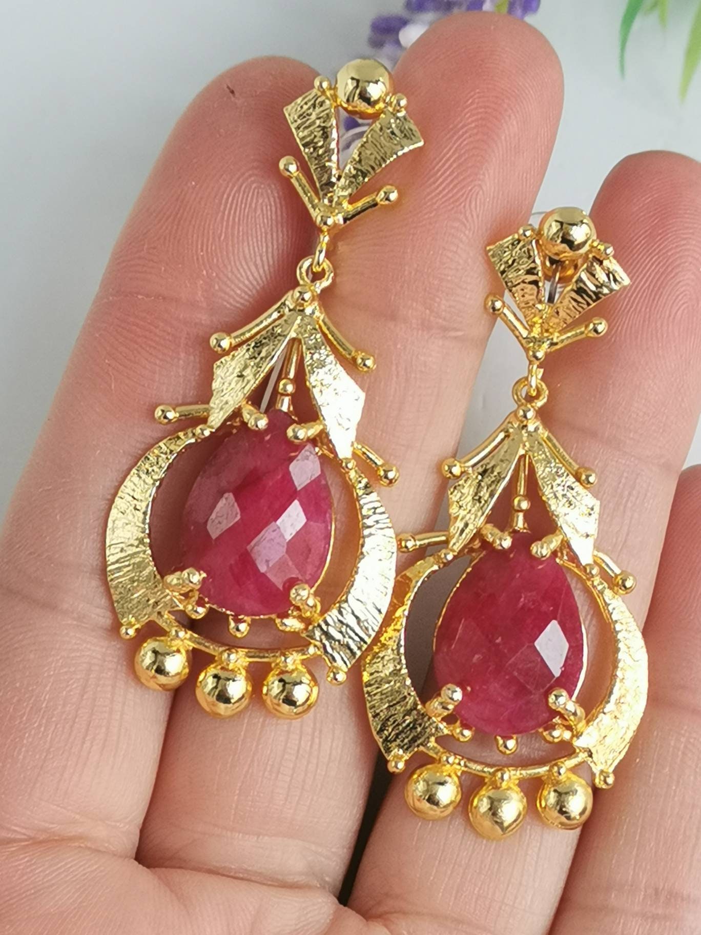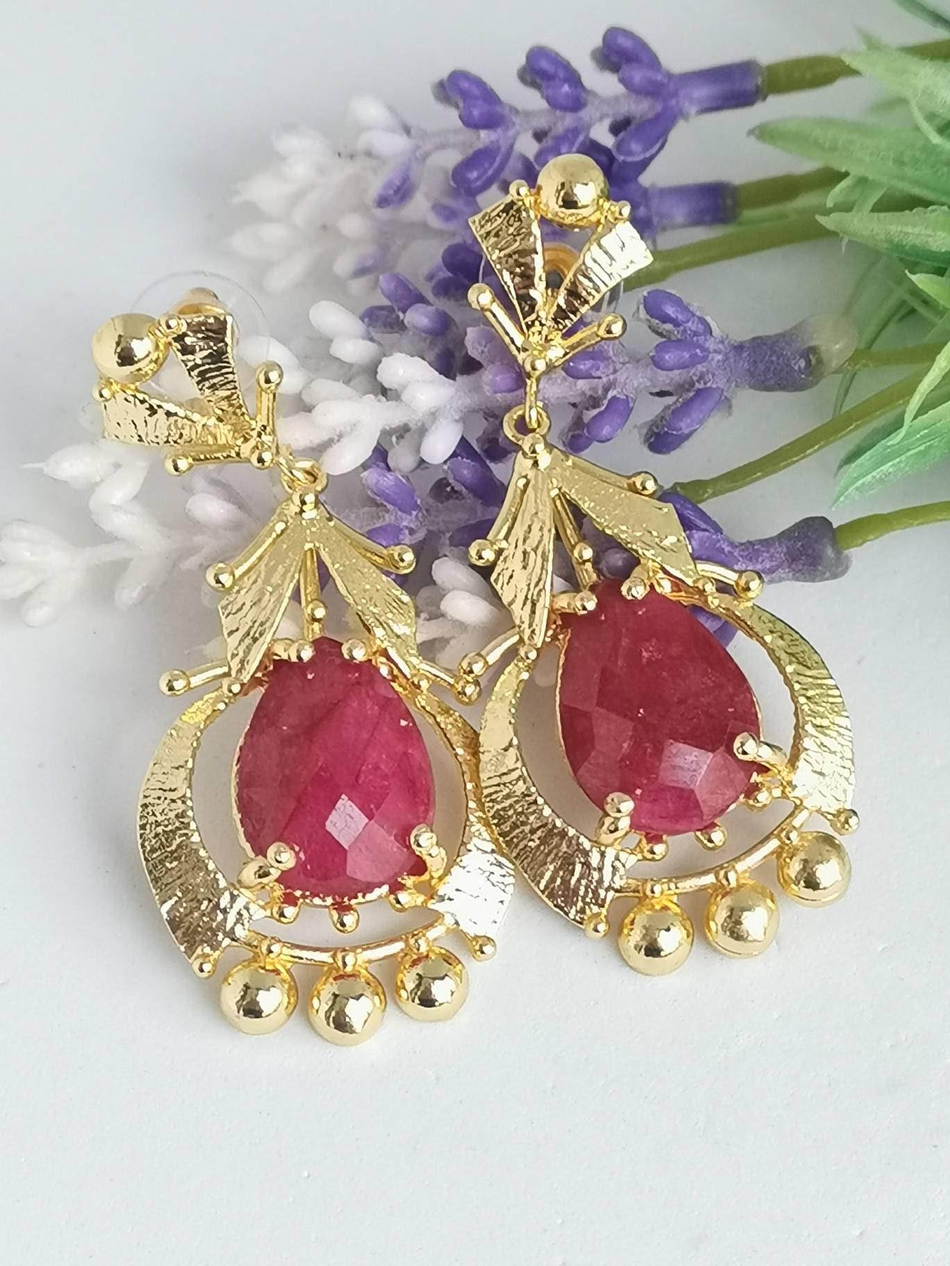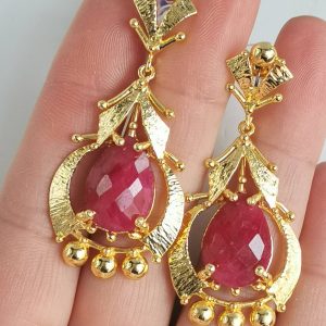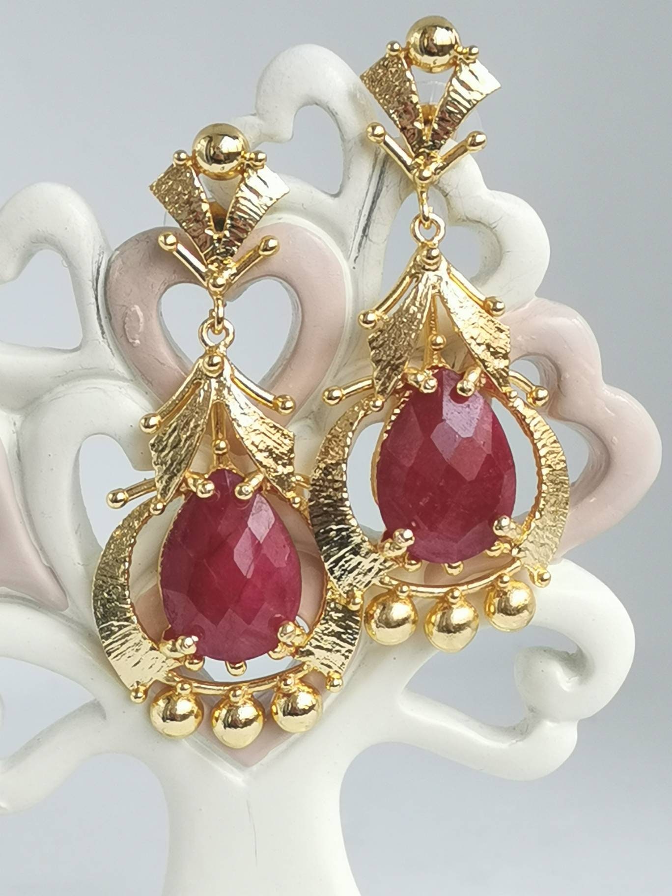 Orecchini artigianali con pietre dure sfaccettate radice di rubino con foglie e chiusure a perno con farfallina in ottone dorato .