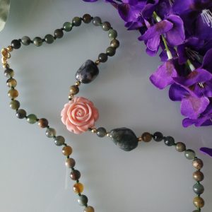 Collana pietre dure diaspro verde con rosa imitazione corallo