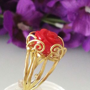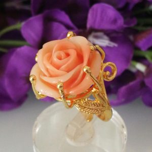 Anello rosa corallo rosso naturale. Anello maxi. Anello stile Liberty.
