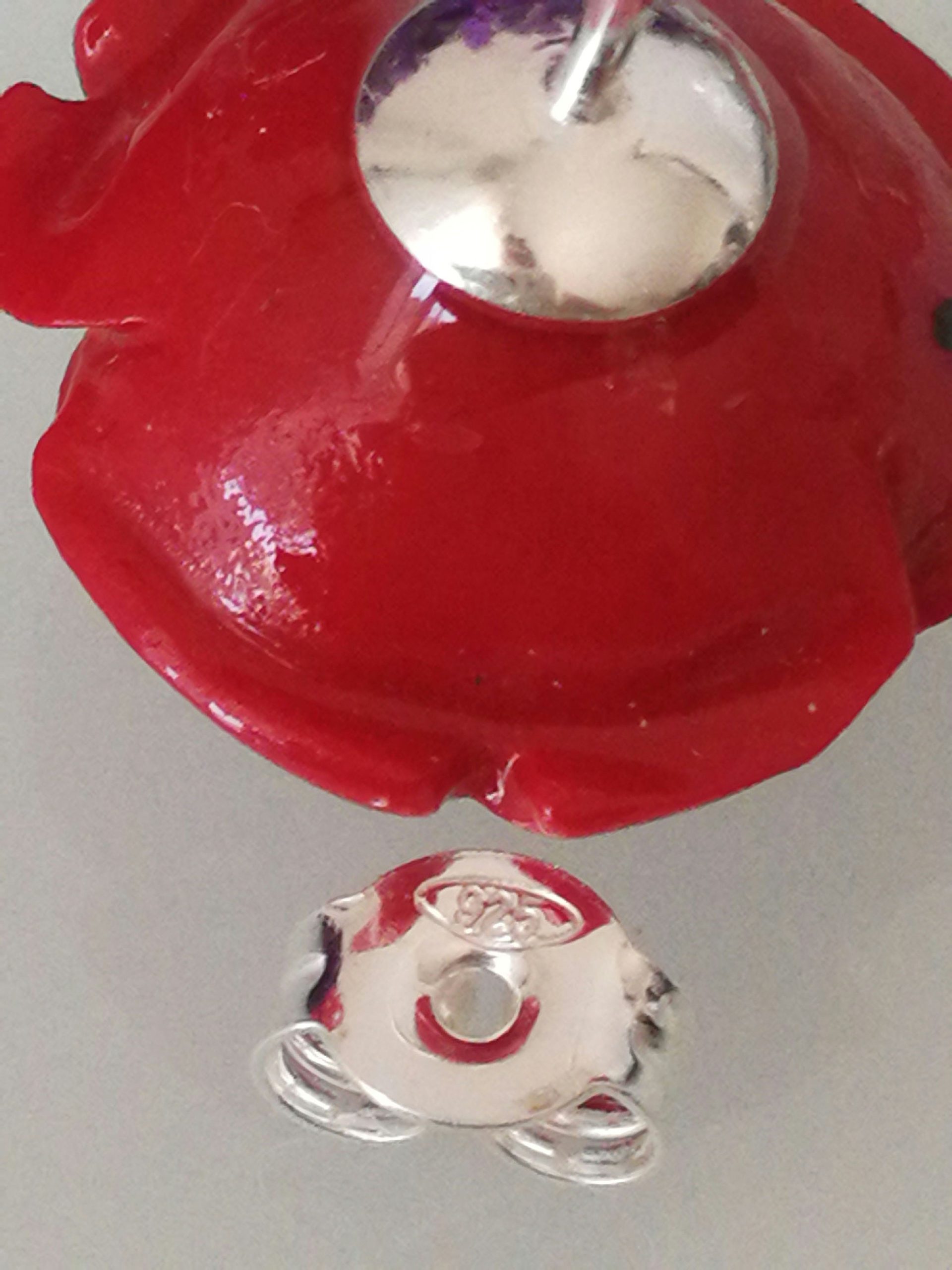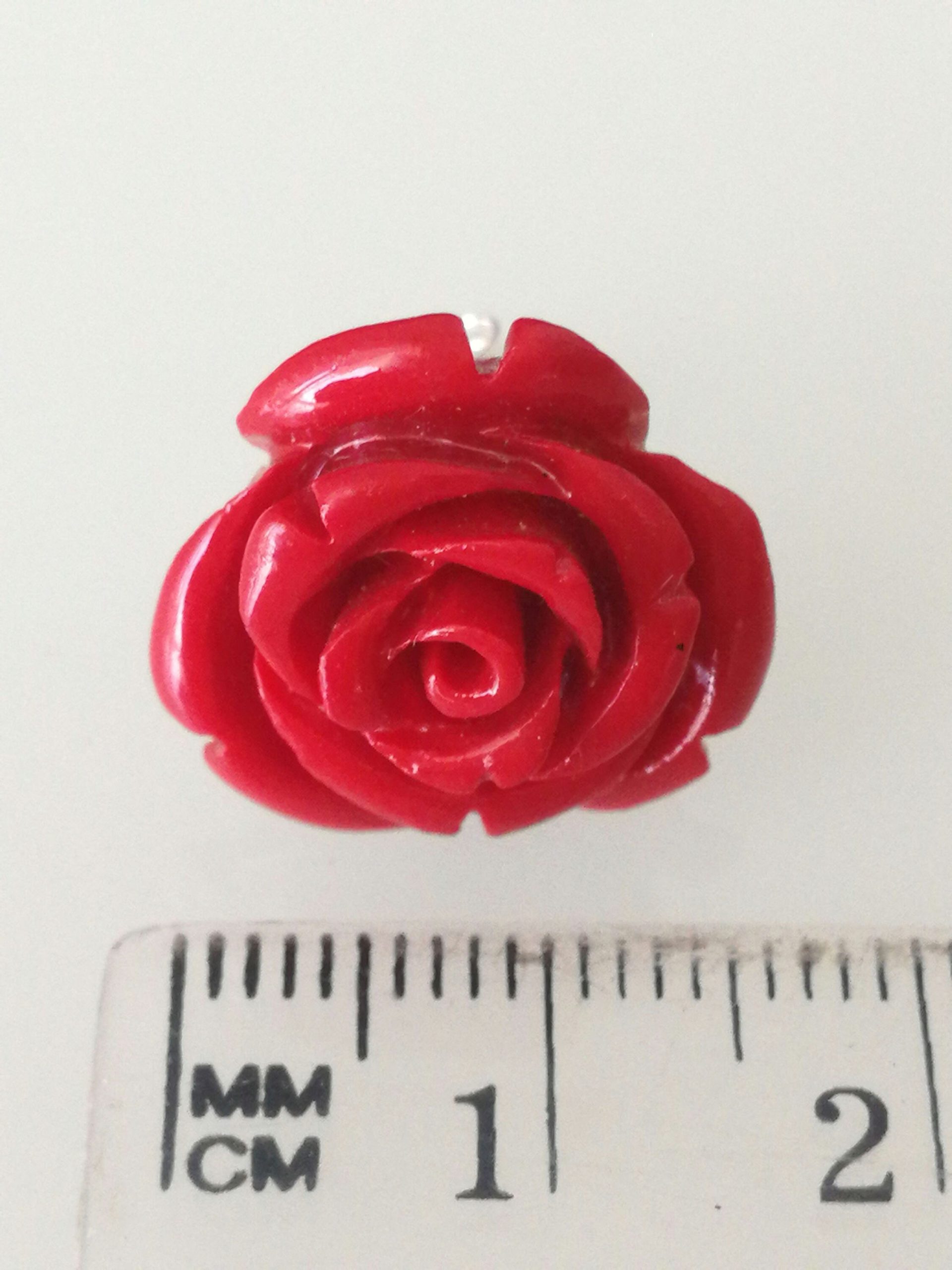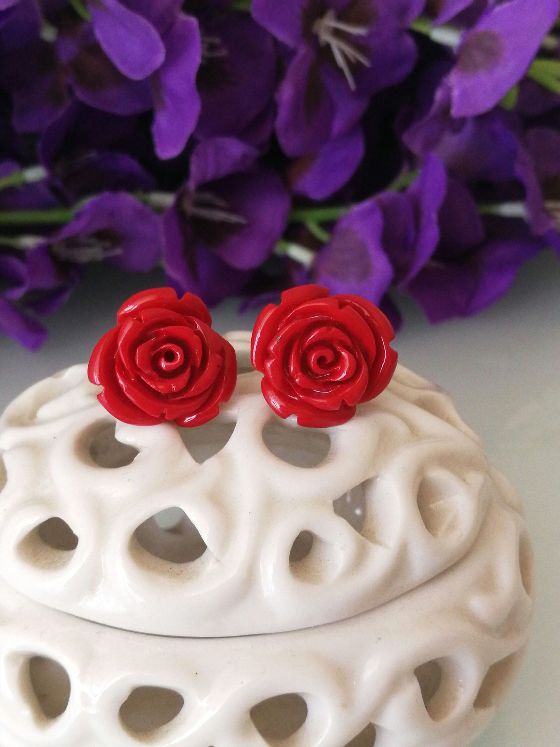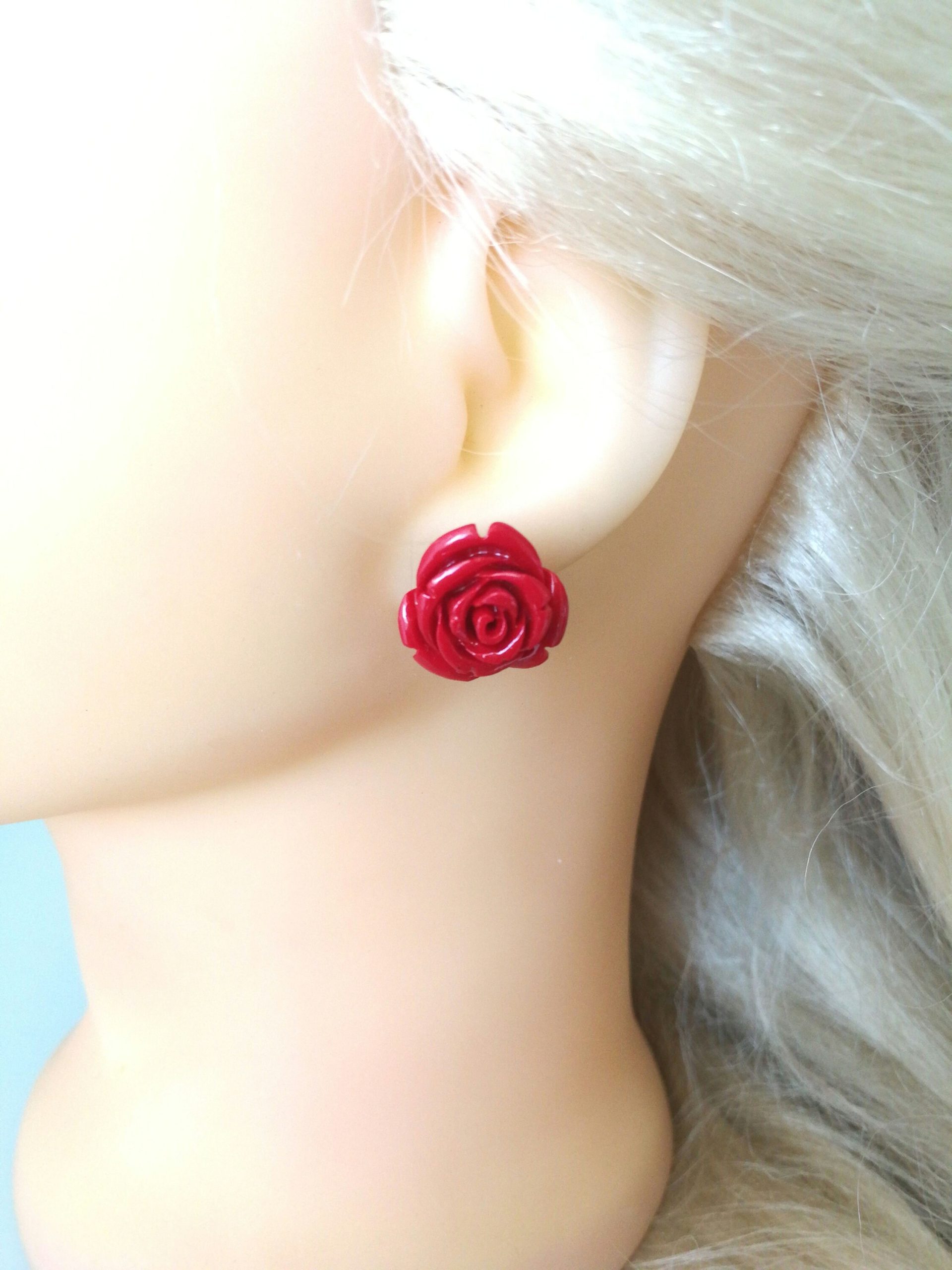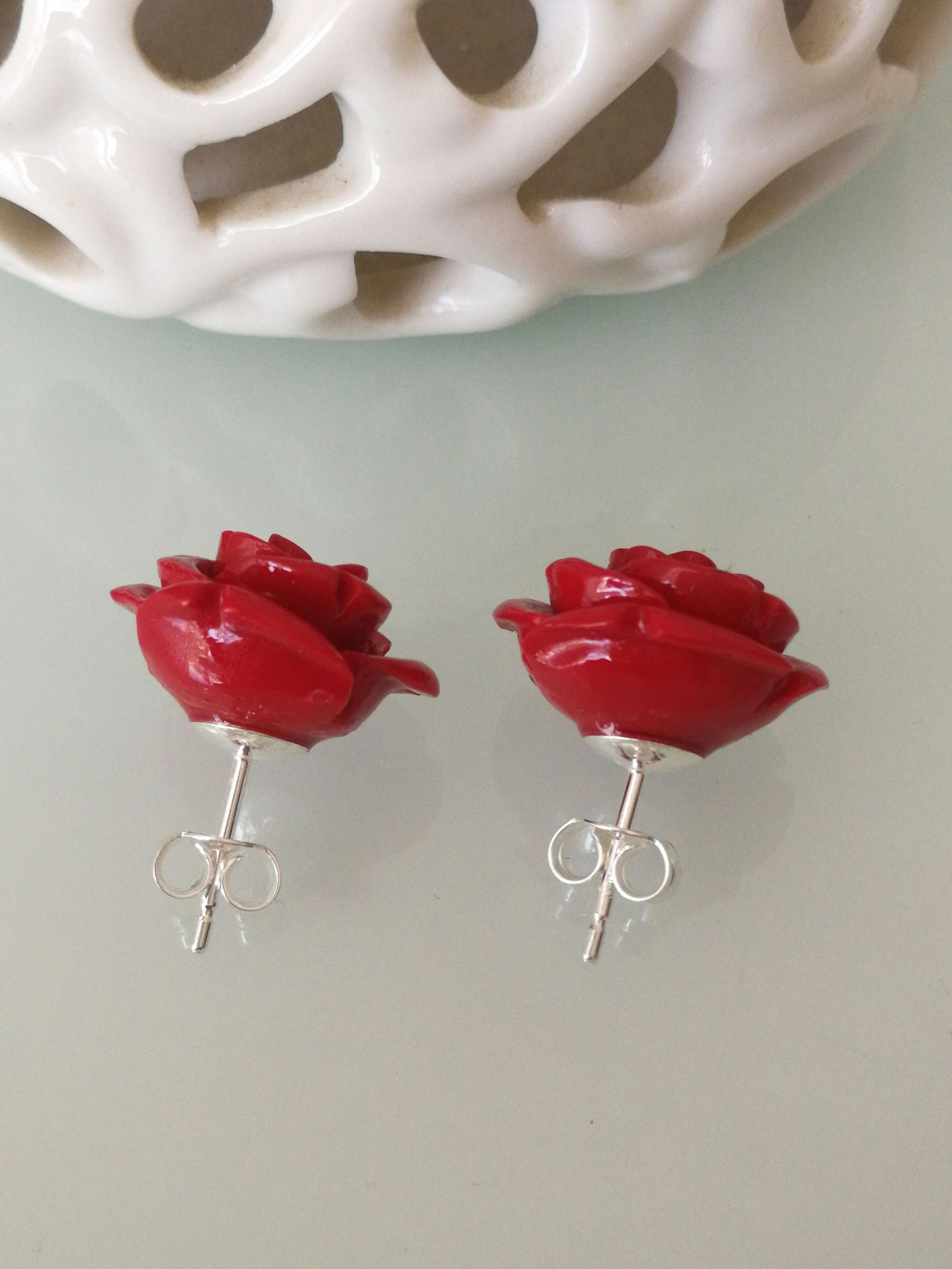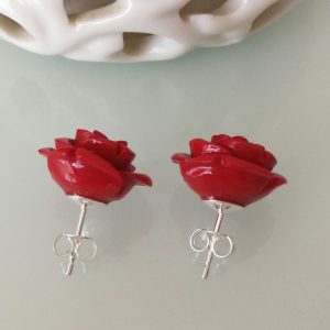 Stupendi orecchini a forma di rosa rossa in composto lavorato, montatura a perno in argento 925 . Misura diametro della rosa 1,5 cm circolare. Con scatola regalo.Non è corallo naturale.