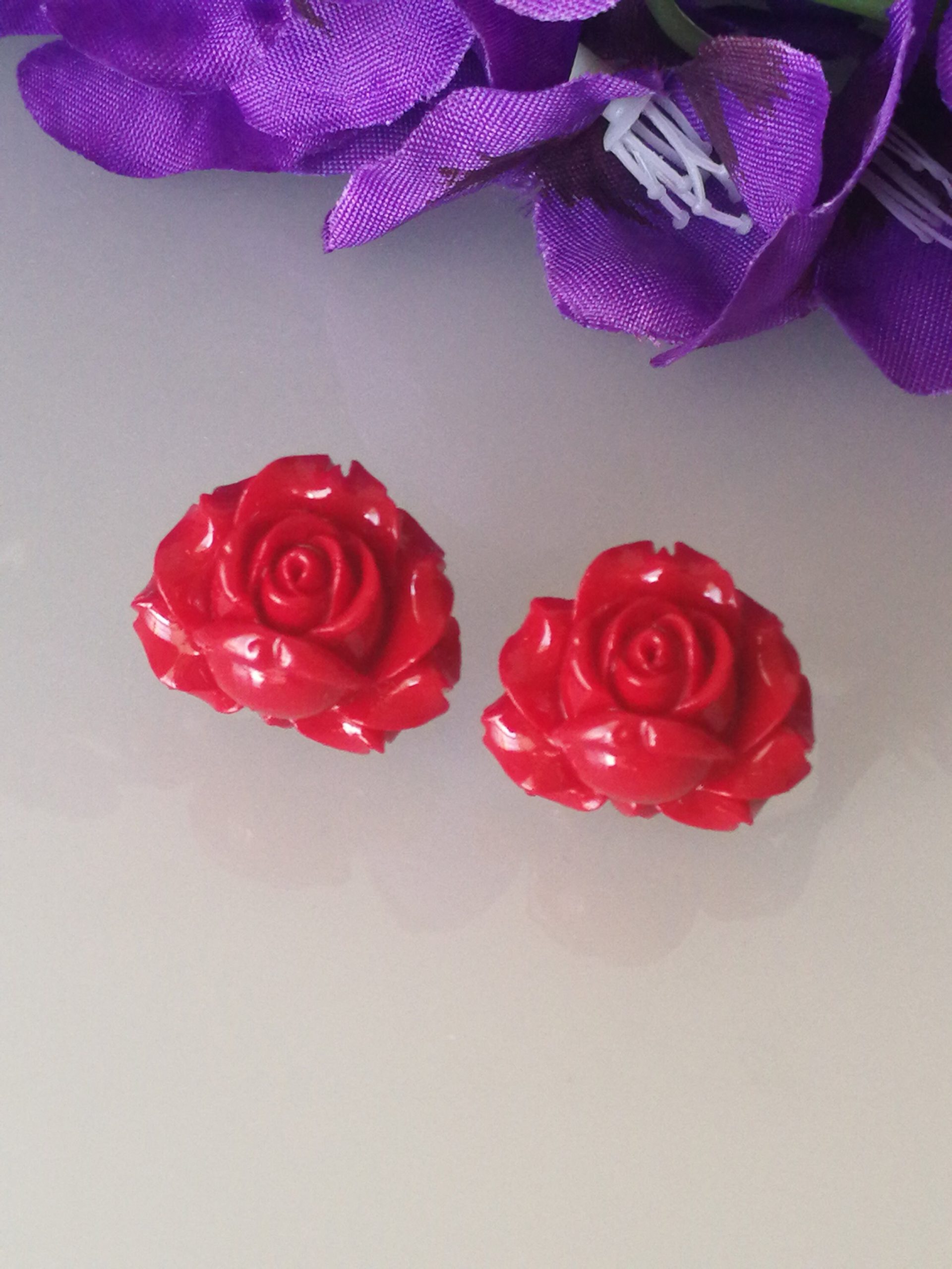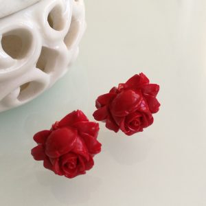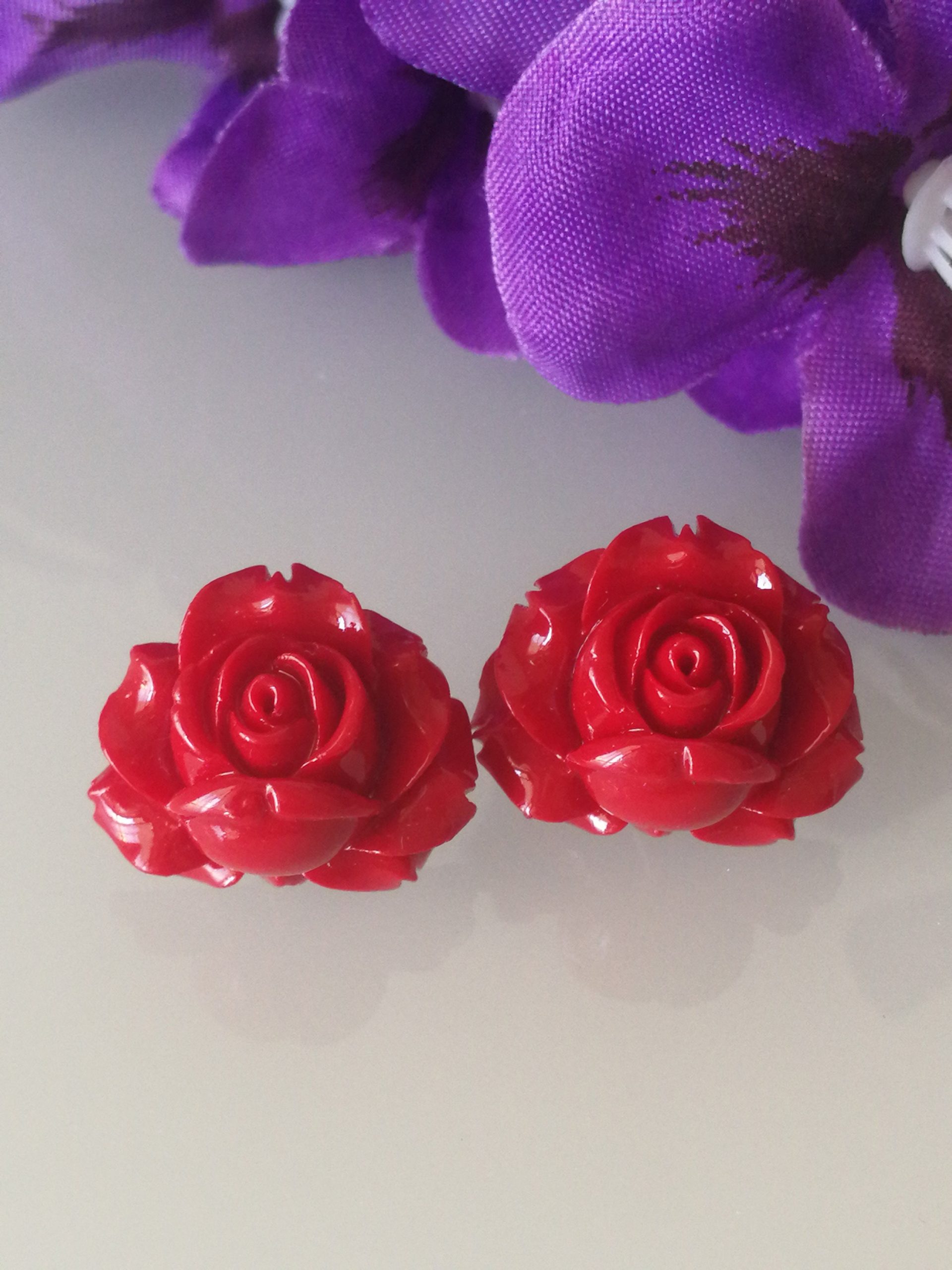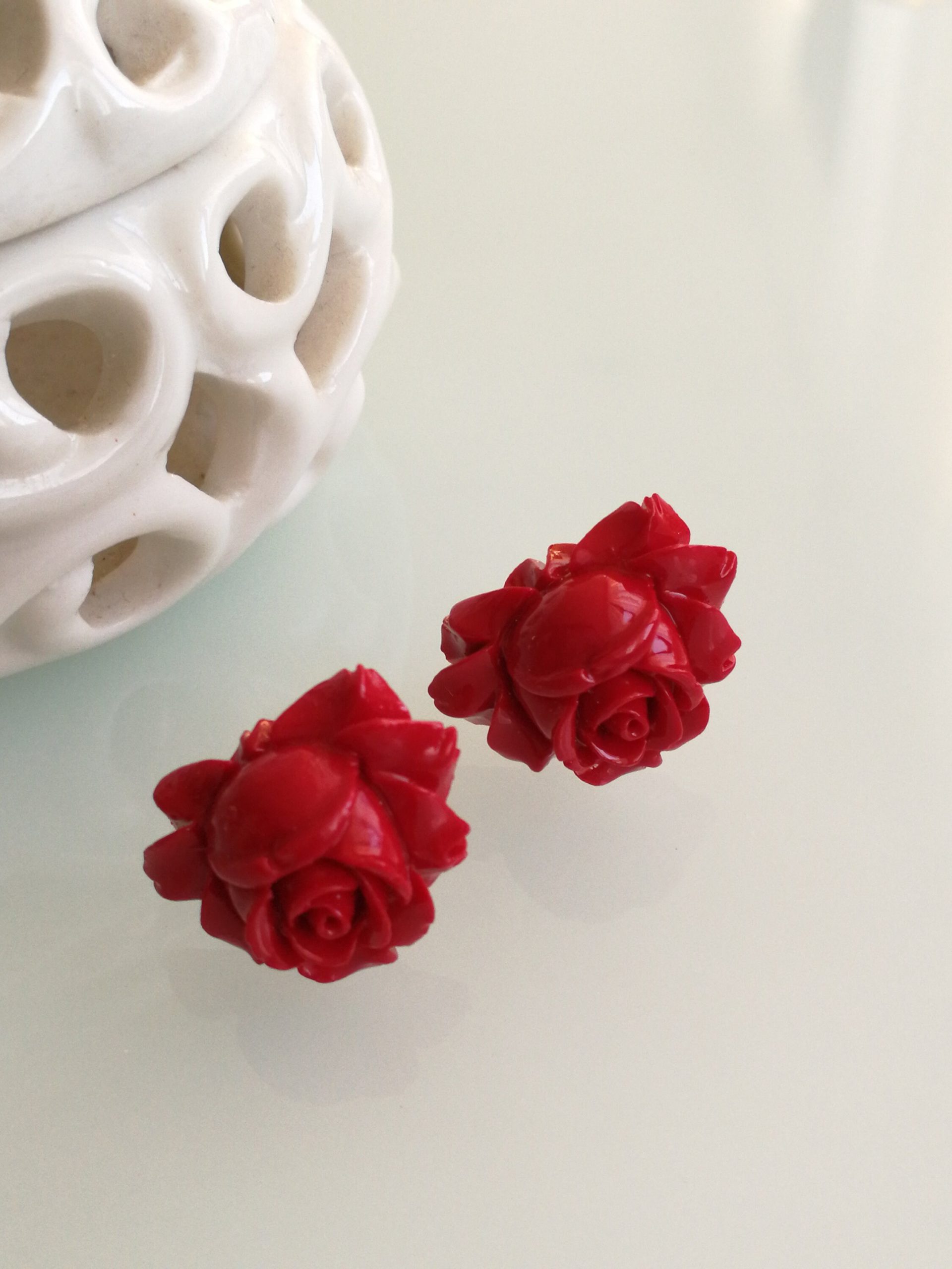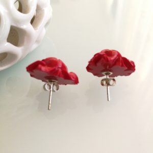 Stupendi orecchini a forma di rosa rossa in composto lavorato, montatura a perno argento 925 . Misura della rosa 1,5 x 1 cm. Con scatola regalo.Non è corallo naturale.
