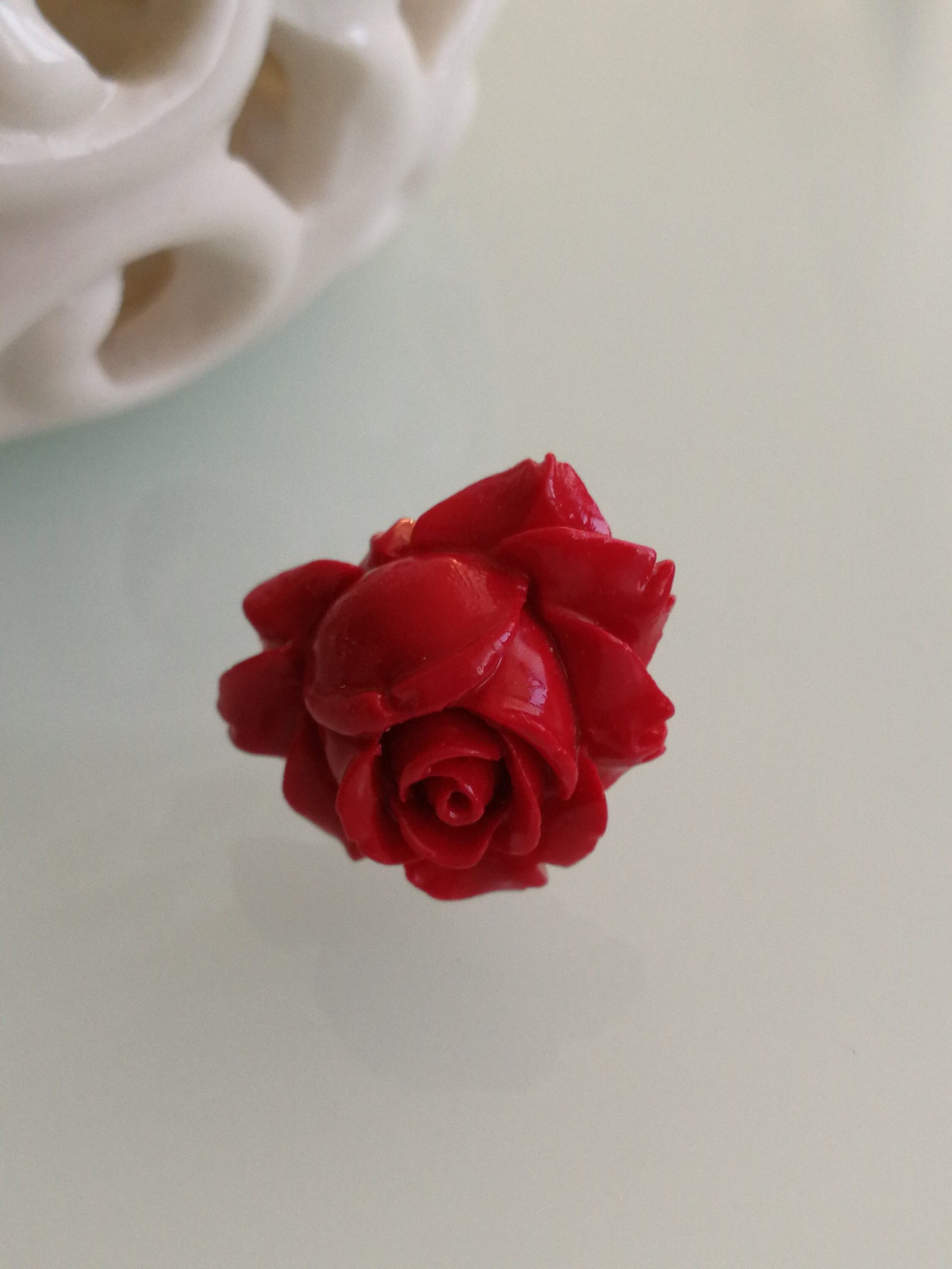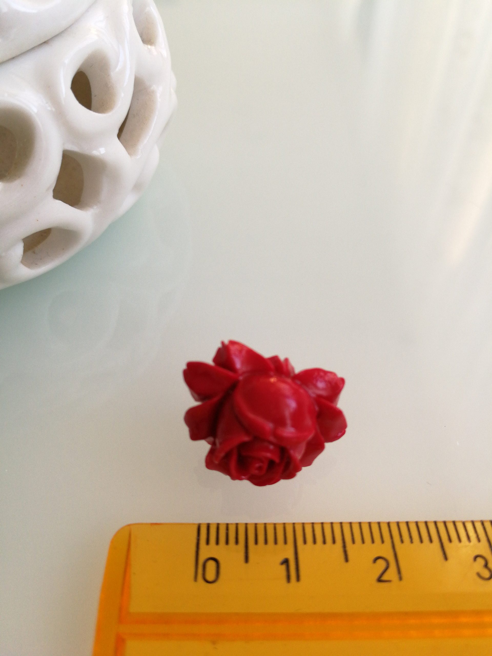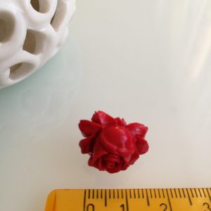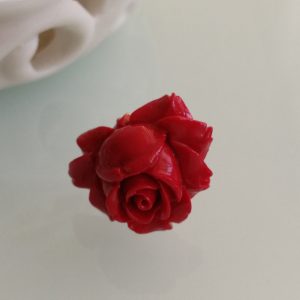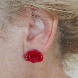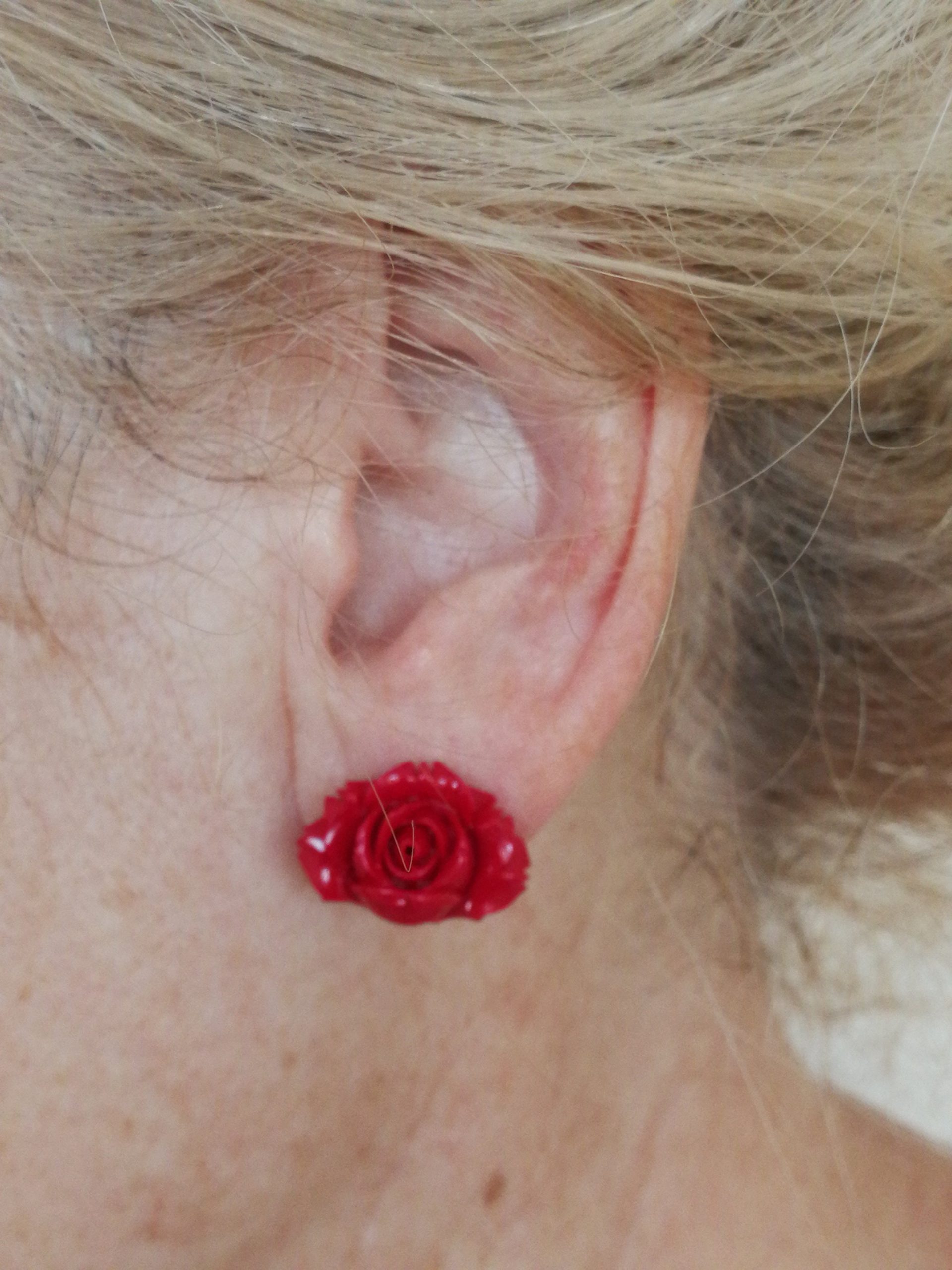 Stupendi orecchini a forma di rosa rossa in composto lavorato, montatura a perno argento 925 . Misura della rosa 1,5 x 1 cm. Con scatola regalo.Non è corallo naturale.