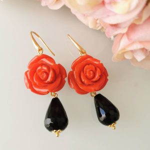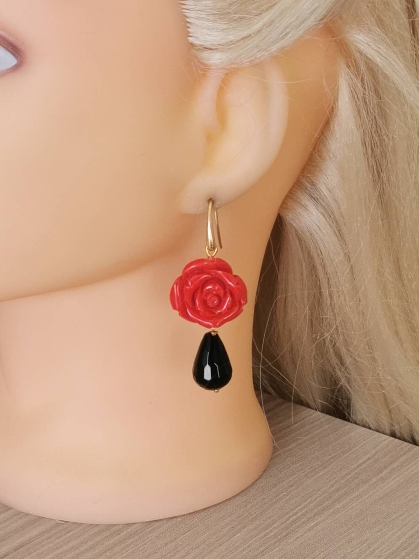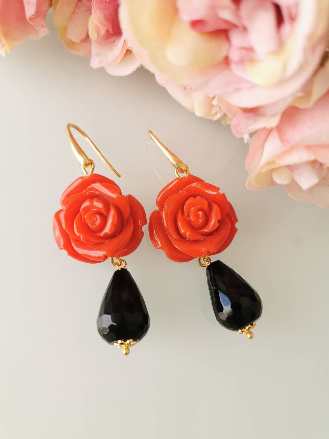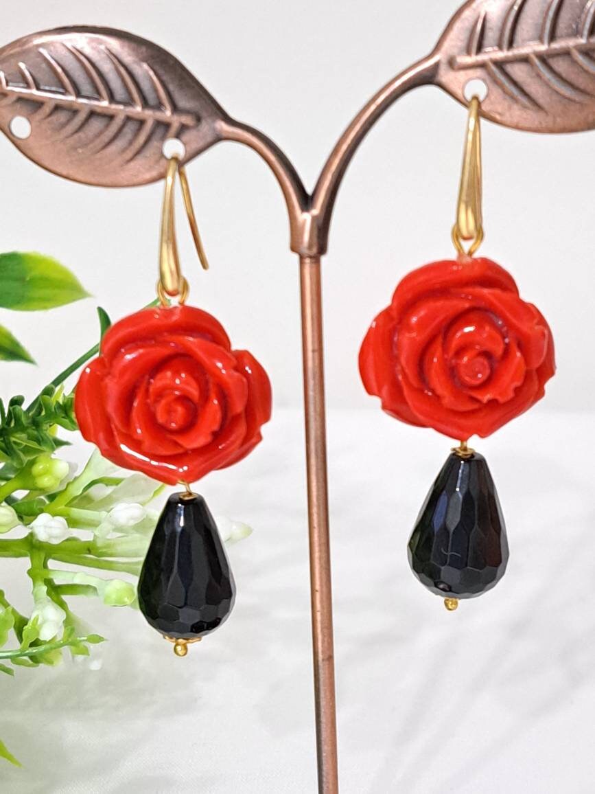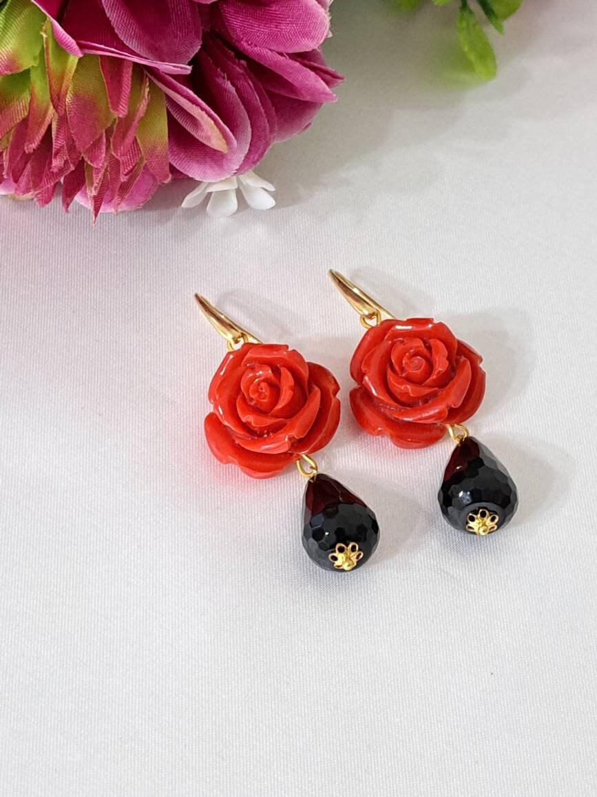 Orecchini rose corallo e gocce onice , orecchini argento 925 , gioielli italiani