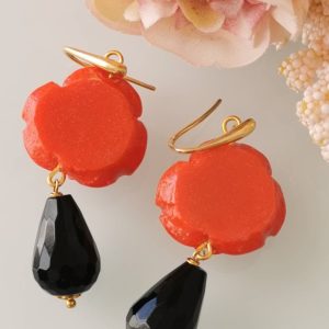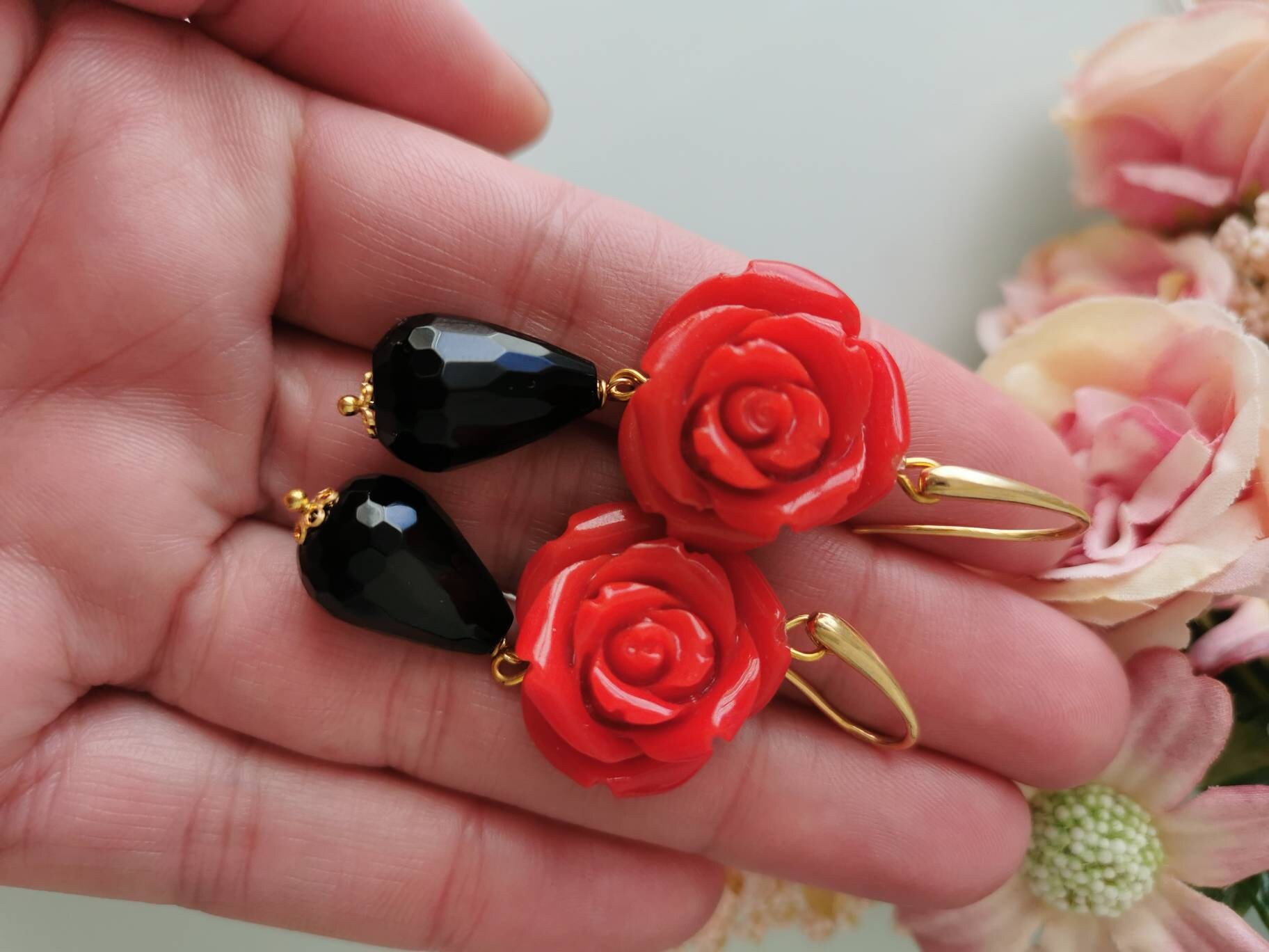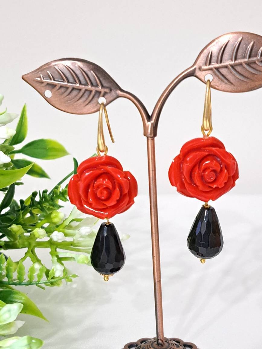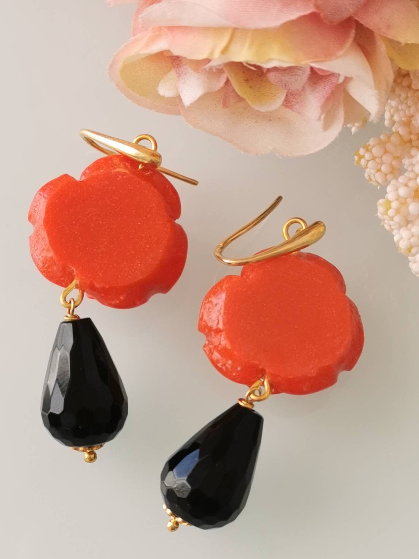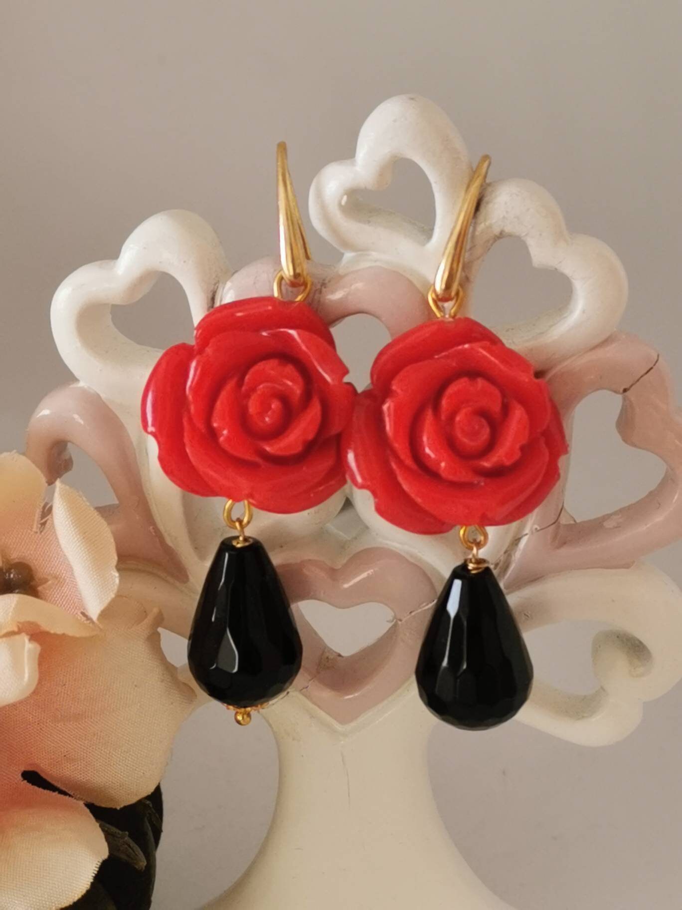 Orecchini rose corallo e gocce onice , orecchini argento 925 , gioielli italiani