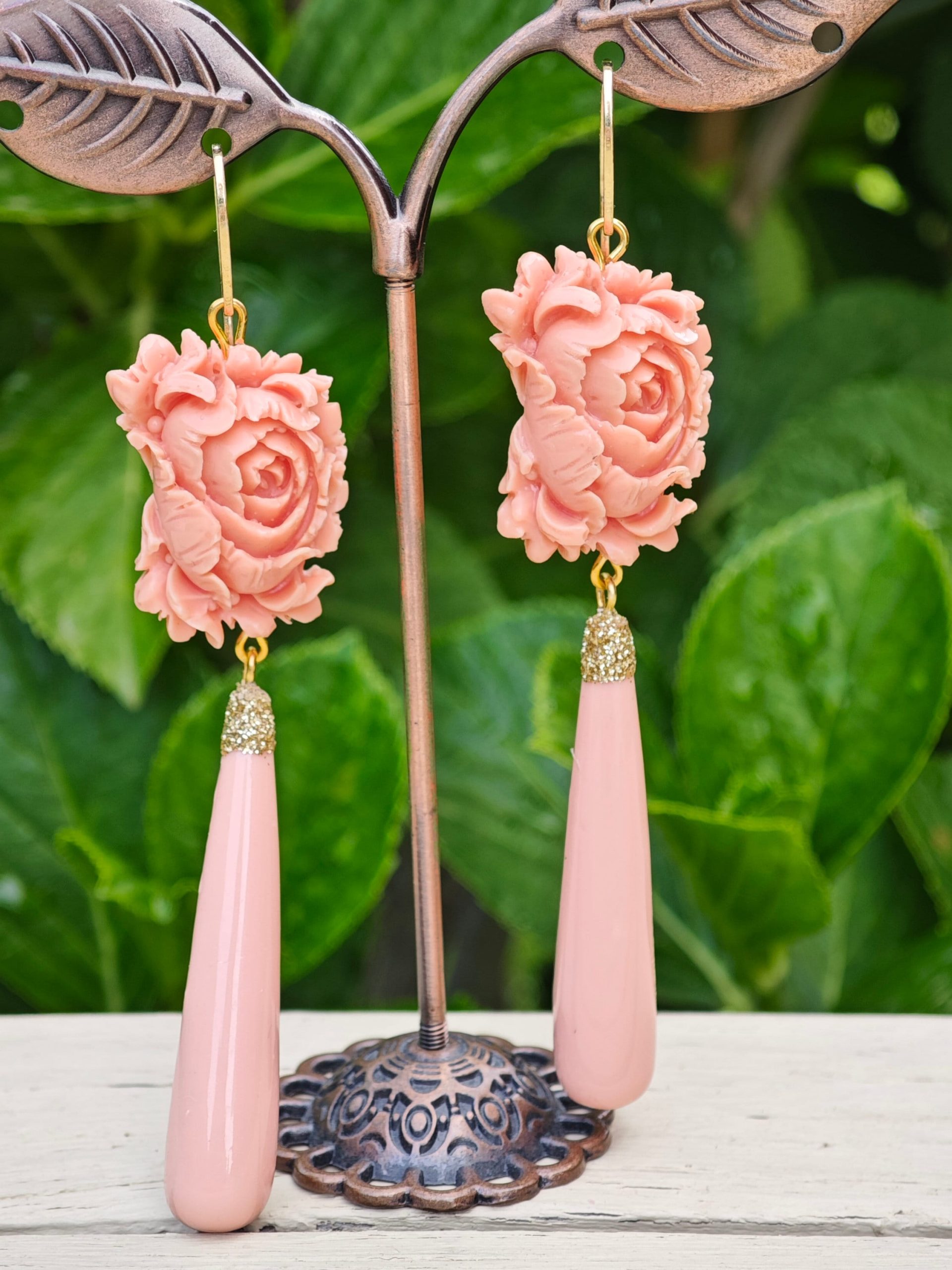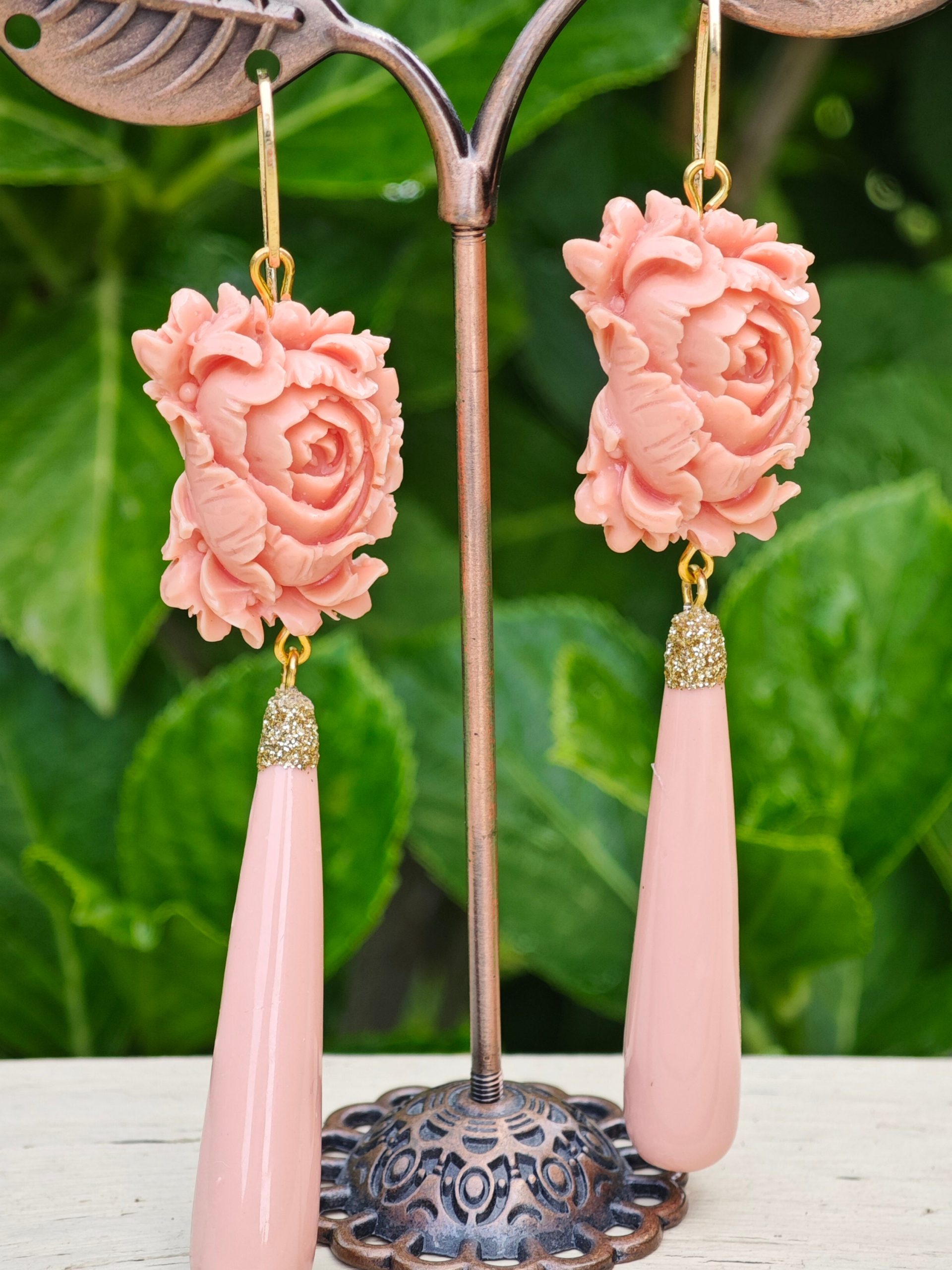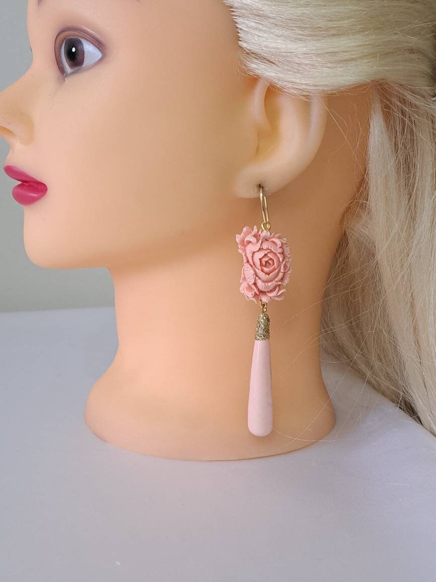 Orecchini pendenti con gocce e cammeo pasta corallo rosa composto imitazione realizzato a mano a Torre del greco raffigurante fiori , 2,5 cm dimensioni, chiusura a monachelle in argento 925.