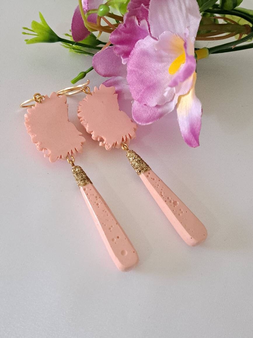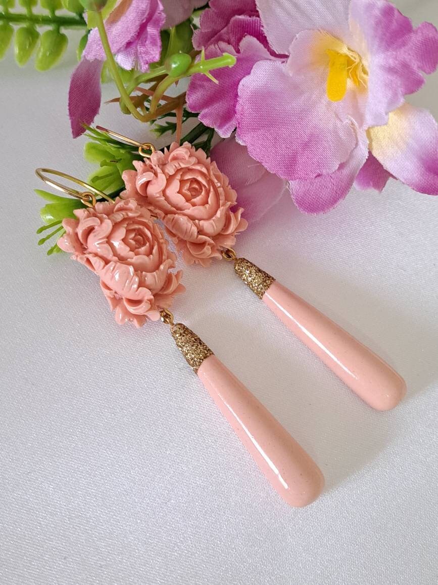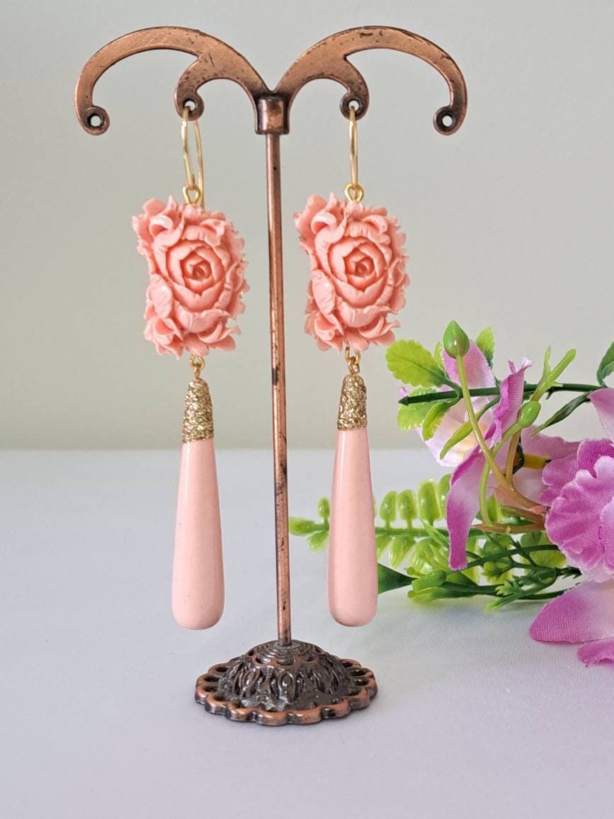 Orecchini pendenti con gocce e cammeo pasta corallo rosa composto imitazione realizzato a mano a Torre del greco raffigurante fiori , 2,5 cm dimensioni, chiusura a monachelle in argento 925.