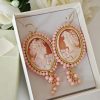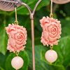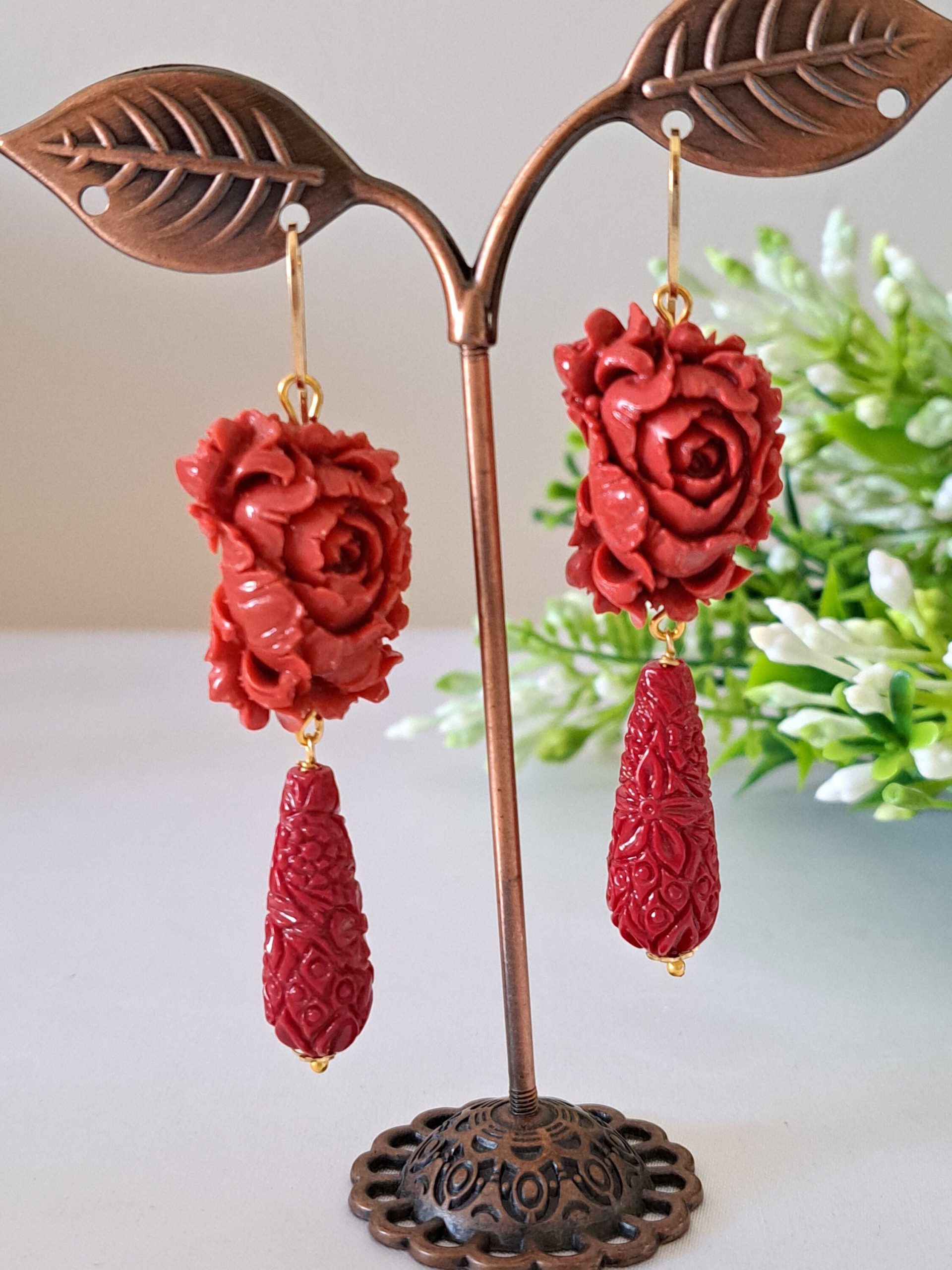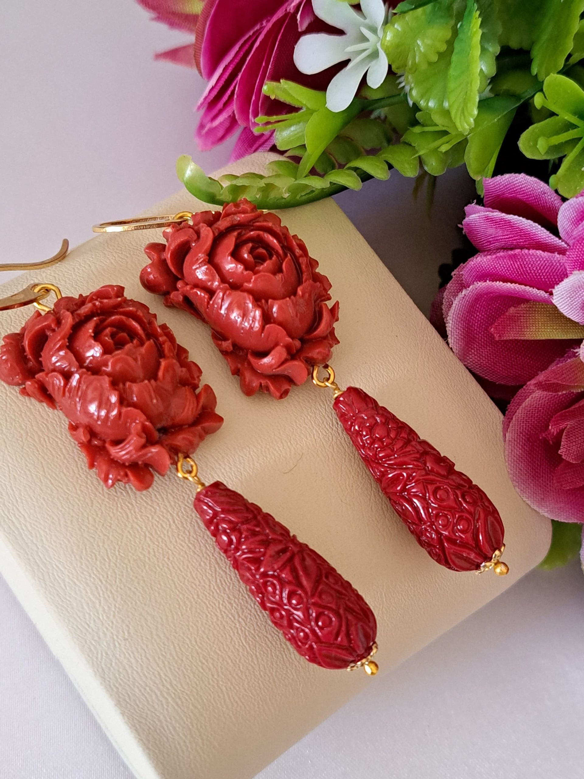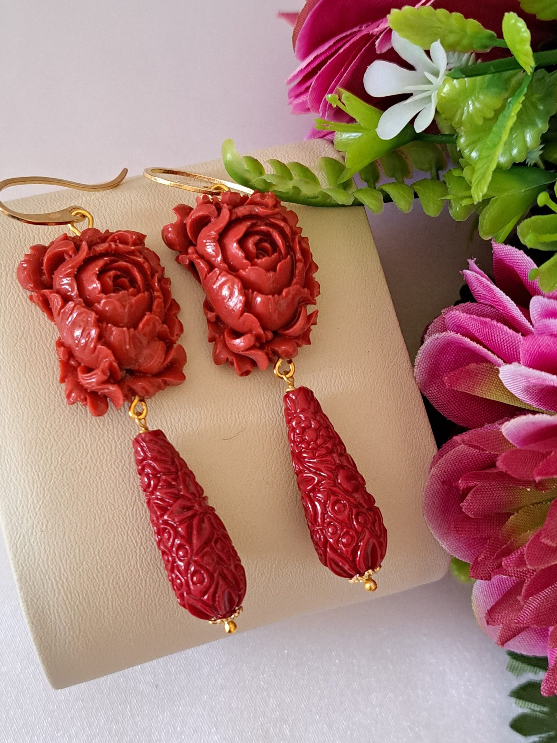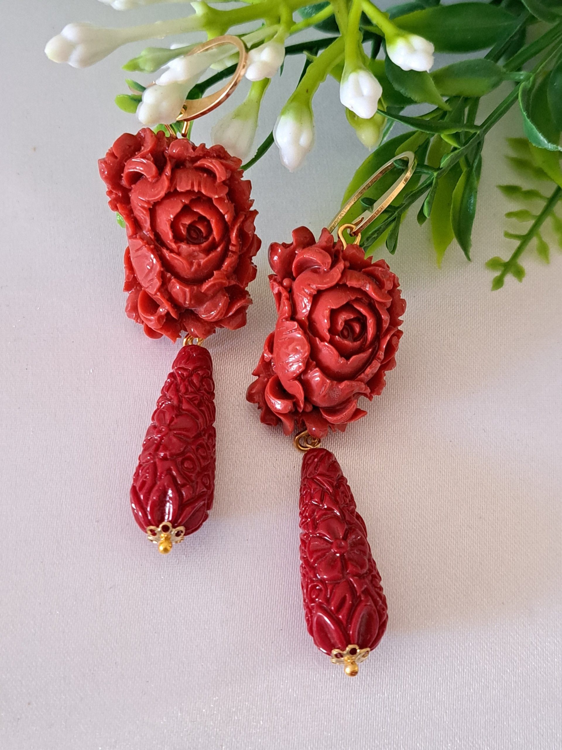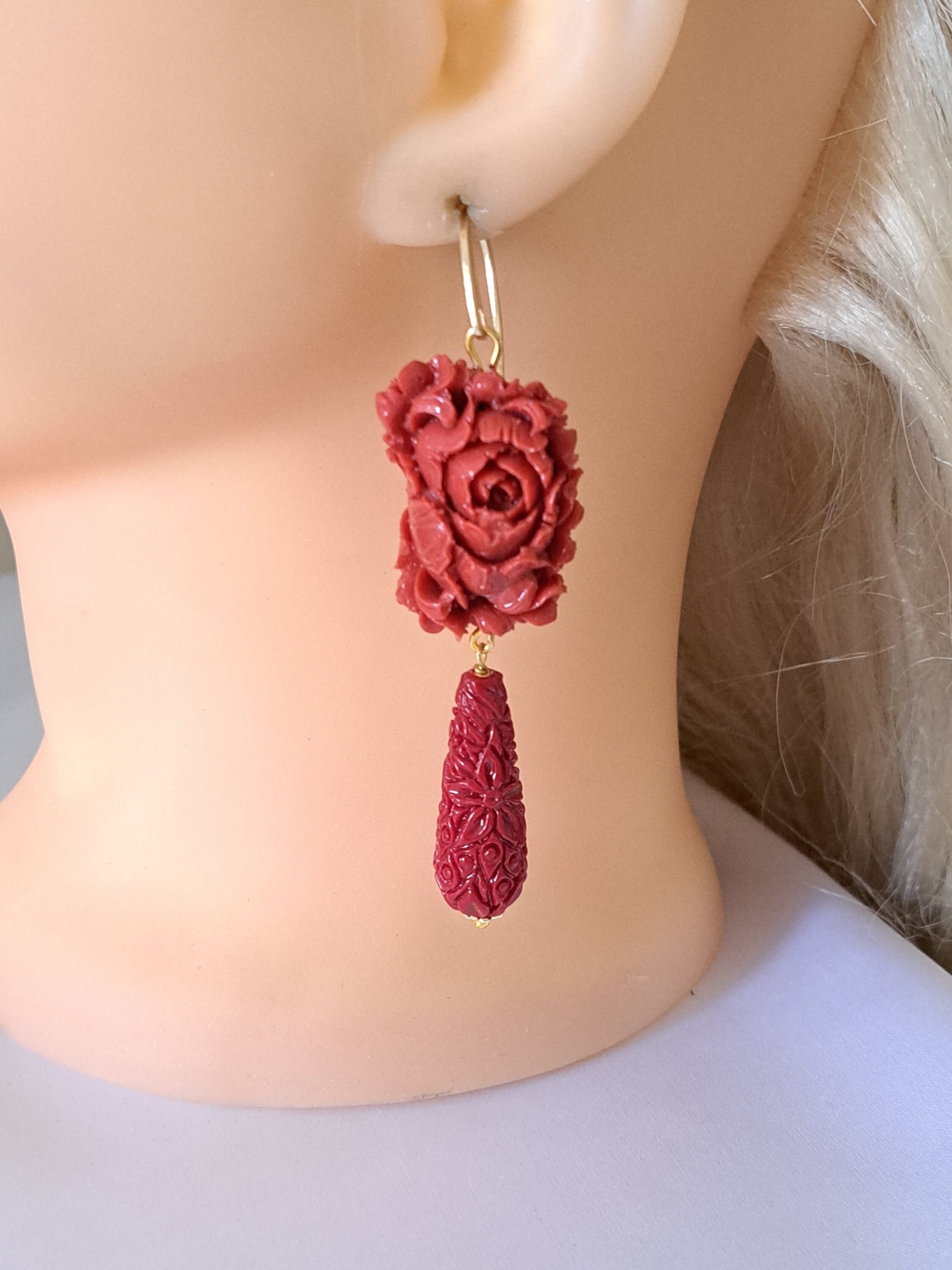 Orecchini pendenti con rose pasta corallo rosso composto realizzato a mano a Torre del greco raffigurante fiori , 2,5 cm dimensioni, gocce intagliate resina imitazione corallo rosso , chiusura a monachelle in argento 925.