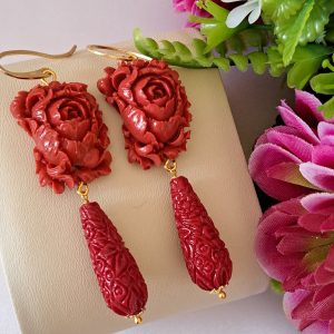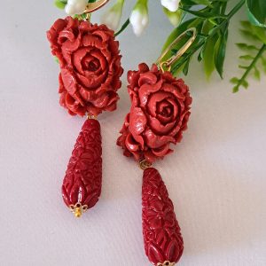 Orecchini rose corallo rosso, orecchini goccia corallo, orecchini argento 925 , gioielli italiani
