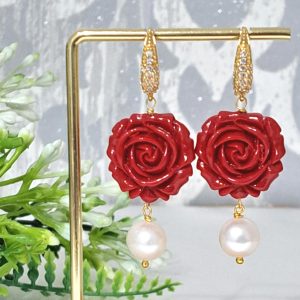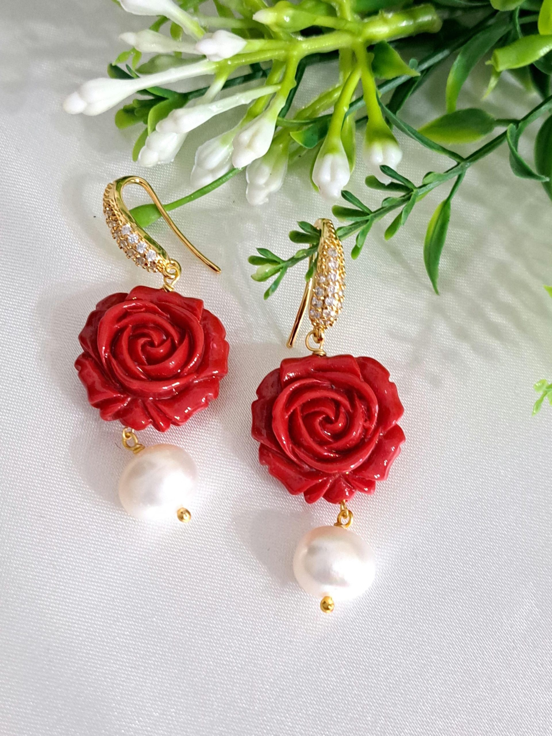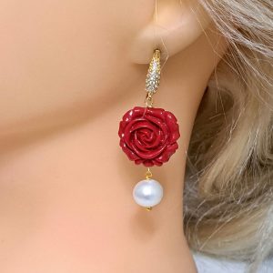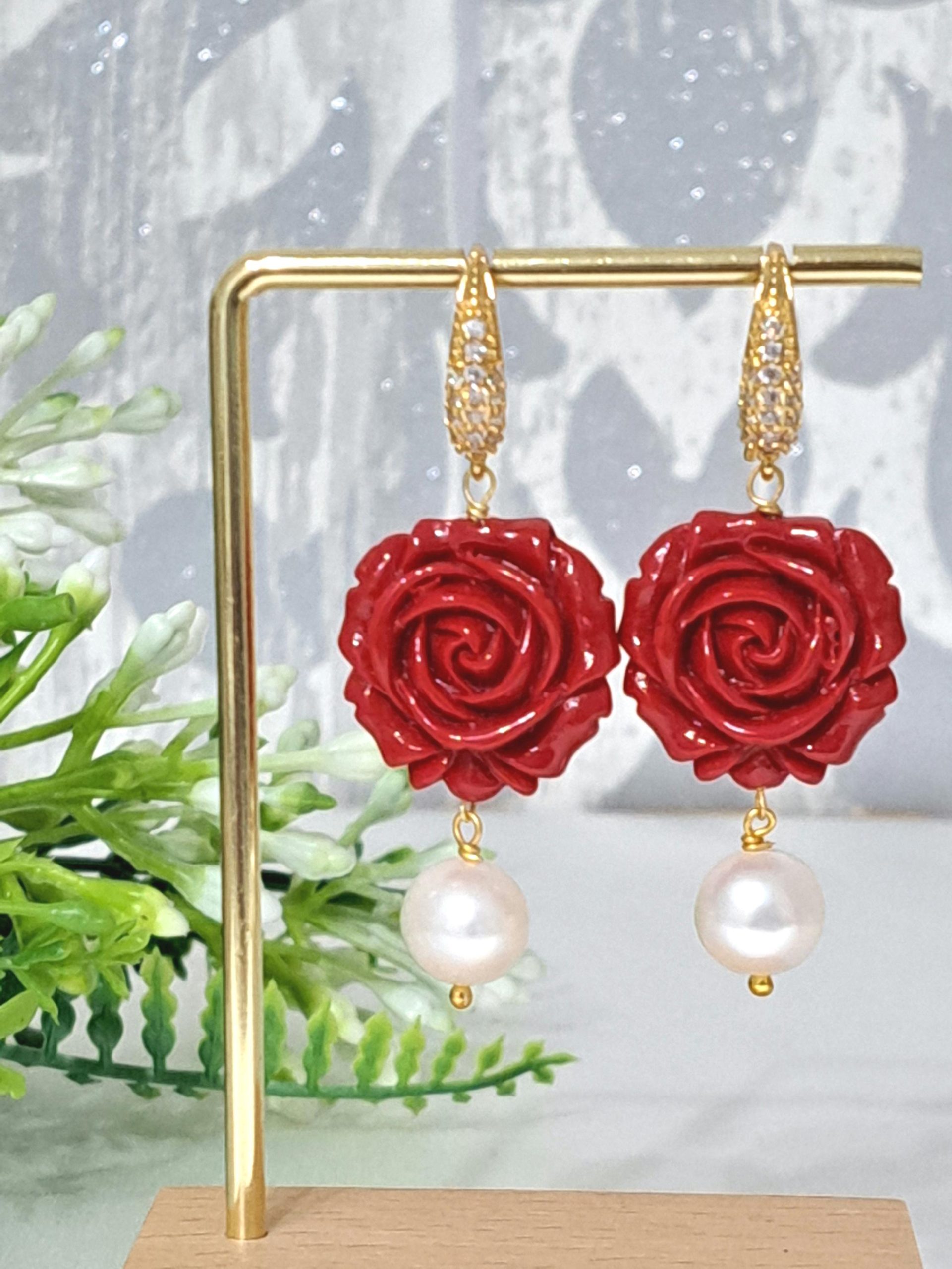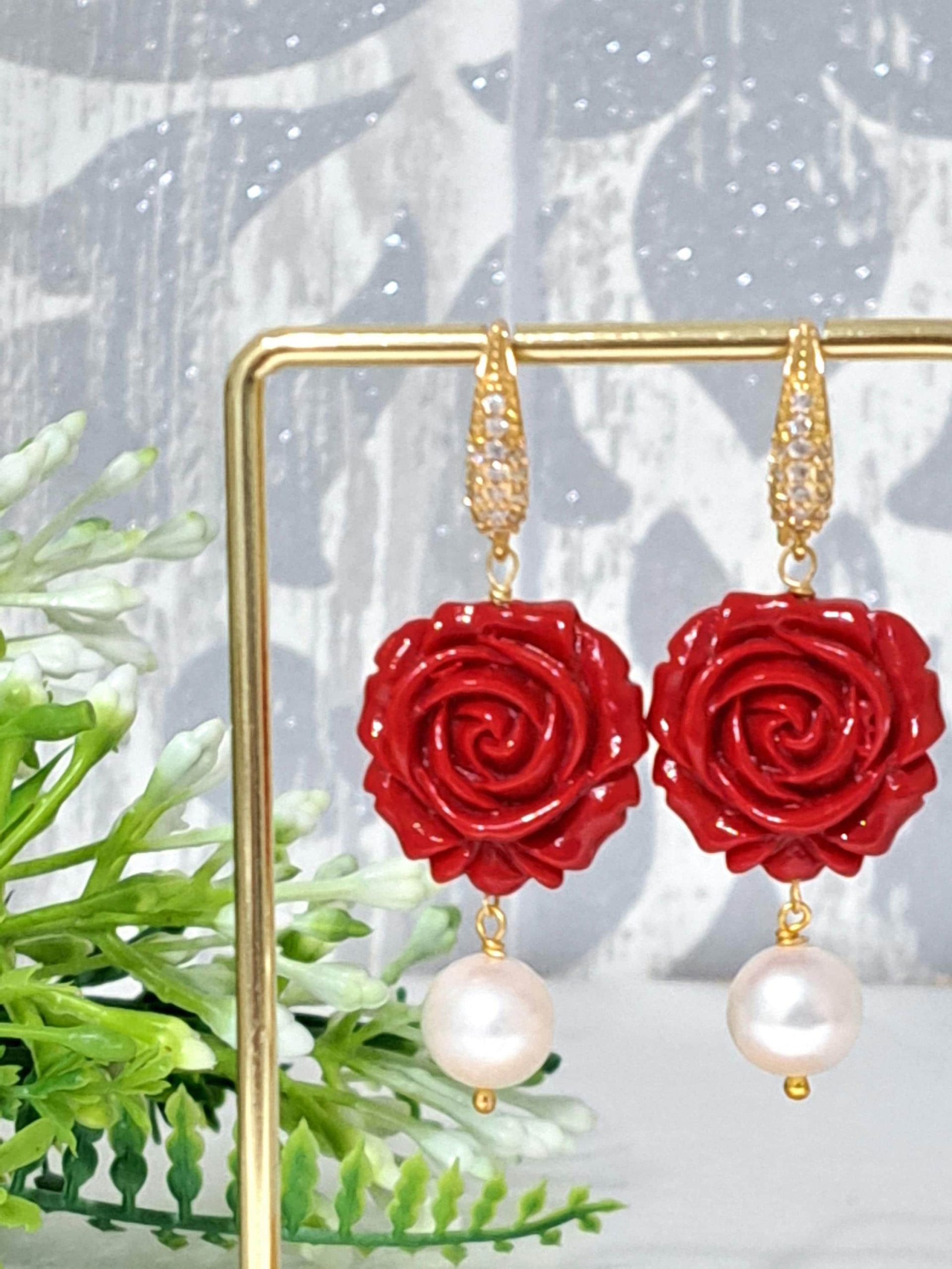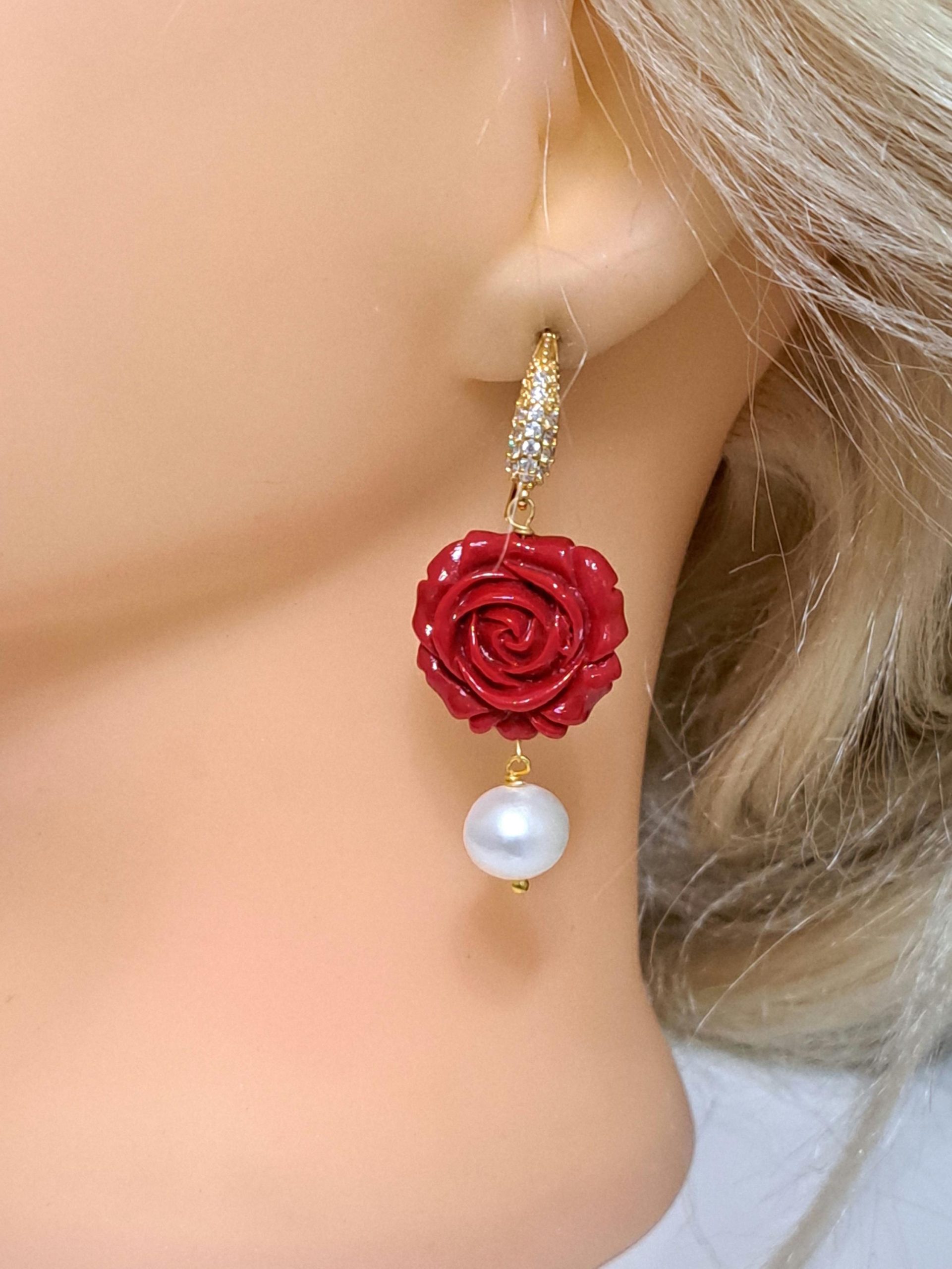 Orecchini pendenti con rose resina rossa imitazione corallo, 2 cm diametro, e perle bianche naturali , chiusura a monachelle in ottone dorato con zirconi.