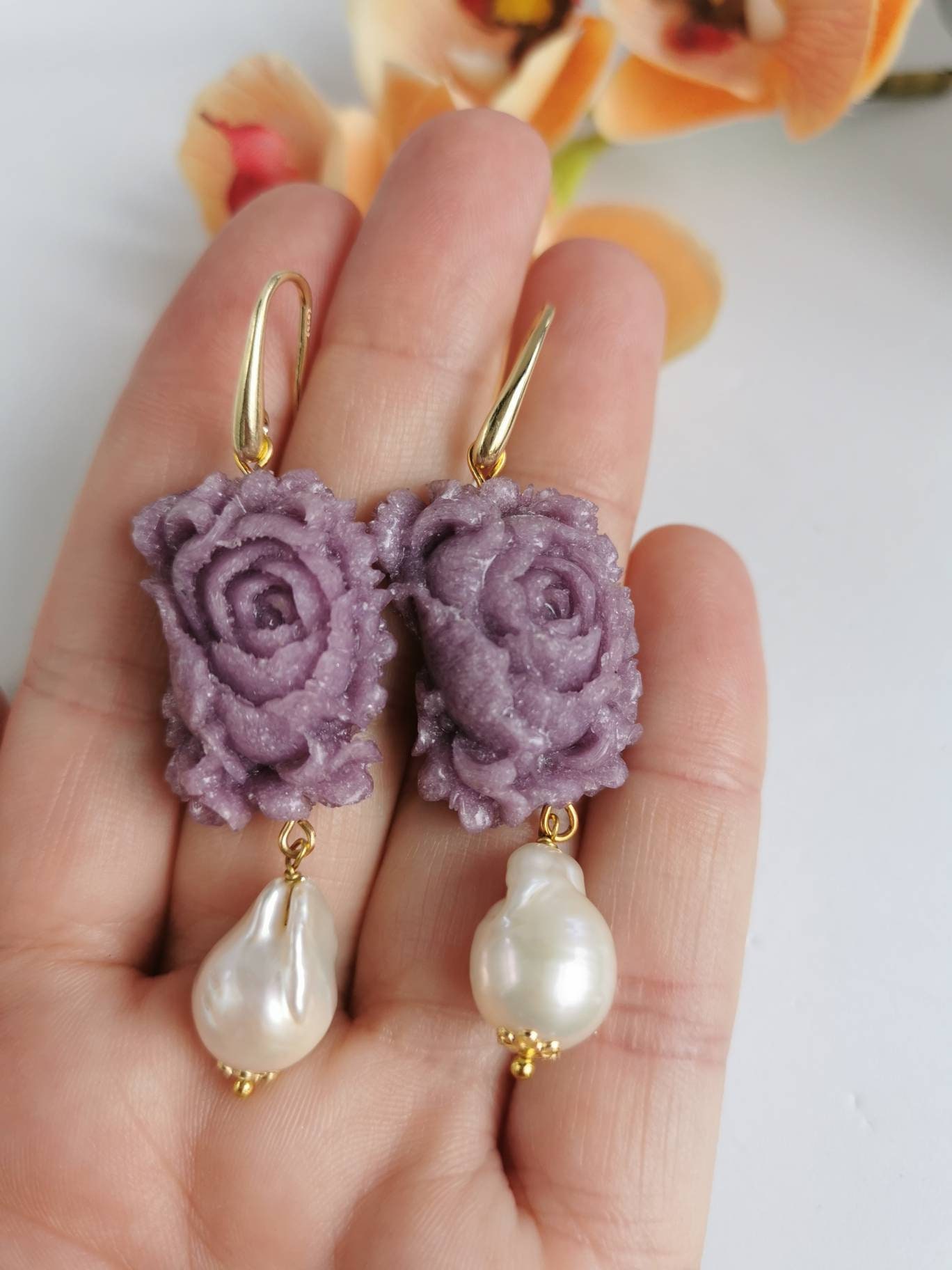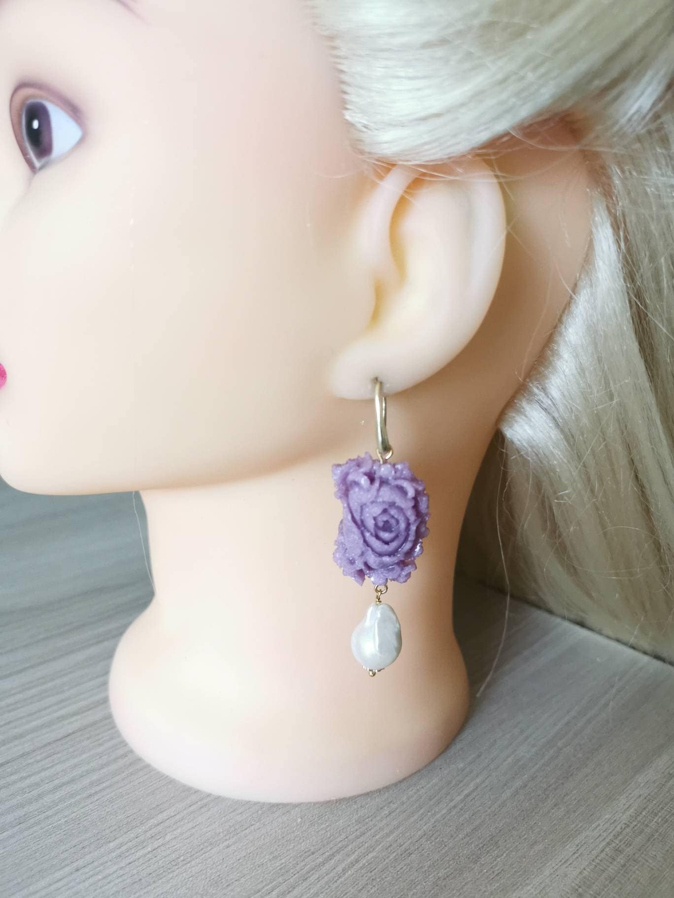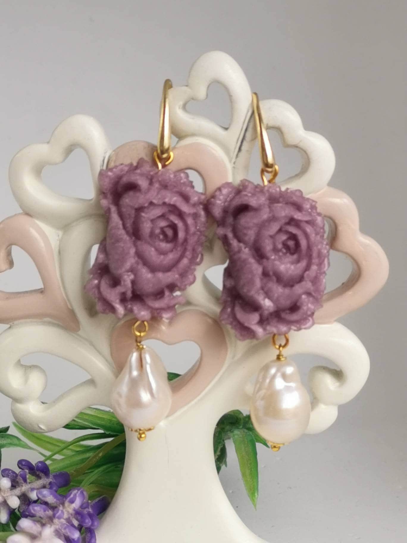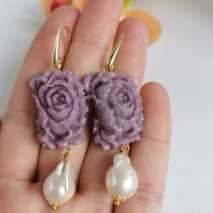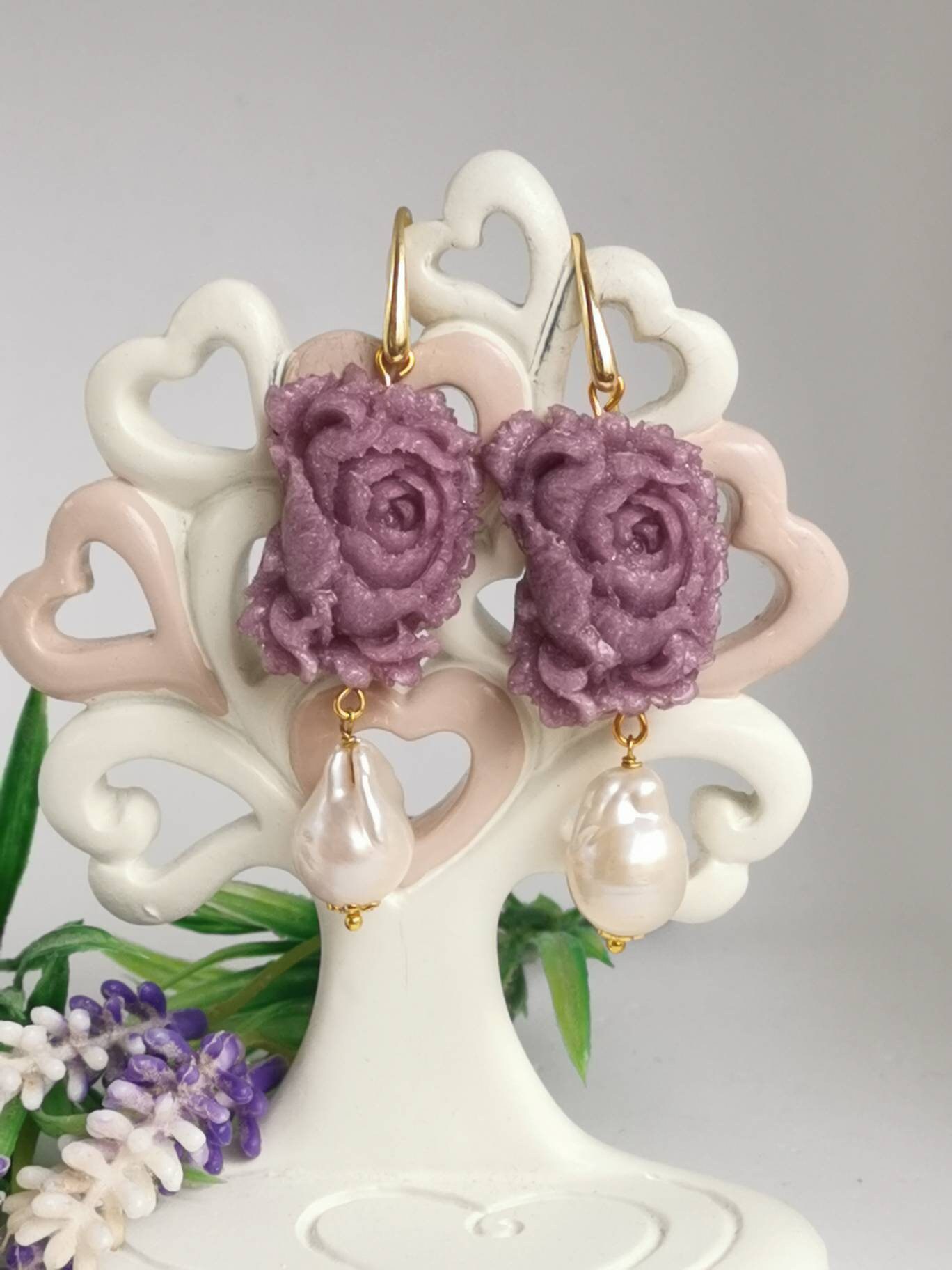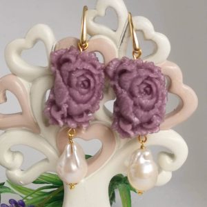 Orecchini rose viola e perle barocche bianche , orecchini argento 925 , gioielli italiani