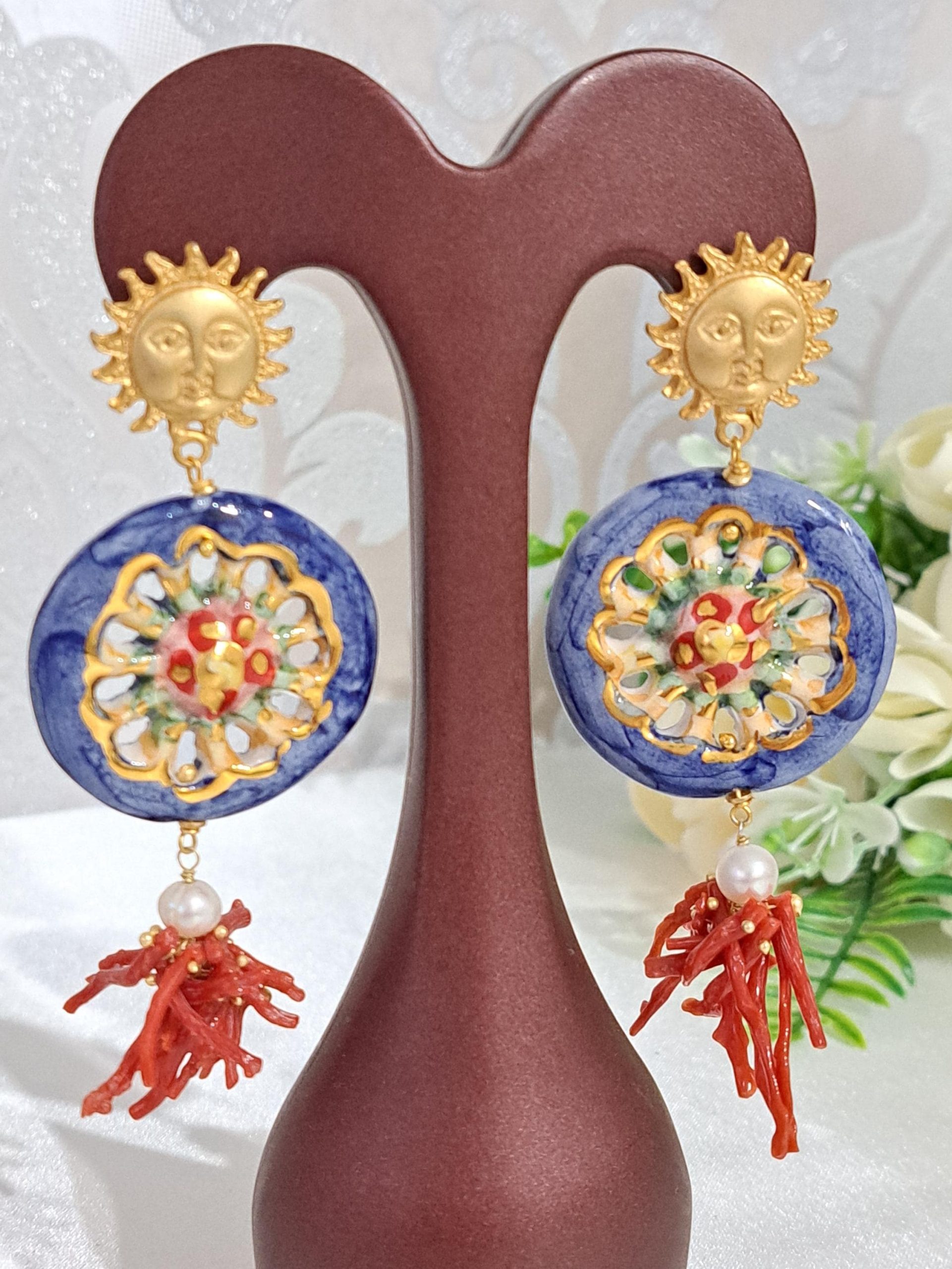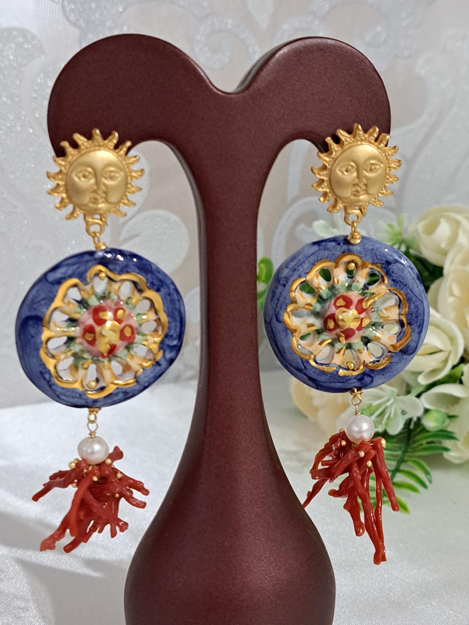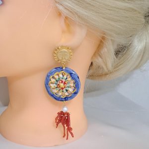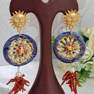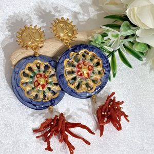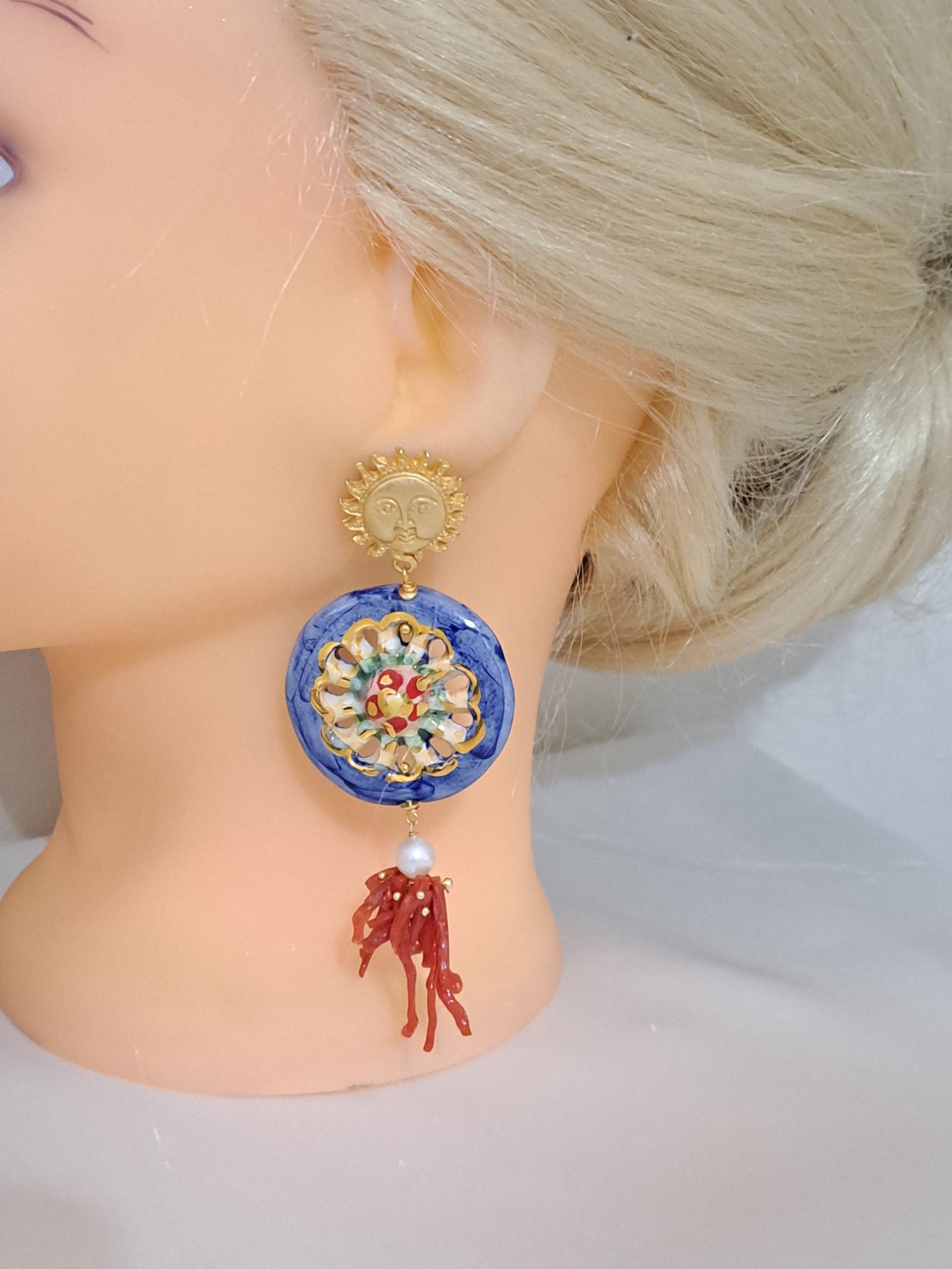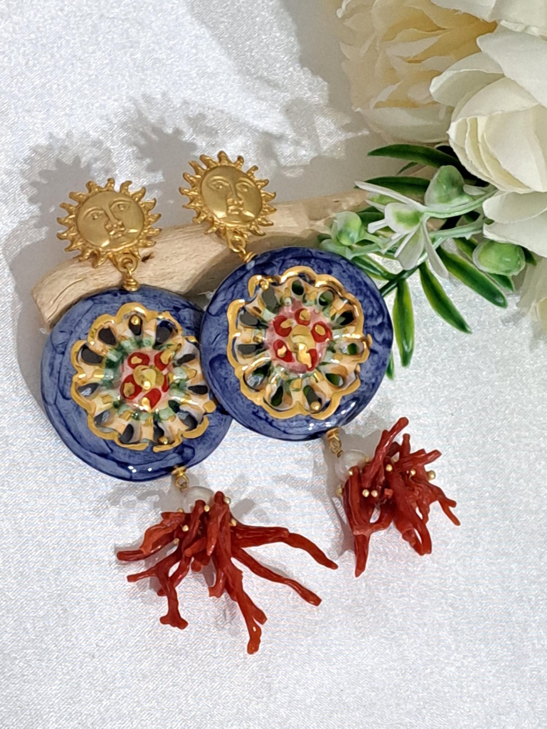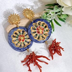 Orecchini ruote ceramica Caltagirone, orecchini corallo rosso naturale, orecchini siciliani maxi