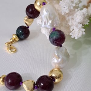 Bracciale pietre dure rubizoisite,perle bianche barocche con perle dorate, bracciale maxi
