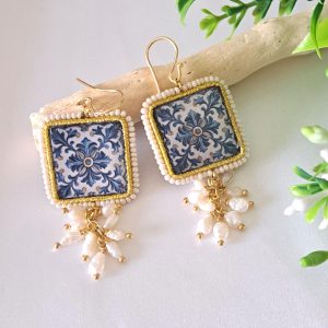 Orecchini piastrelle ceramica Caltagirone con grappolo perle bianche  , orecchini siciliani