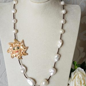 Collana Sole ceramica di Caltagirone con perle bianche barocche , collana siciliana