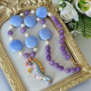 Collana cavalluccio in ceramica di Caltagirone con pietre dure giada viola , collana siciliana