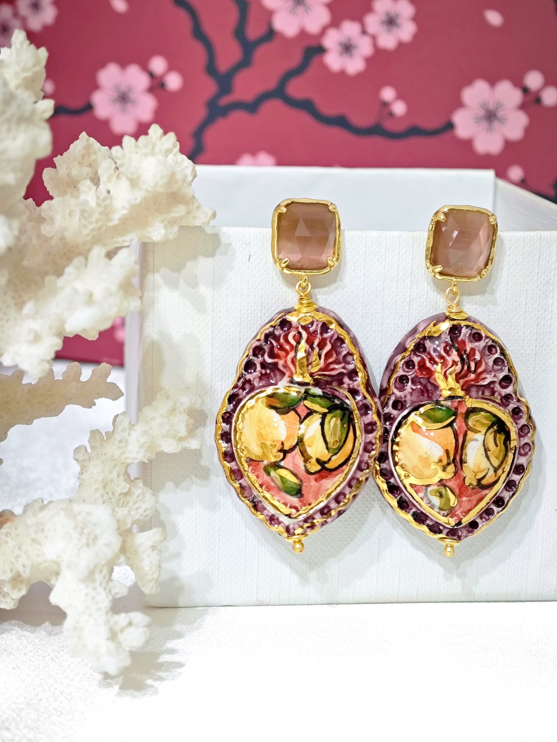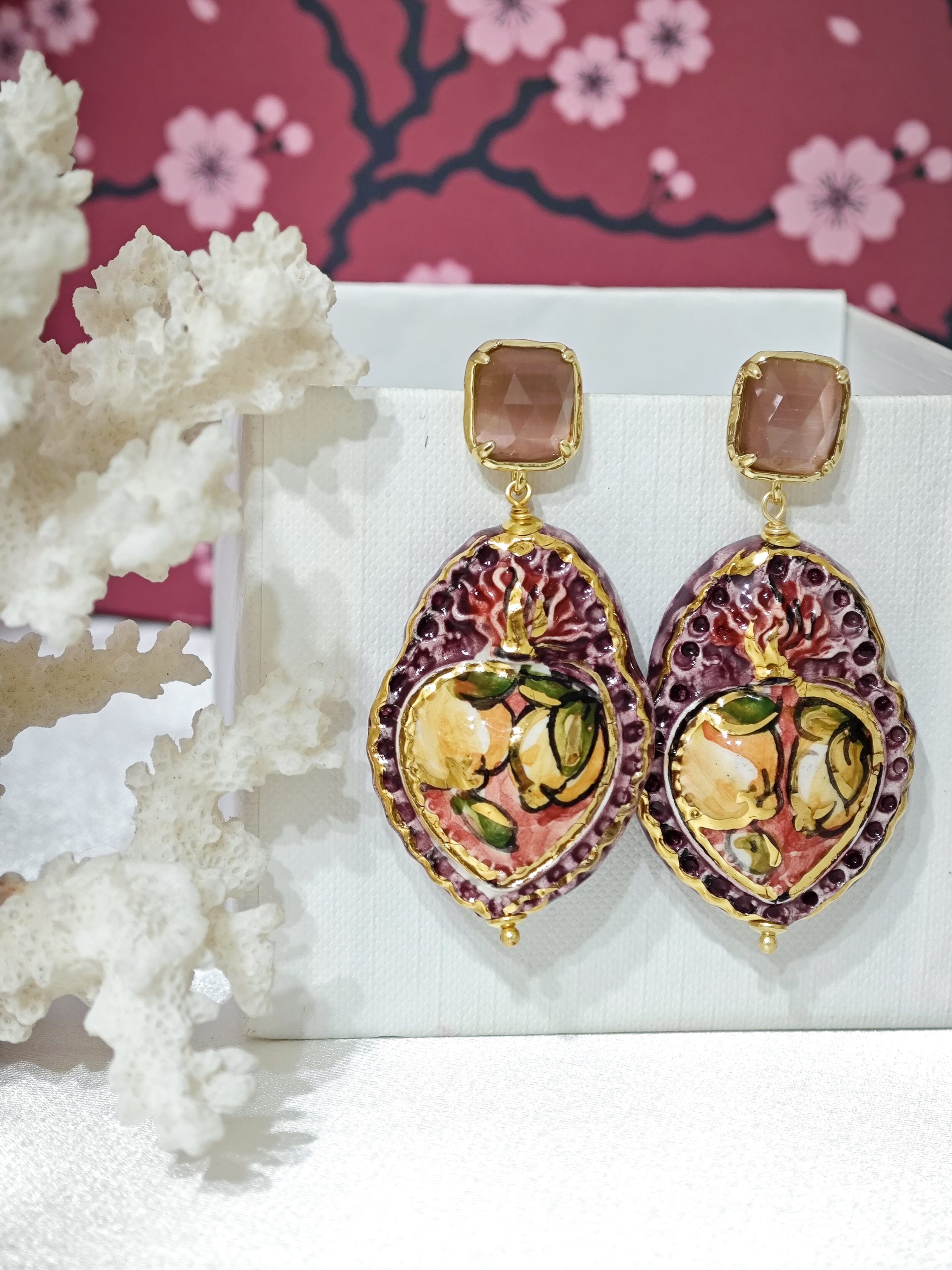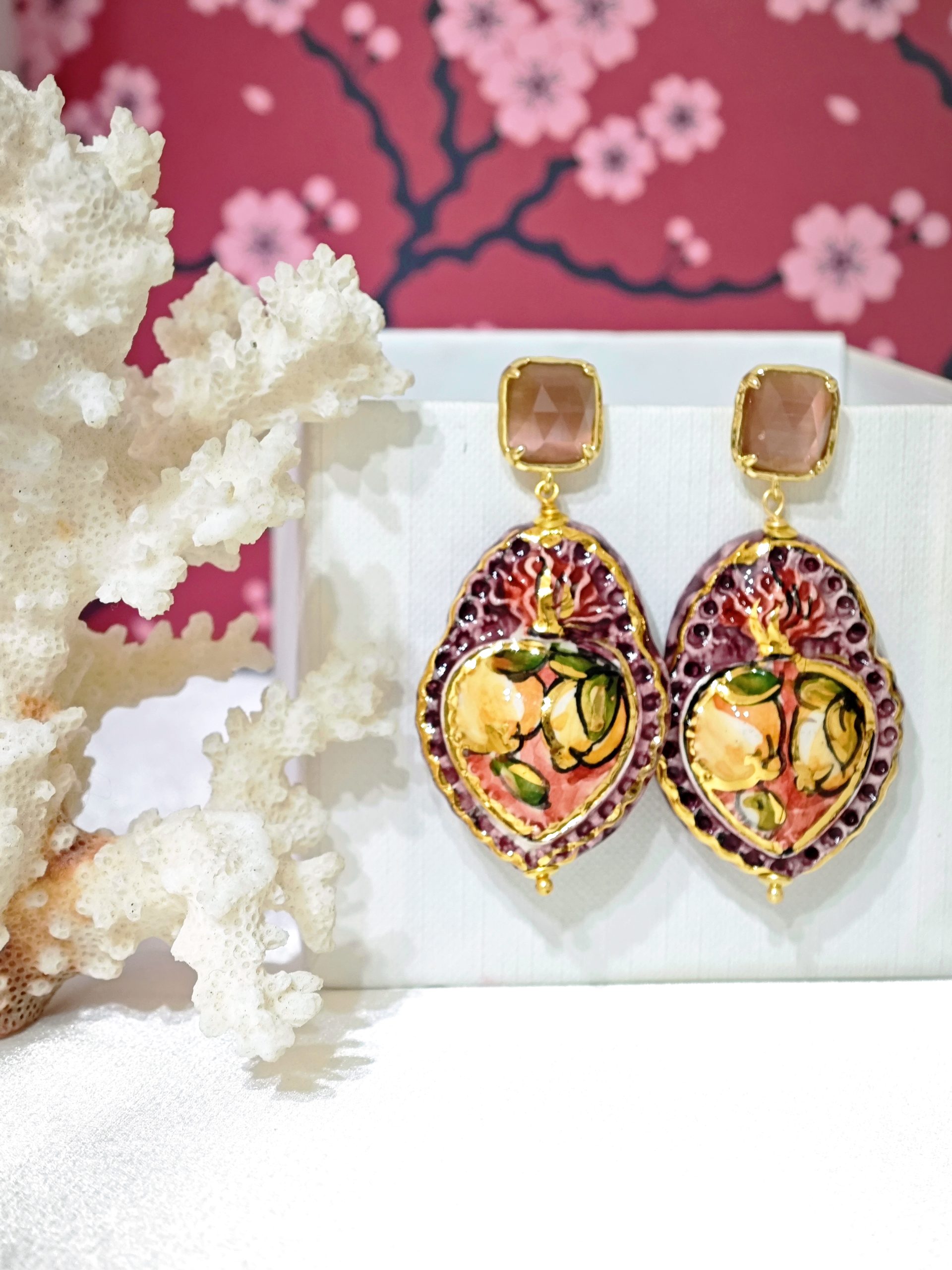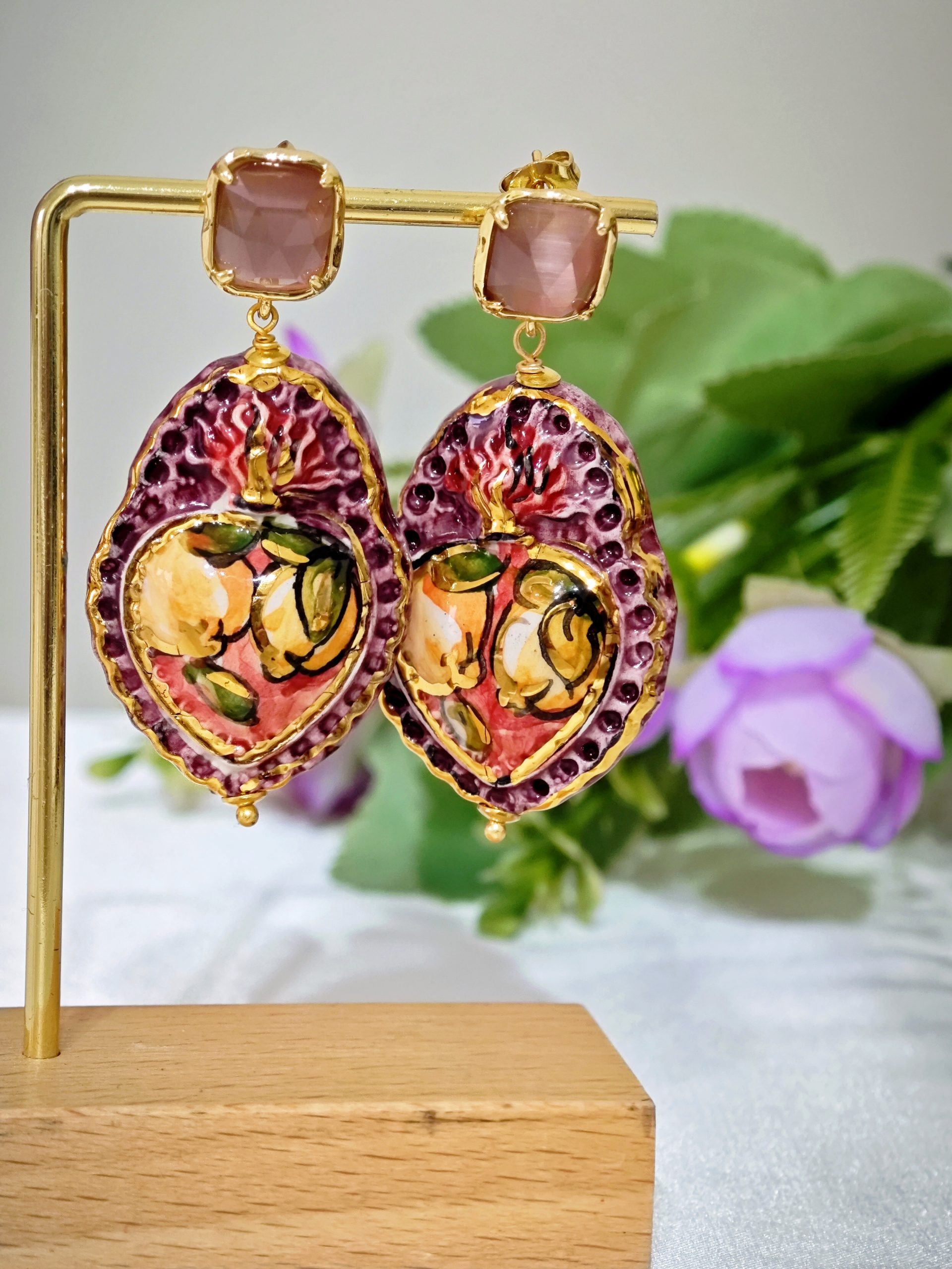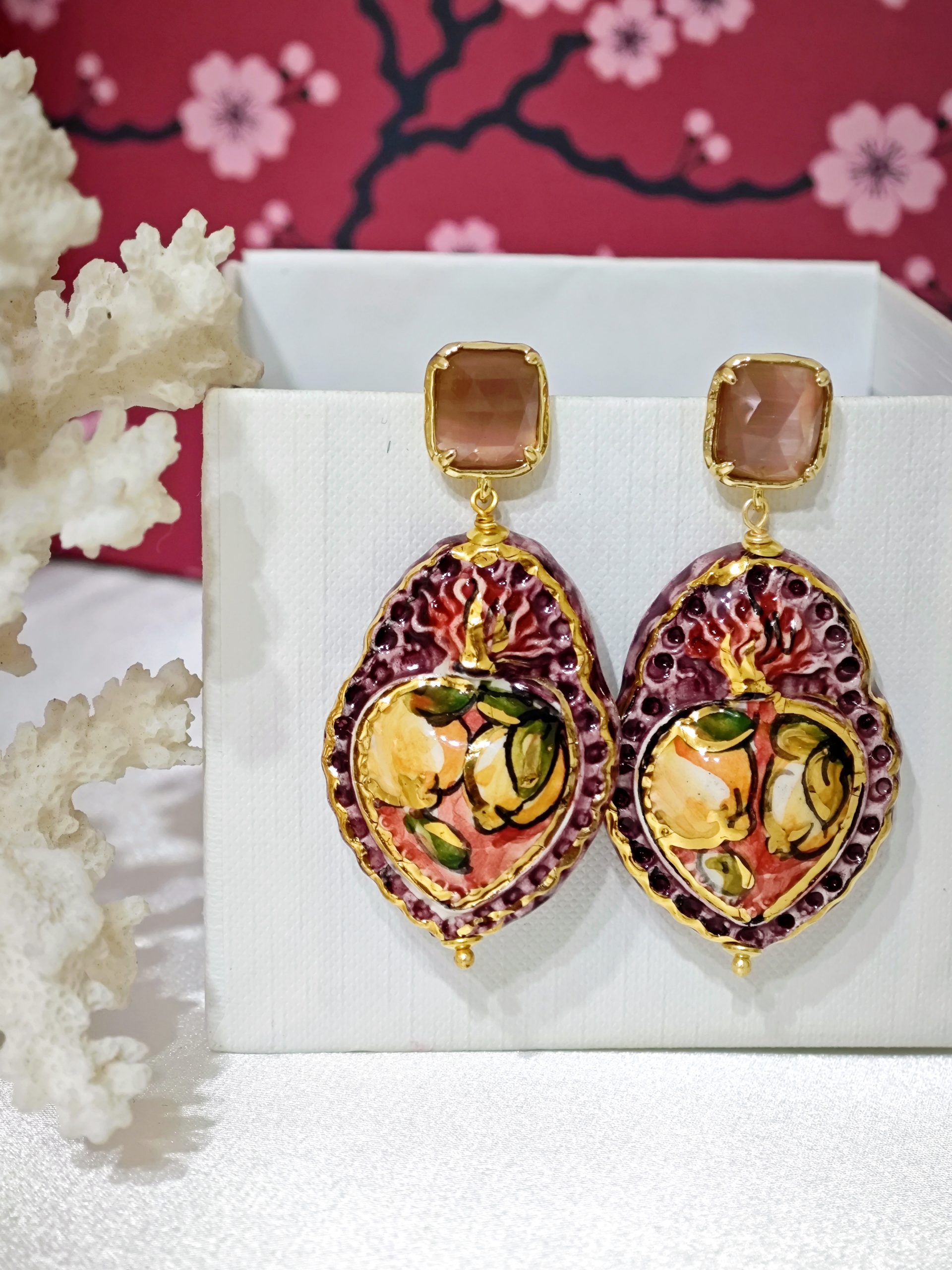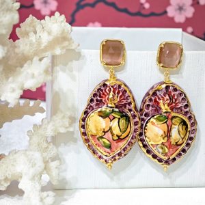 Orecchini Sacro Cuore in ceramica di Caltagirone, orecchini ex voto , orecchini barocchi, orecchini siciliani