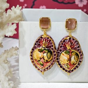 Orecchini siciliani barocchi con Sacro Cuore in ceramica di Caltagirone realizzata e dipinta a mano con applicazioni foglia d’oro 24 kt,4 cm dimensioni