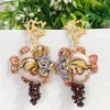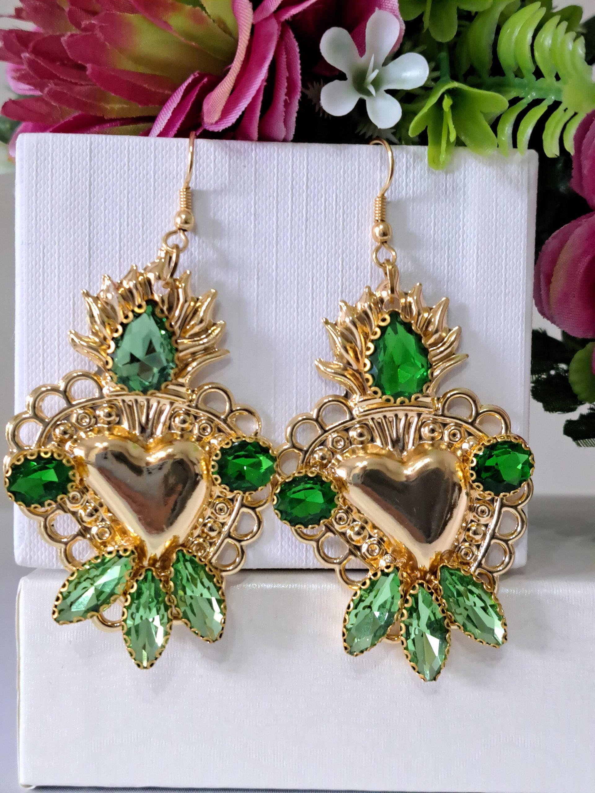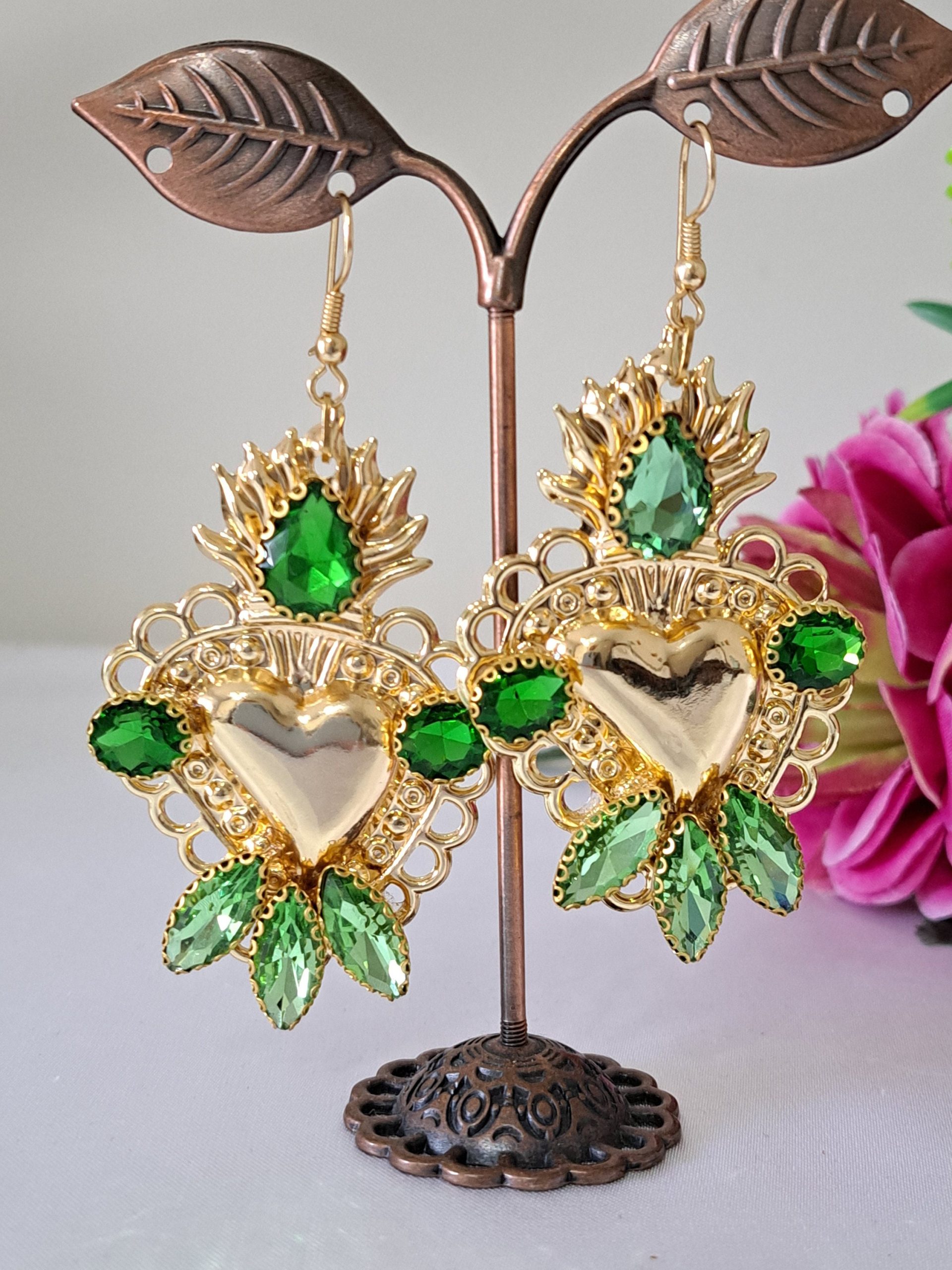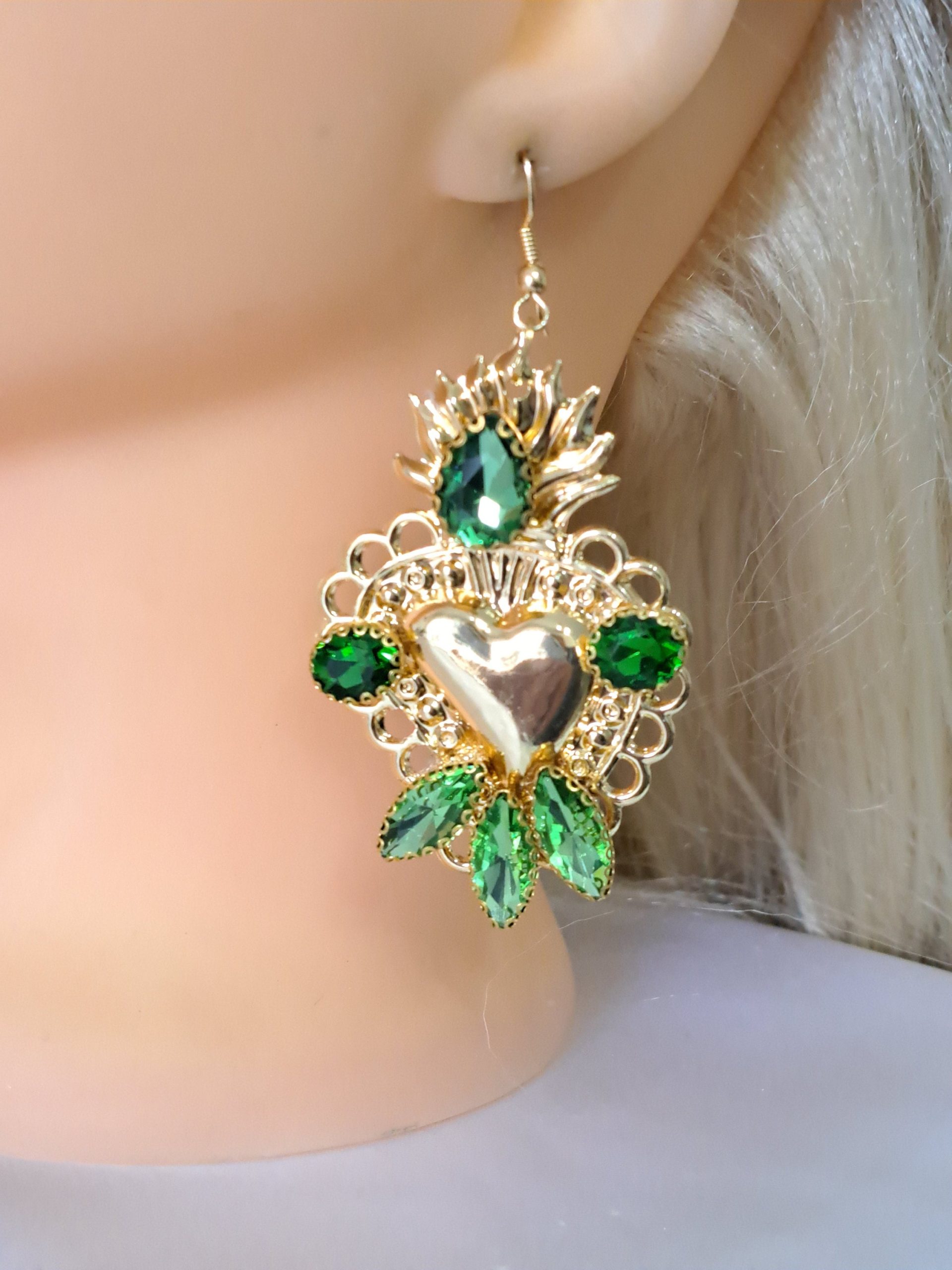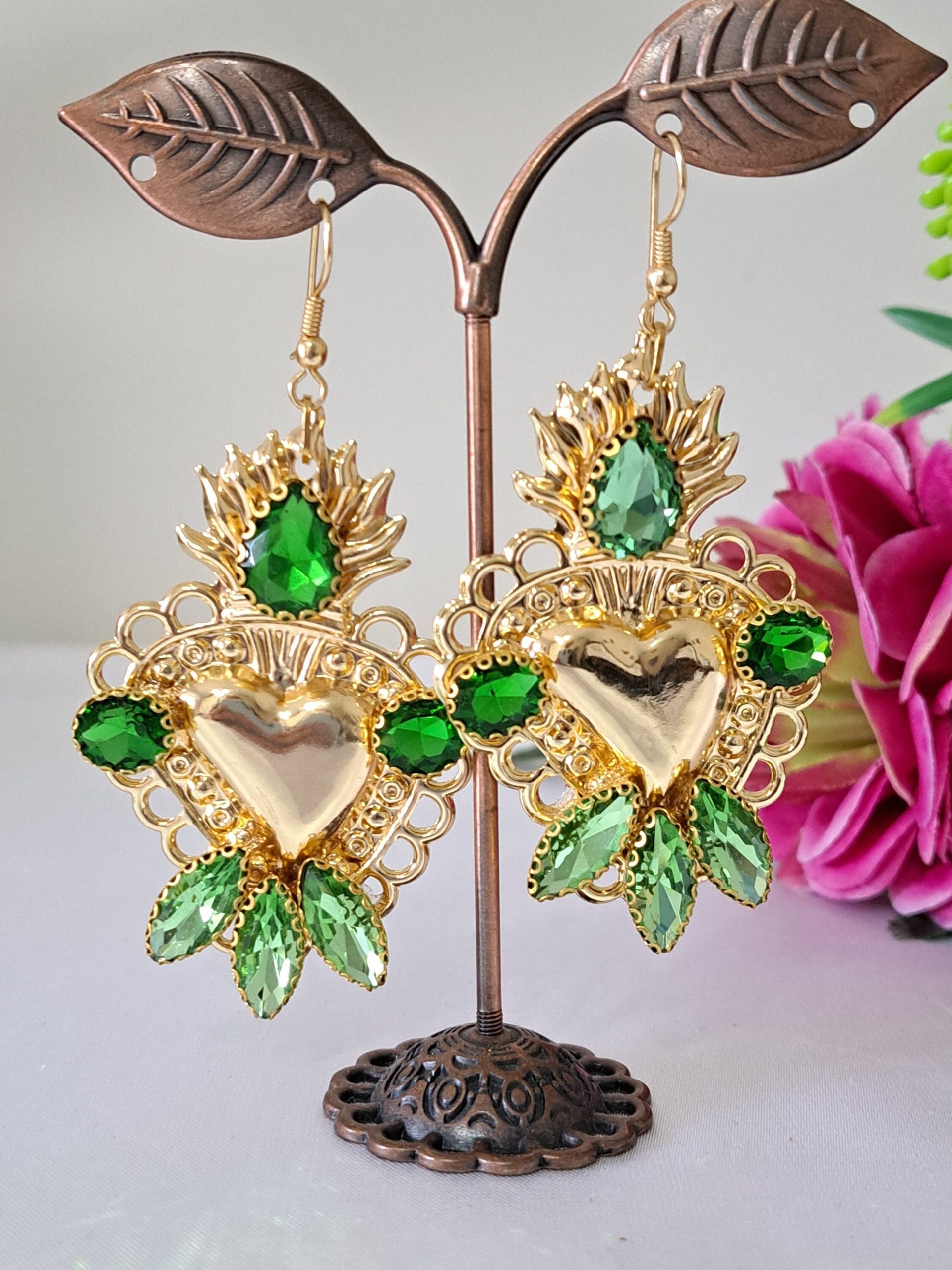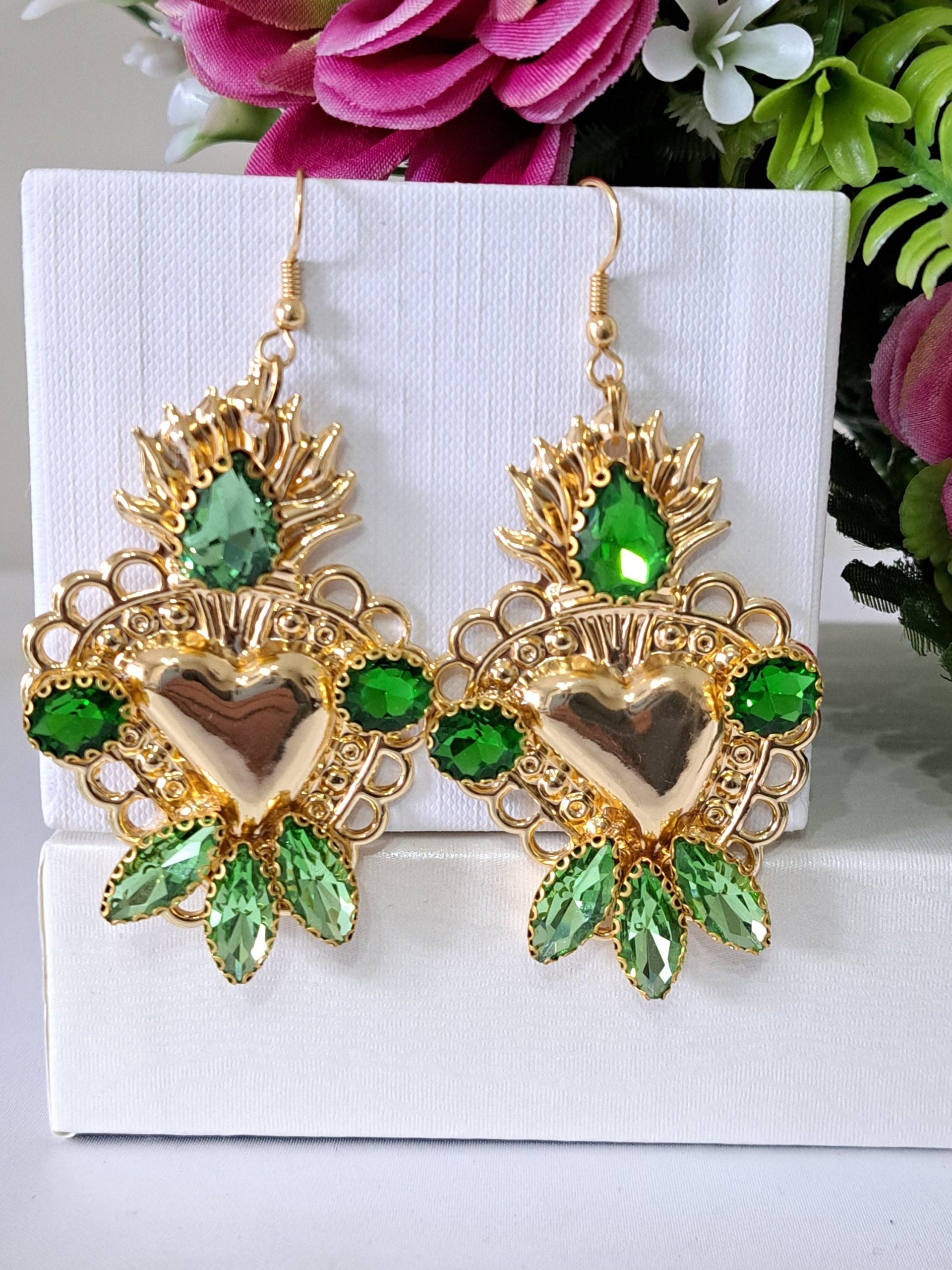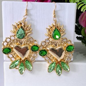 Orecchini siciliani barocchi con sacro cuore in ottone dorato 6×4 cm dimensioni, decorati con cristalli verdi