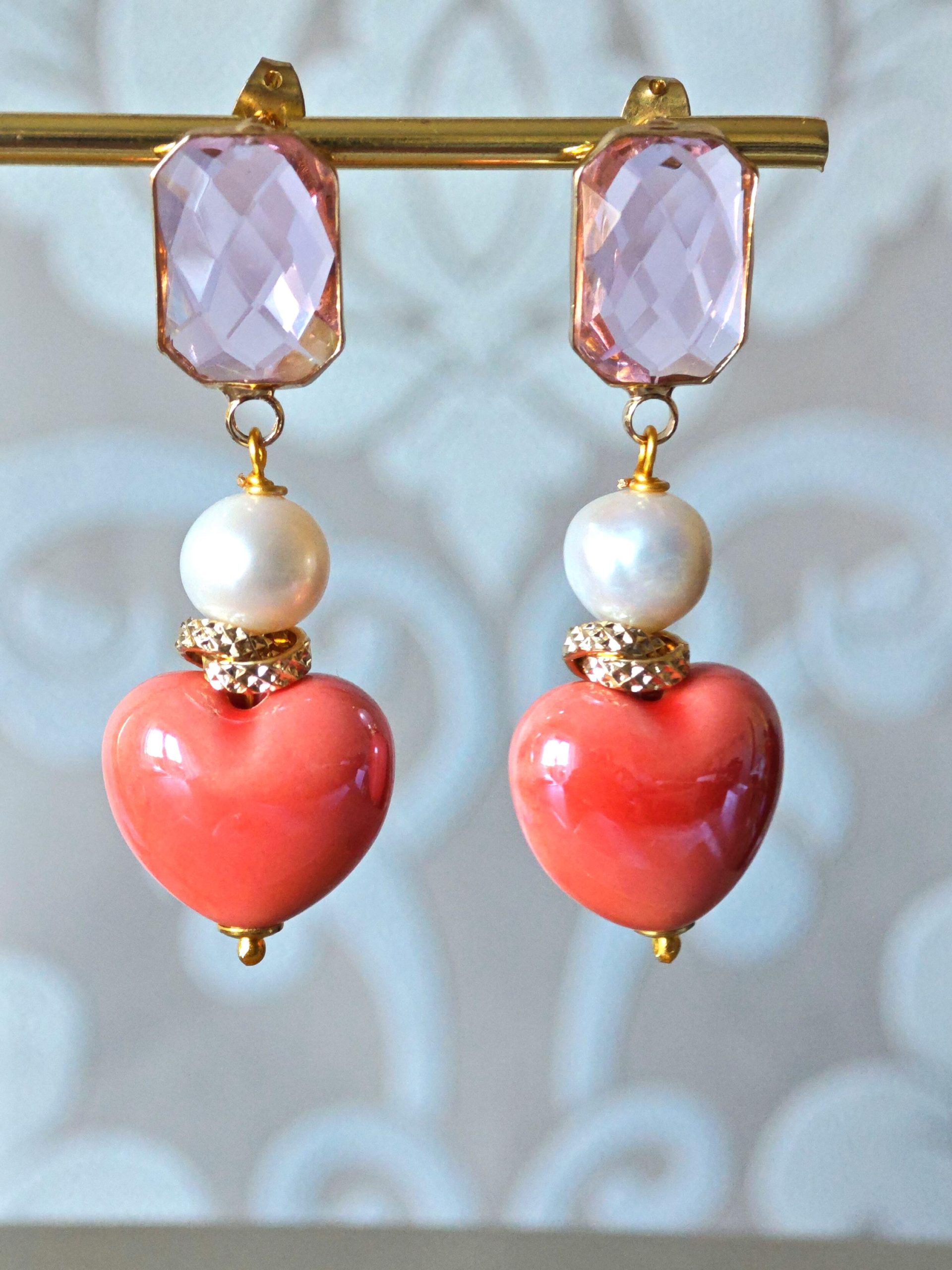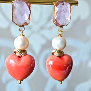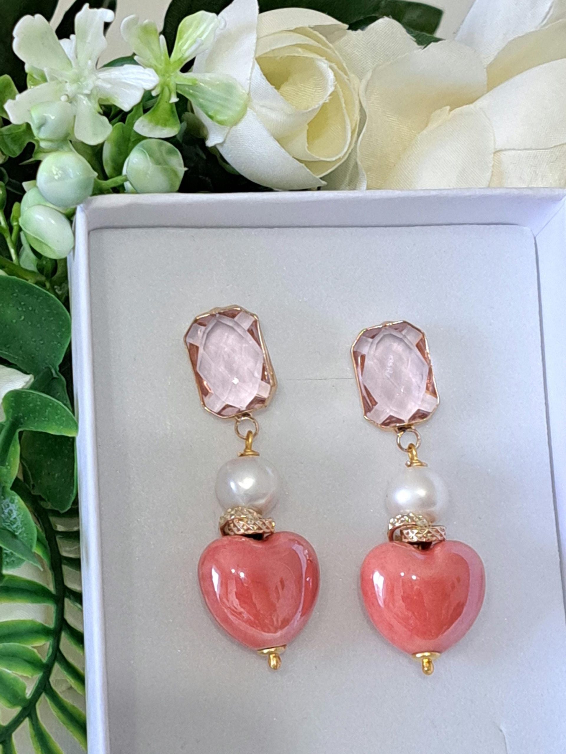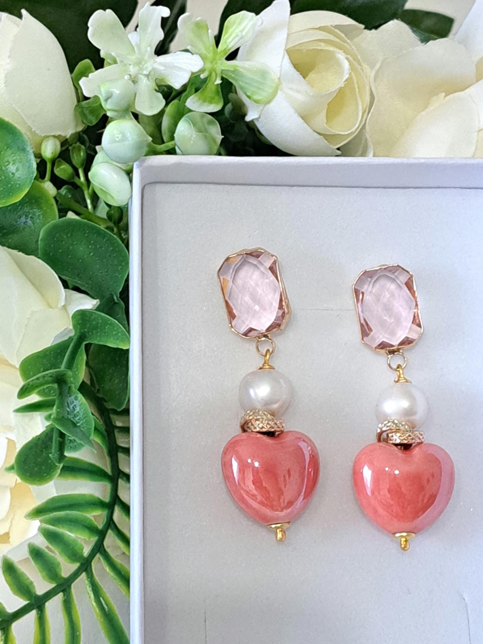 Orecchini San Valentino con cuori ceramica e perle bianche , orecchini cristalli