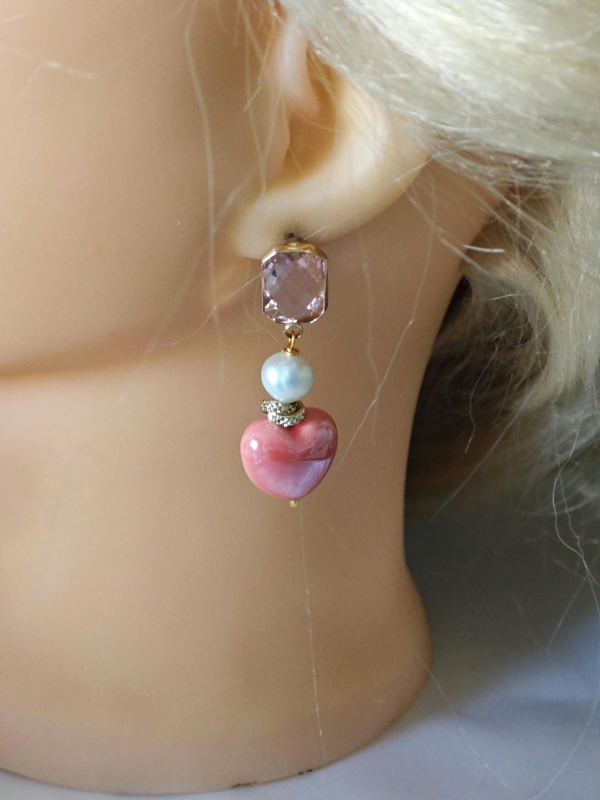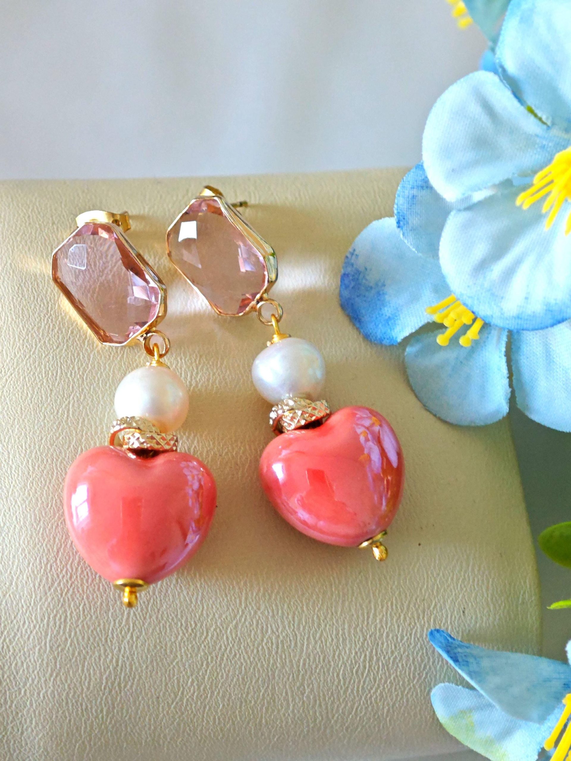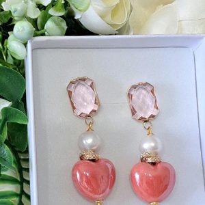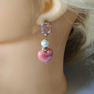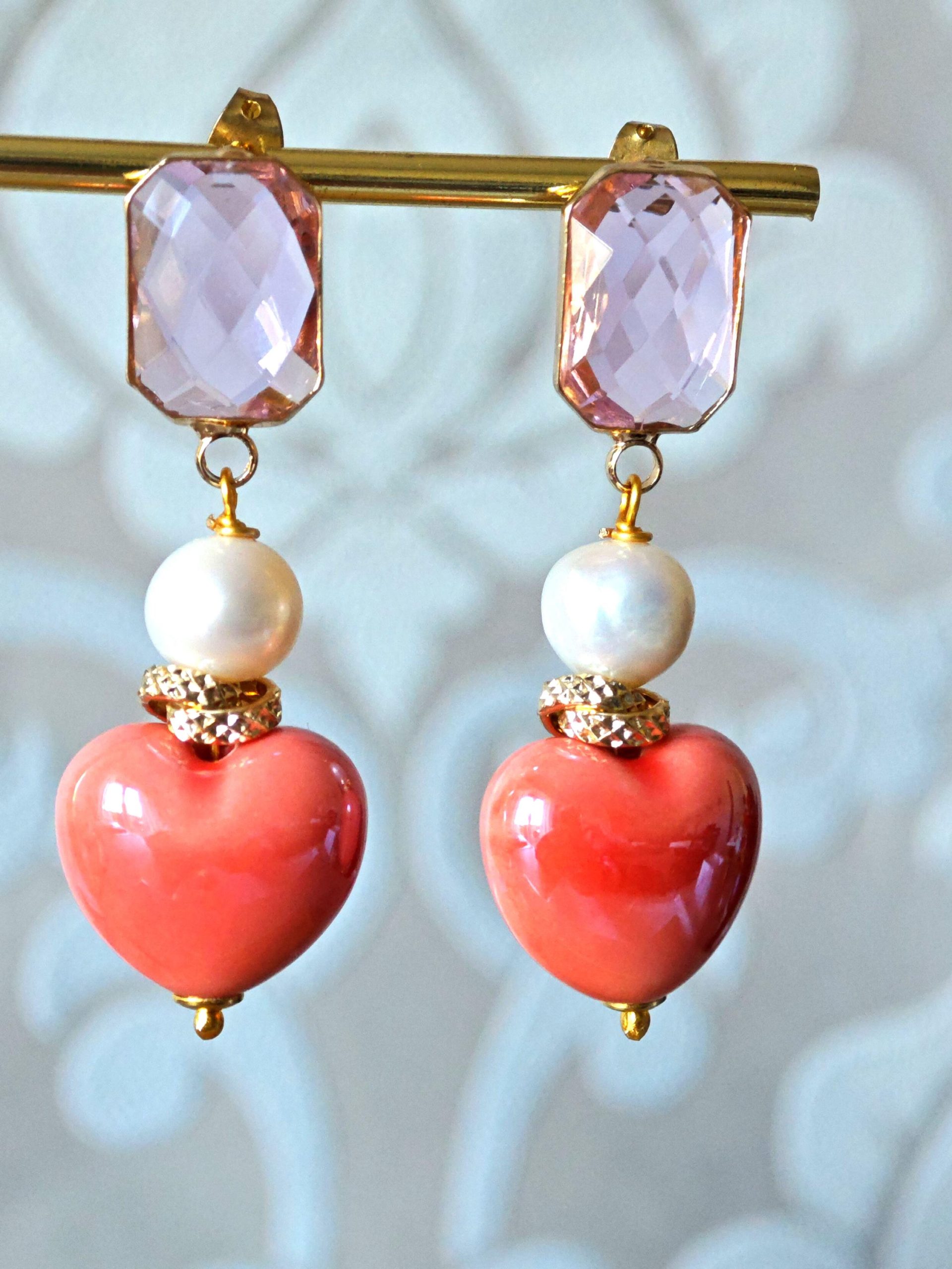Orecchini San Valentino con cuori ceramica e perle bianche , orecchini cristalli