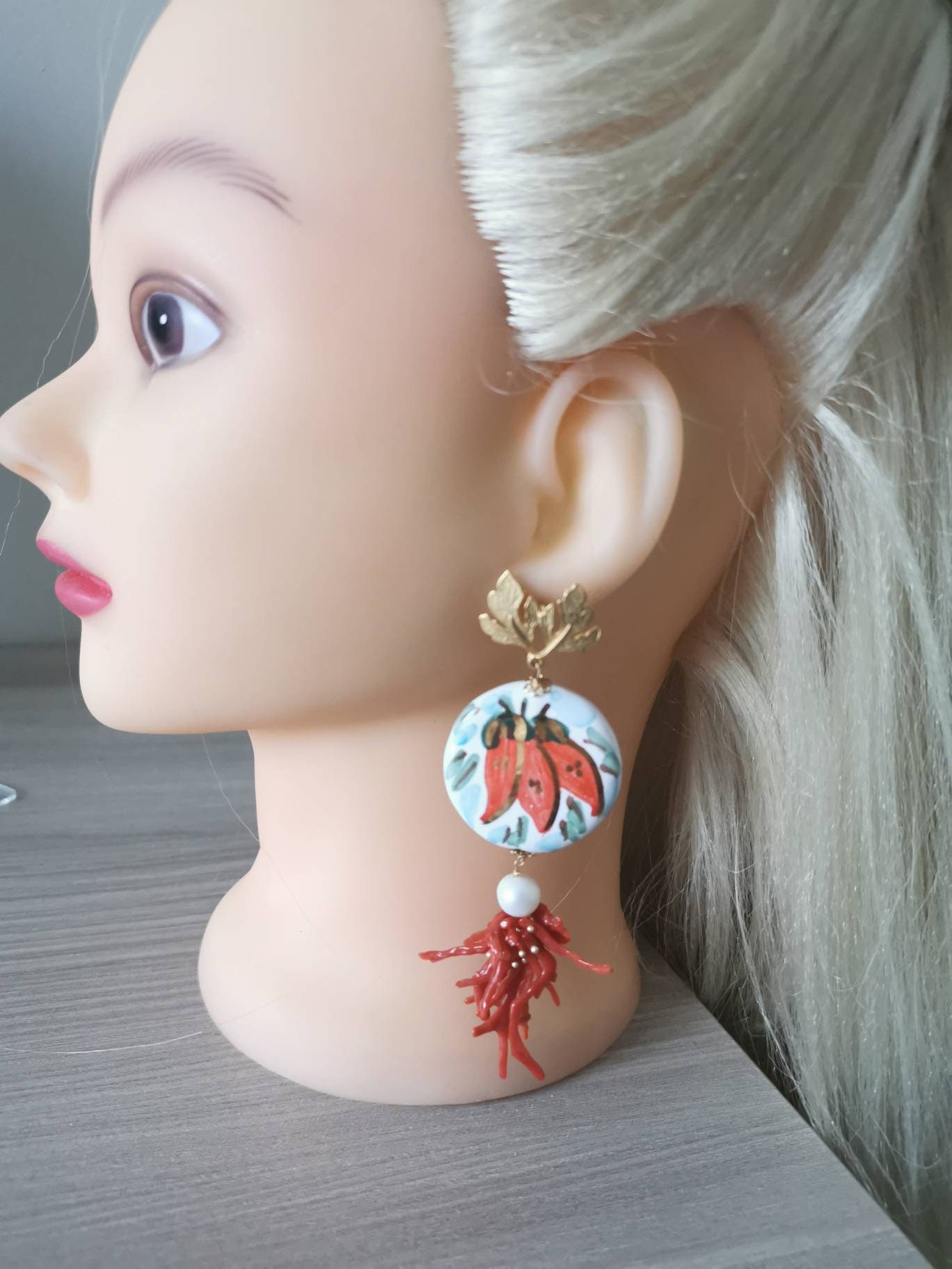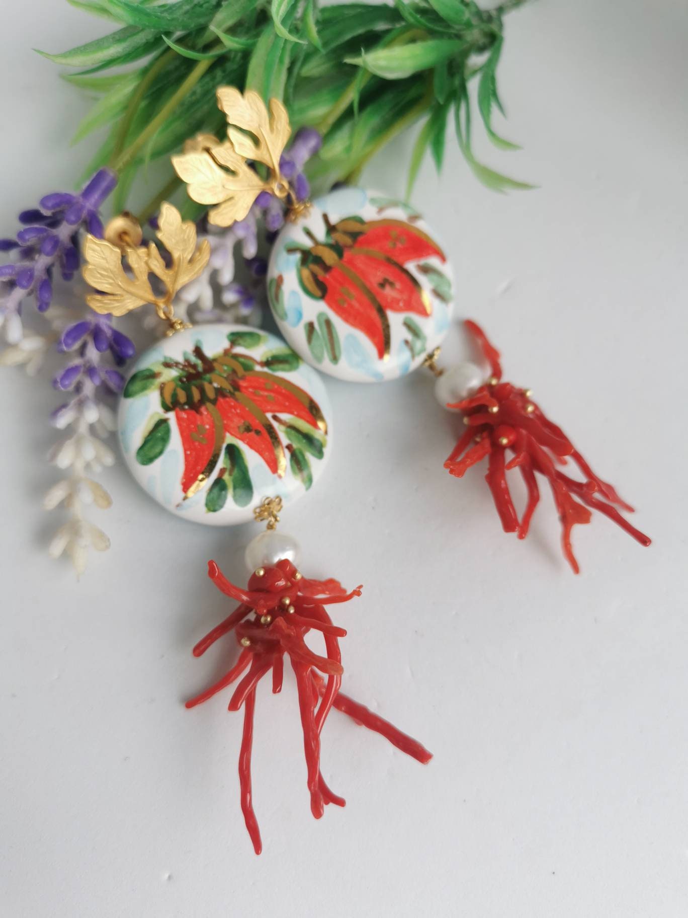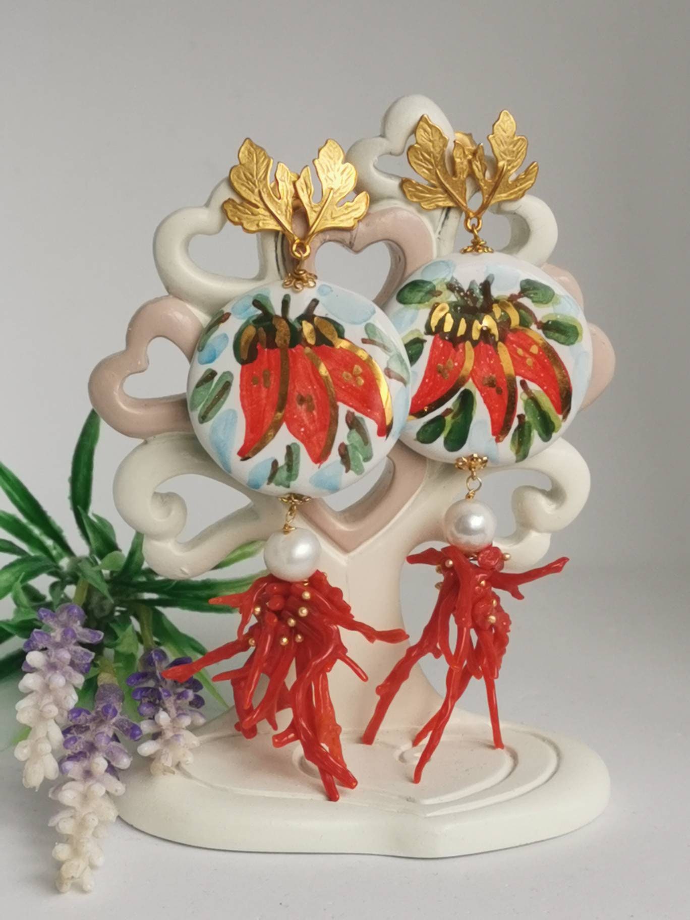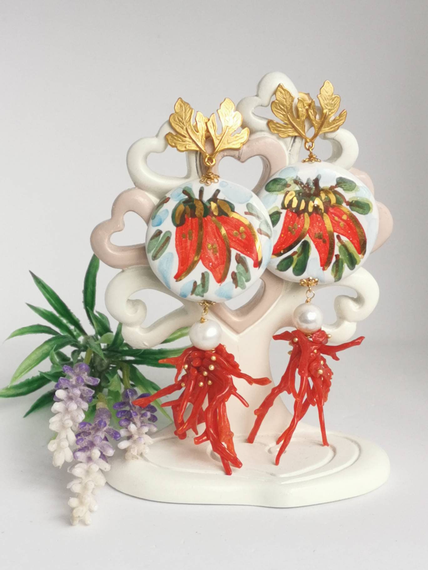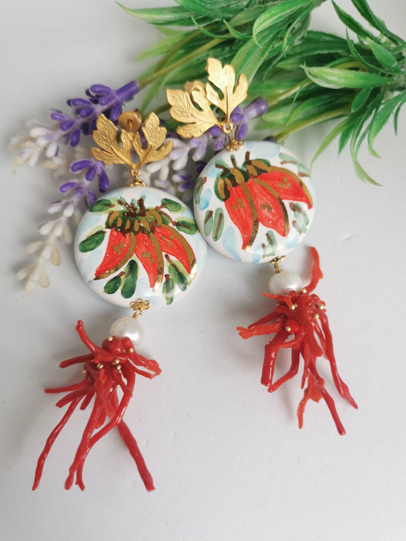 Orecchini siciliani con ceramica di Caltagirone, corallo rosso naturale e perle bianche