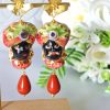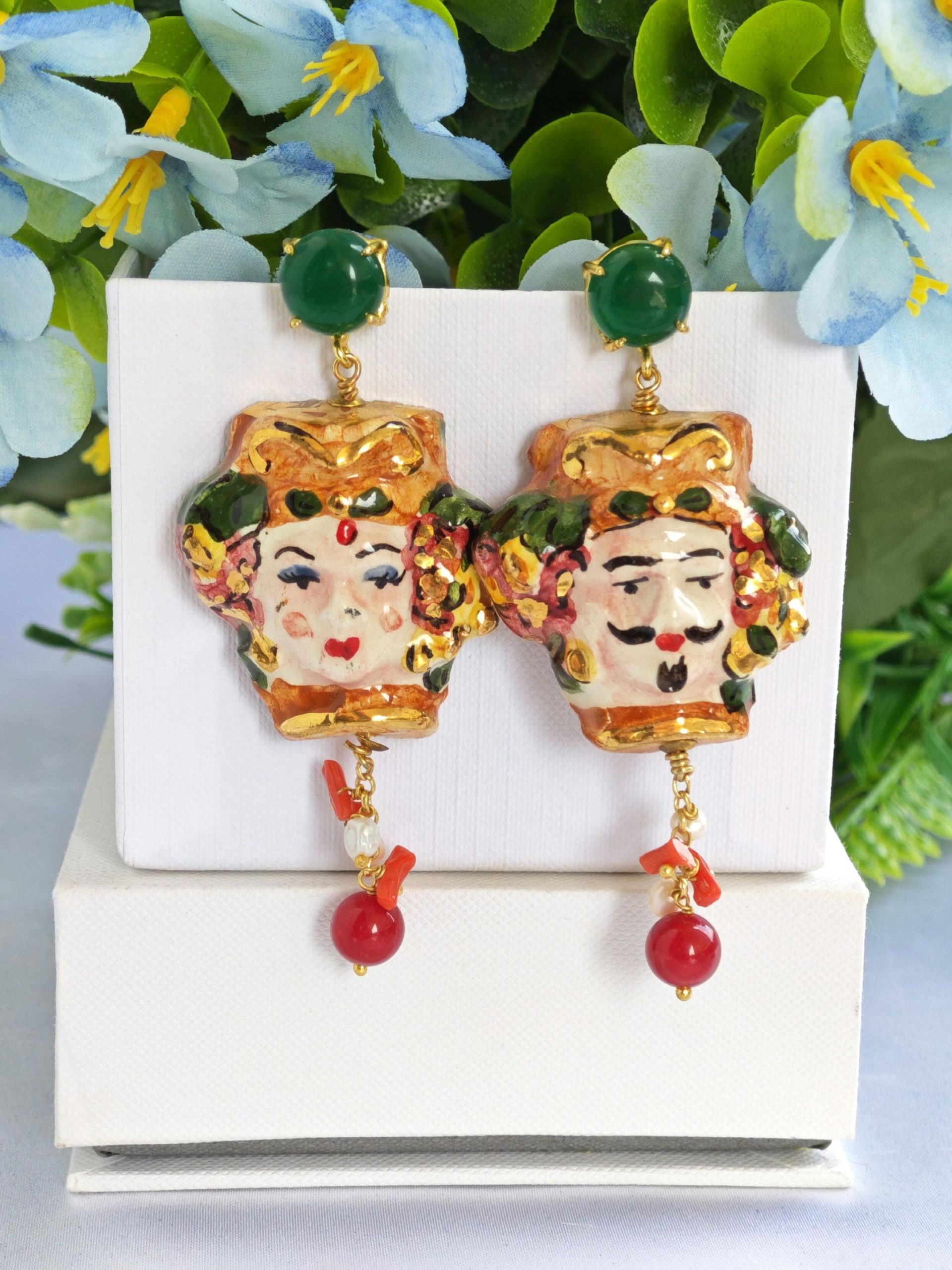 Orecchini pendenti con teste di moro in ceramica di Caltagirone realizzata e dipinta a mano , 4 cm dimensioni, perle bianche naturali e imitazione e con corallo rosso bambù e pietre dure agata rossa.