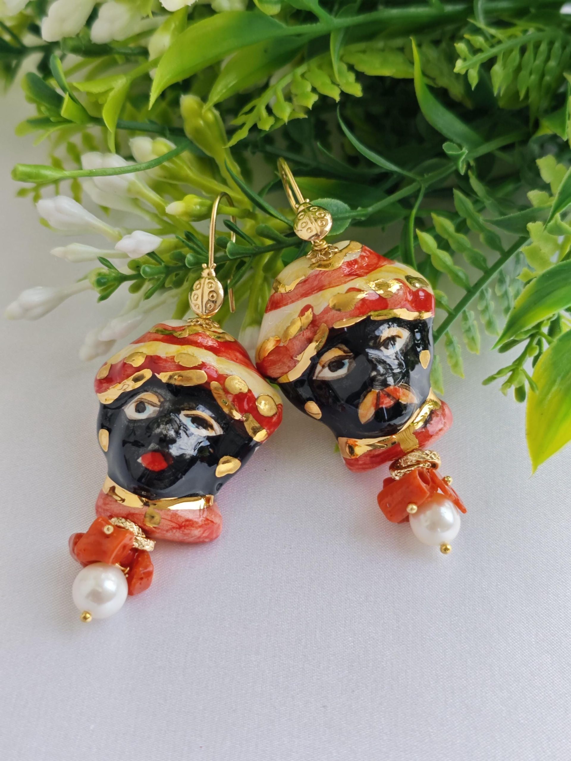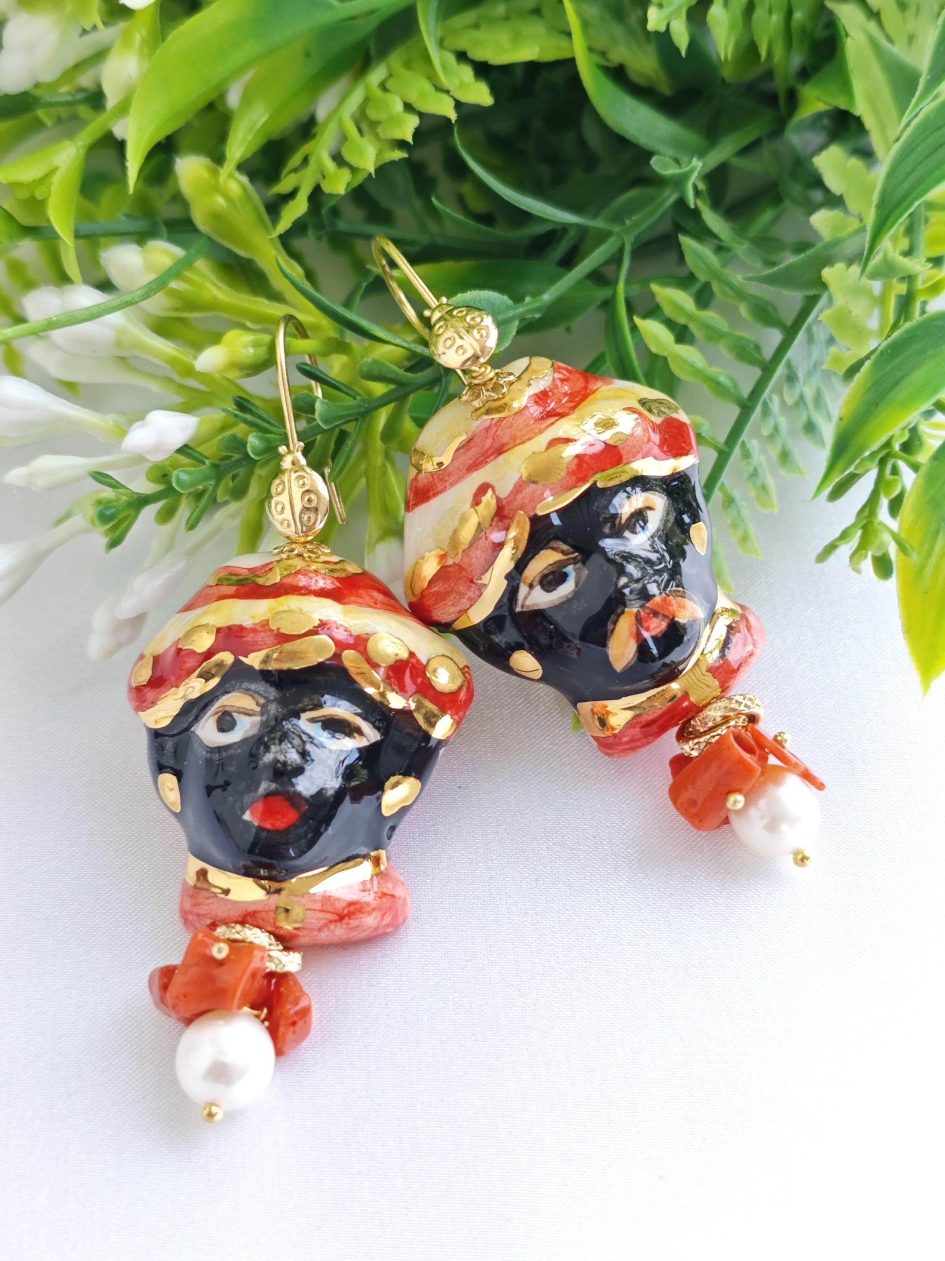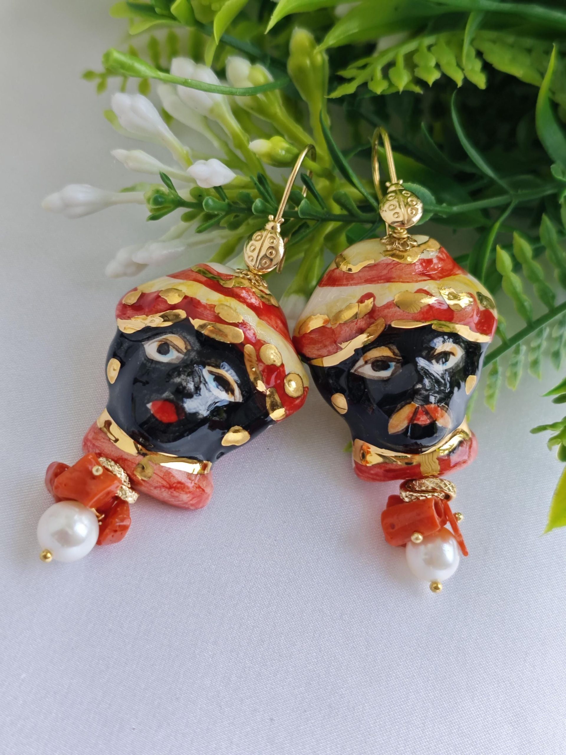 Orecchini siciliani teste di moro in ceramica di Caltagirone, perle bianche e corallo con coccinelle argento 925 placcato oro