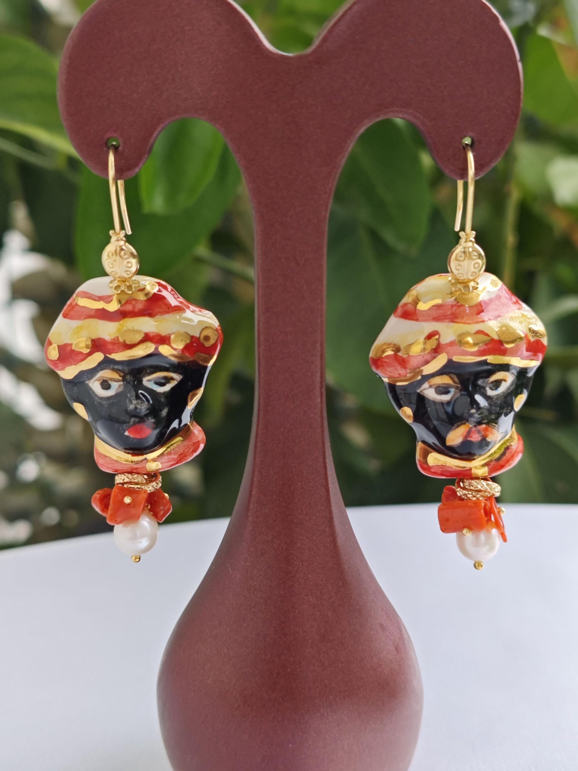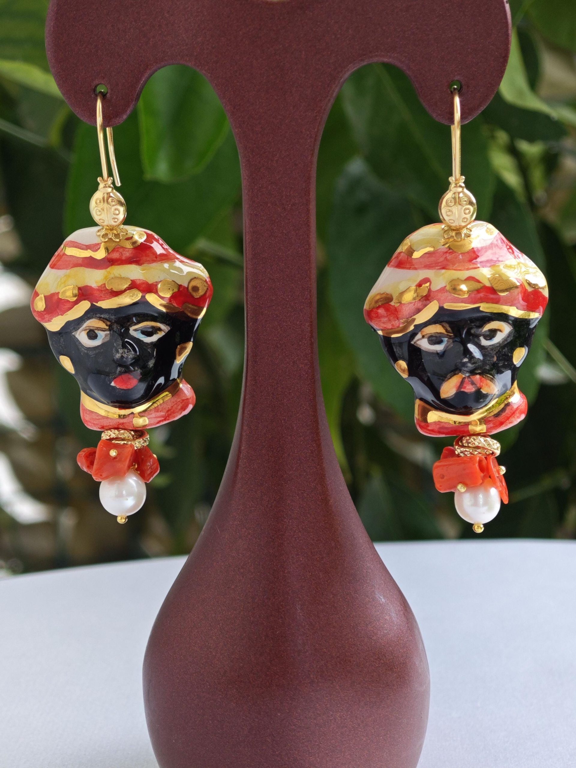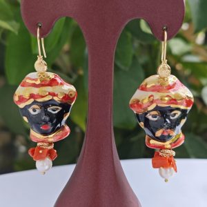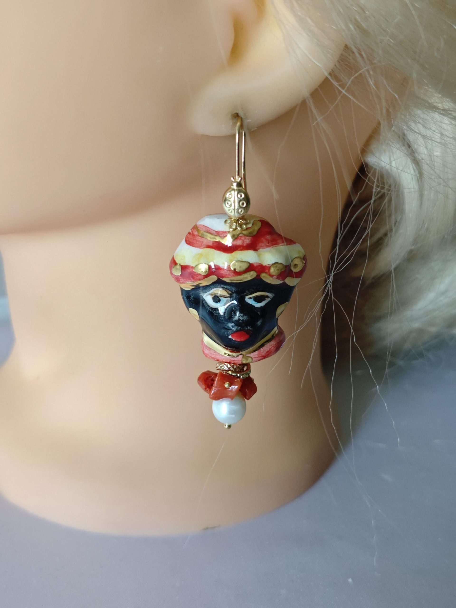Orecchini siciliani teste di moro in ceramica di Caltagirone, perle bianche e corallo con coccinelle argento 925 placcato oro