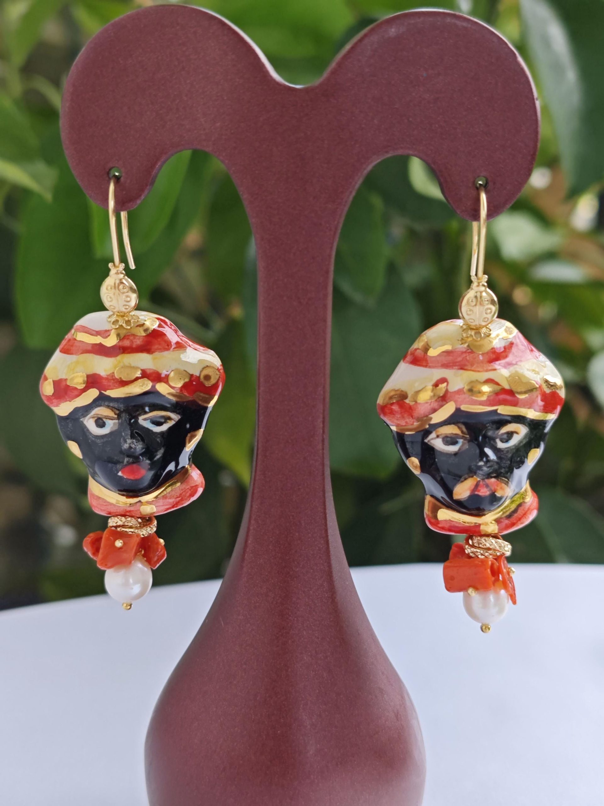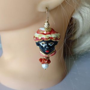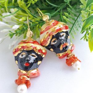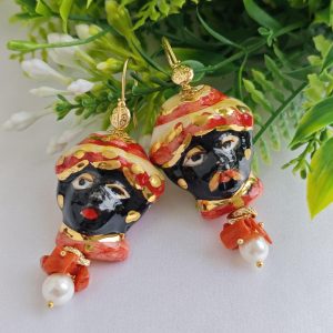 Orecchini pendenti con teste di moro in ceramica Caltagirone realizzata e dipinta a mano 3,5 cm, con applicazioni foglia d’oro 22 kt , perle naturali bianche e corallo rosso naturale mediterraneo,