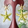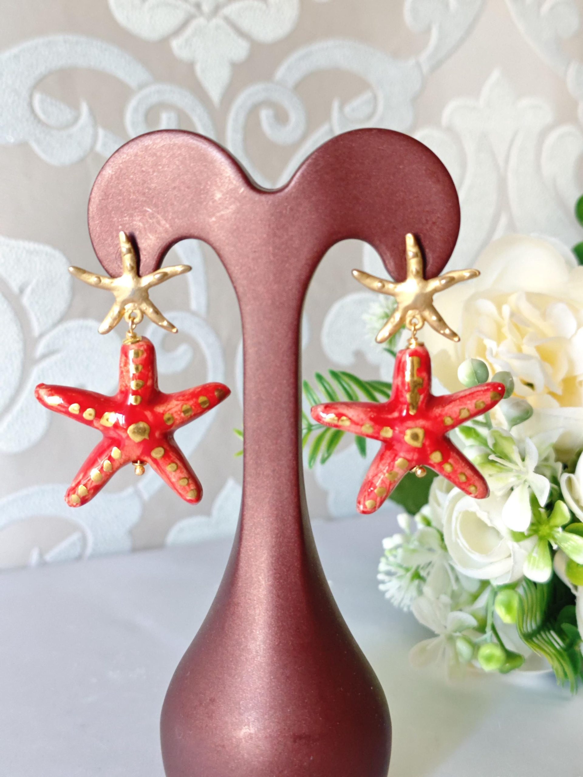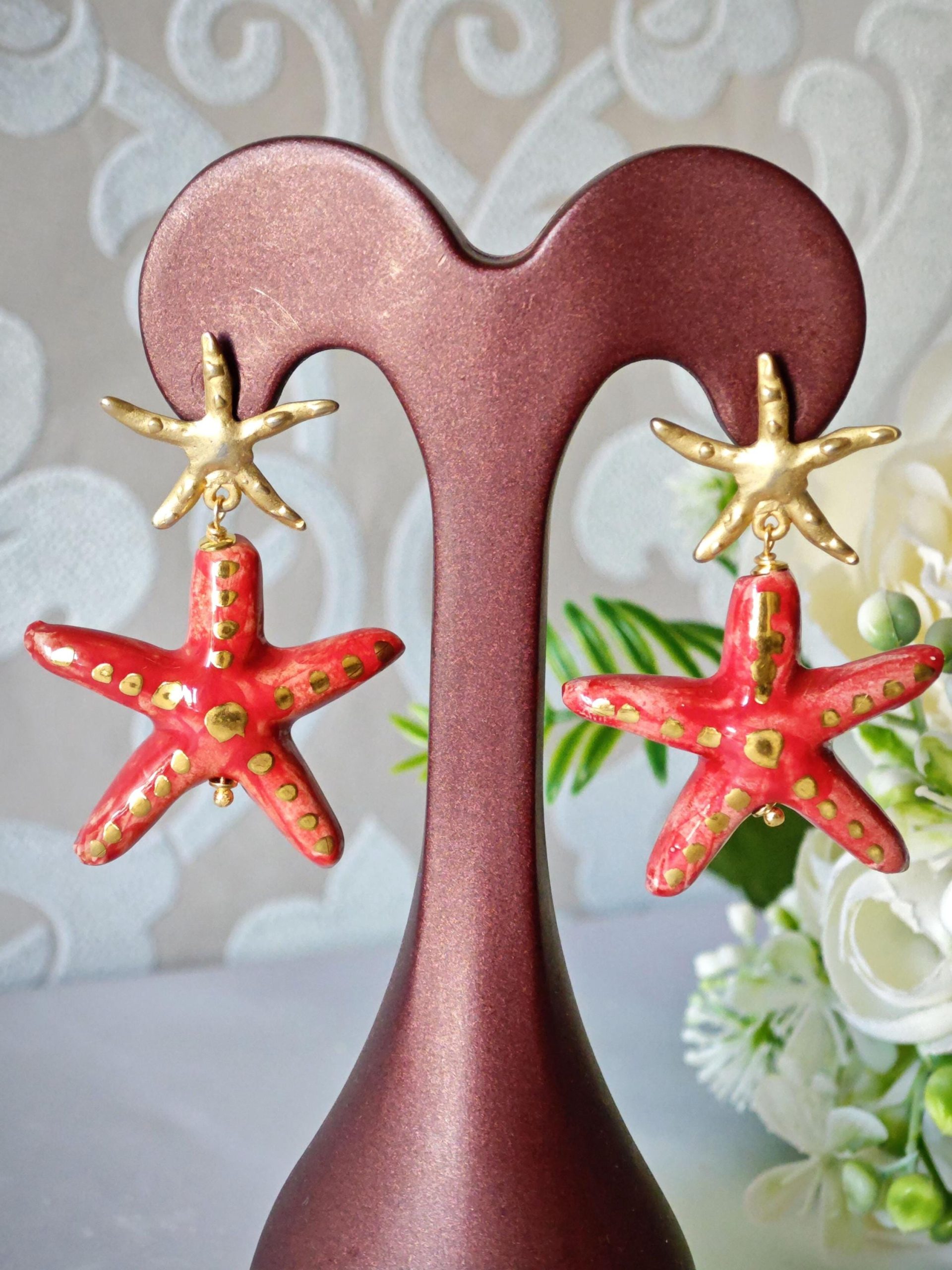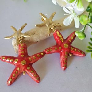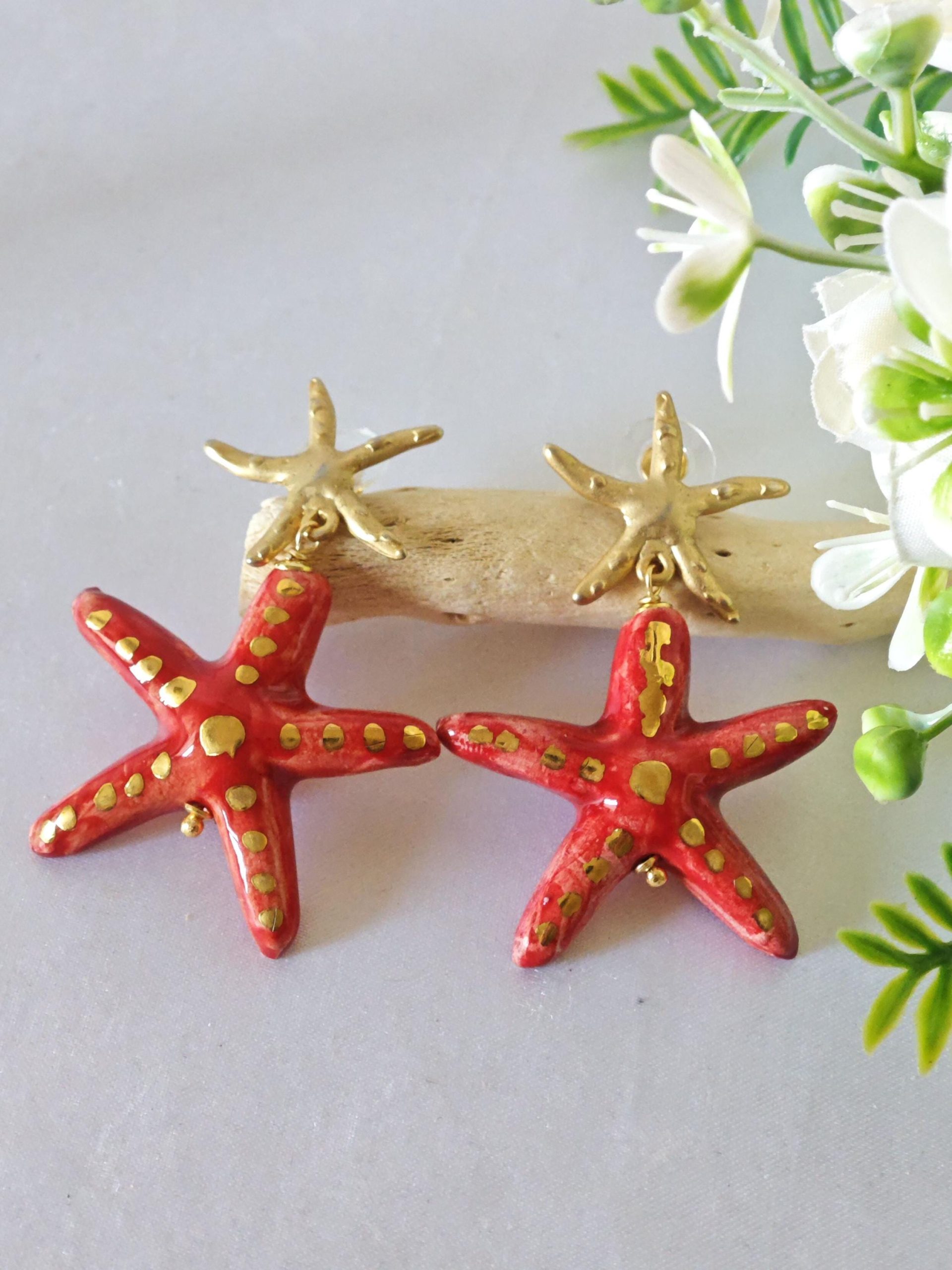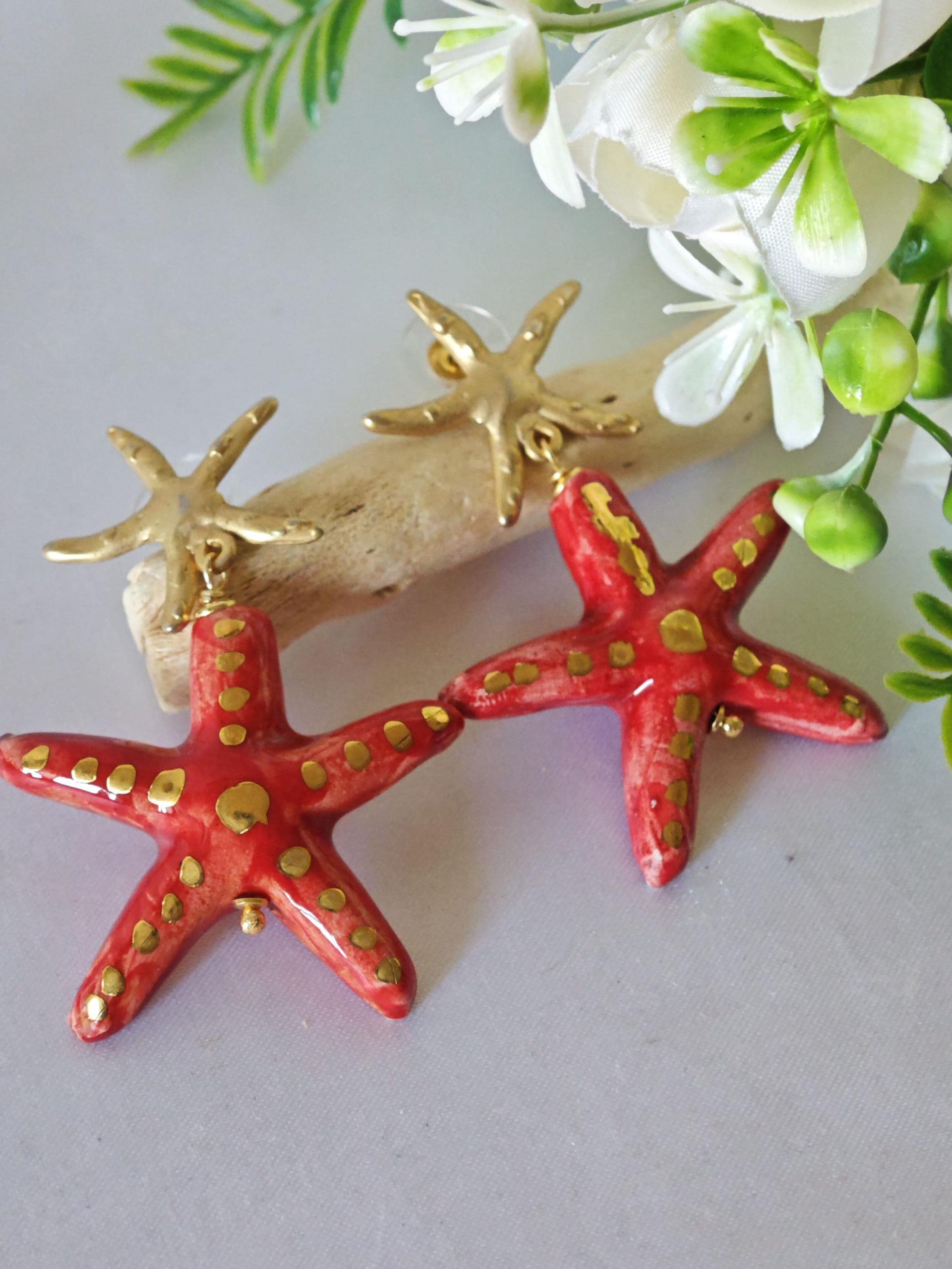 Orecchini pendenti con stelle marine in ceramica Caltagirone realizzata e dipinta a mano con applicazioni foglia oro 22 kt, 4 cm dimensioni.