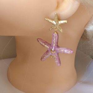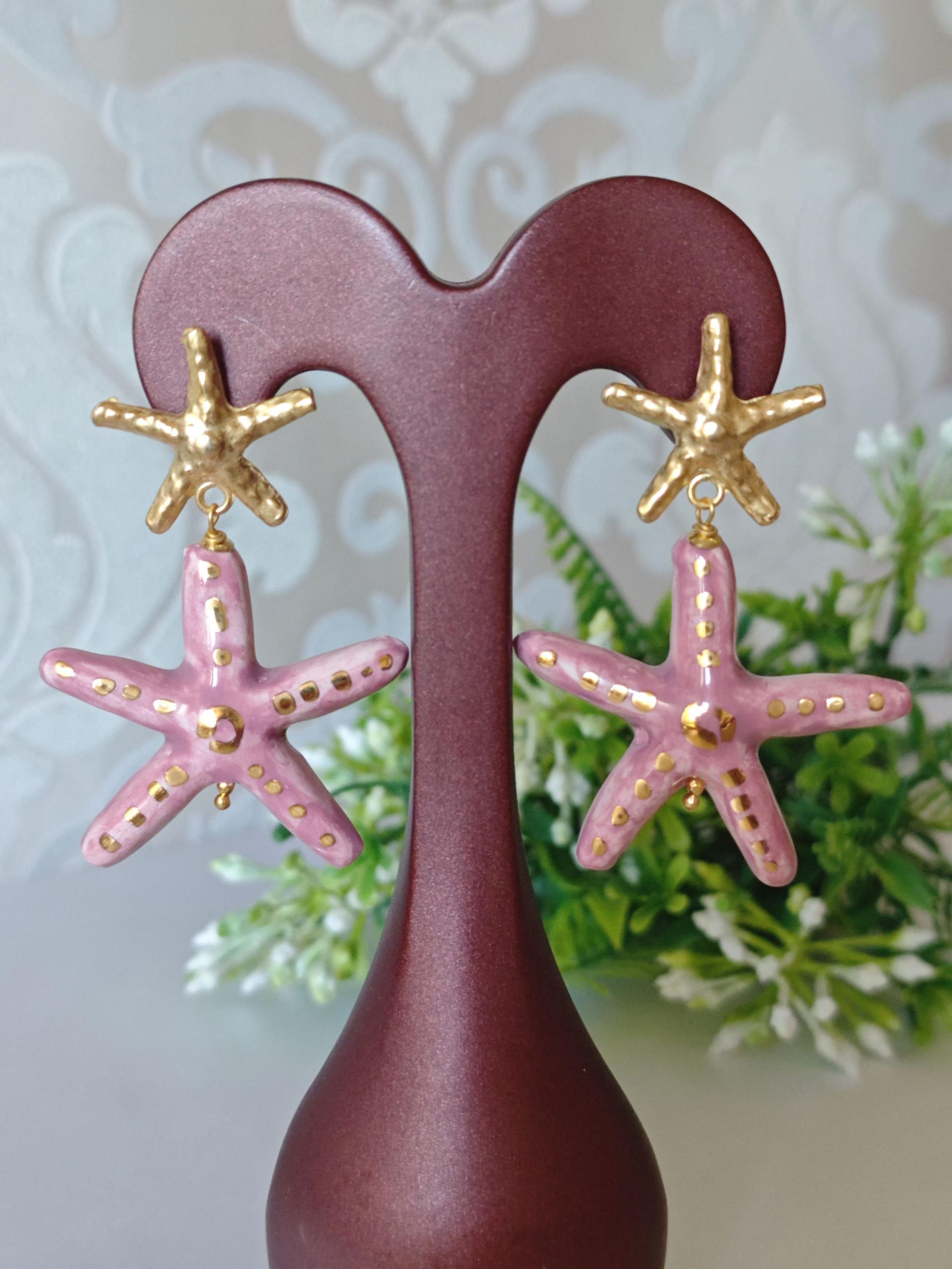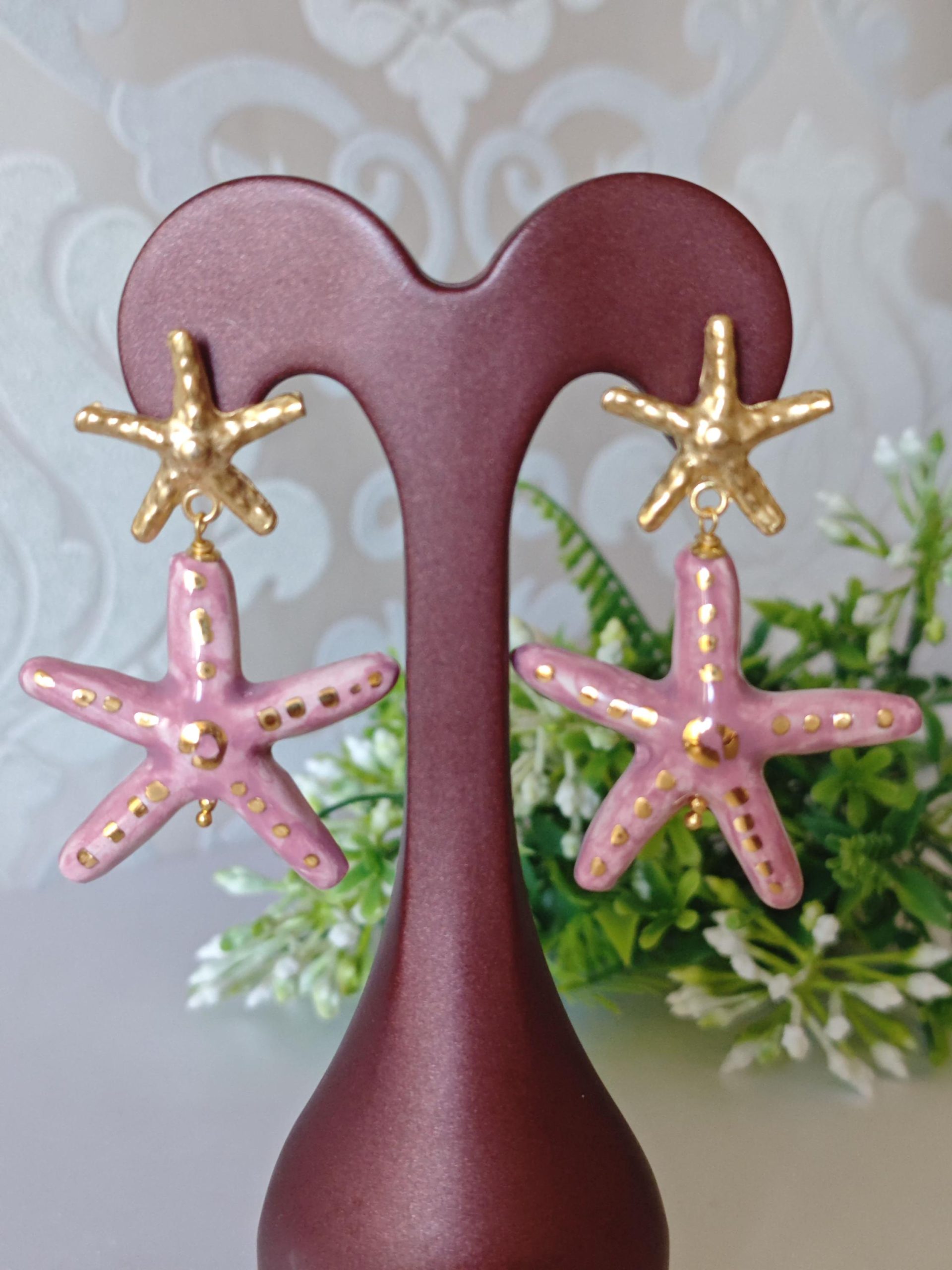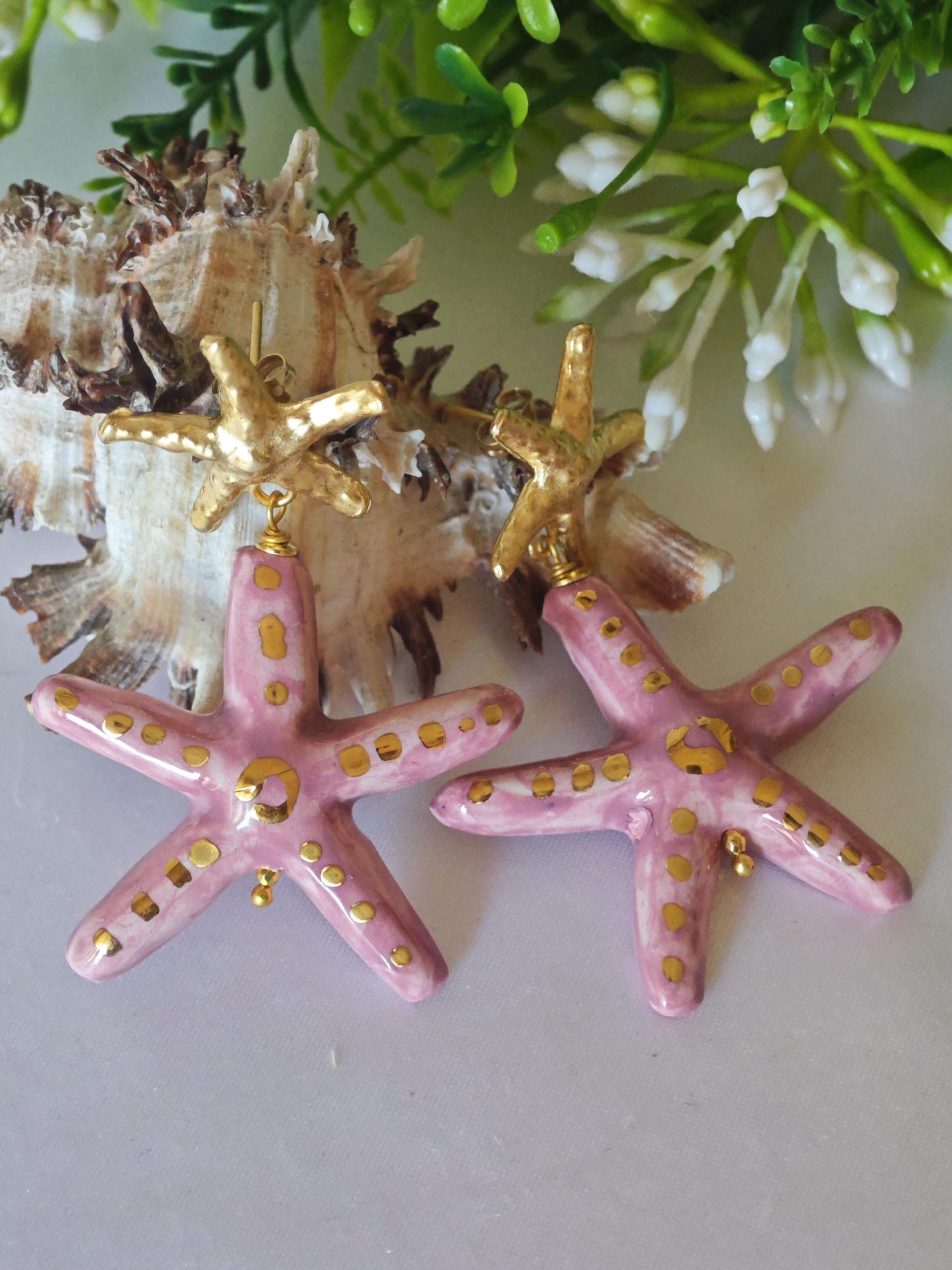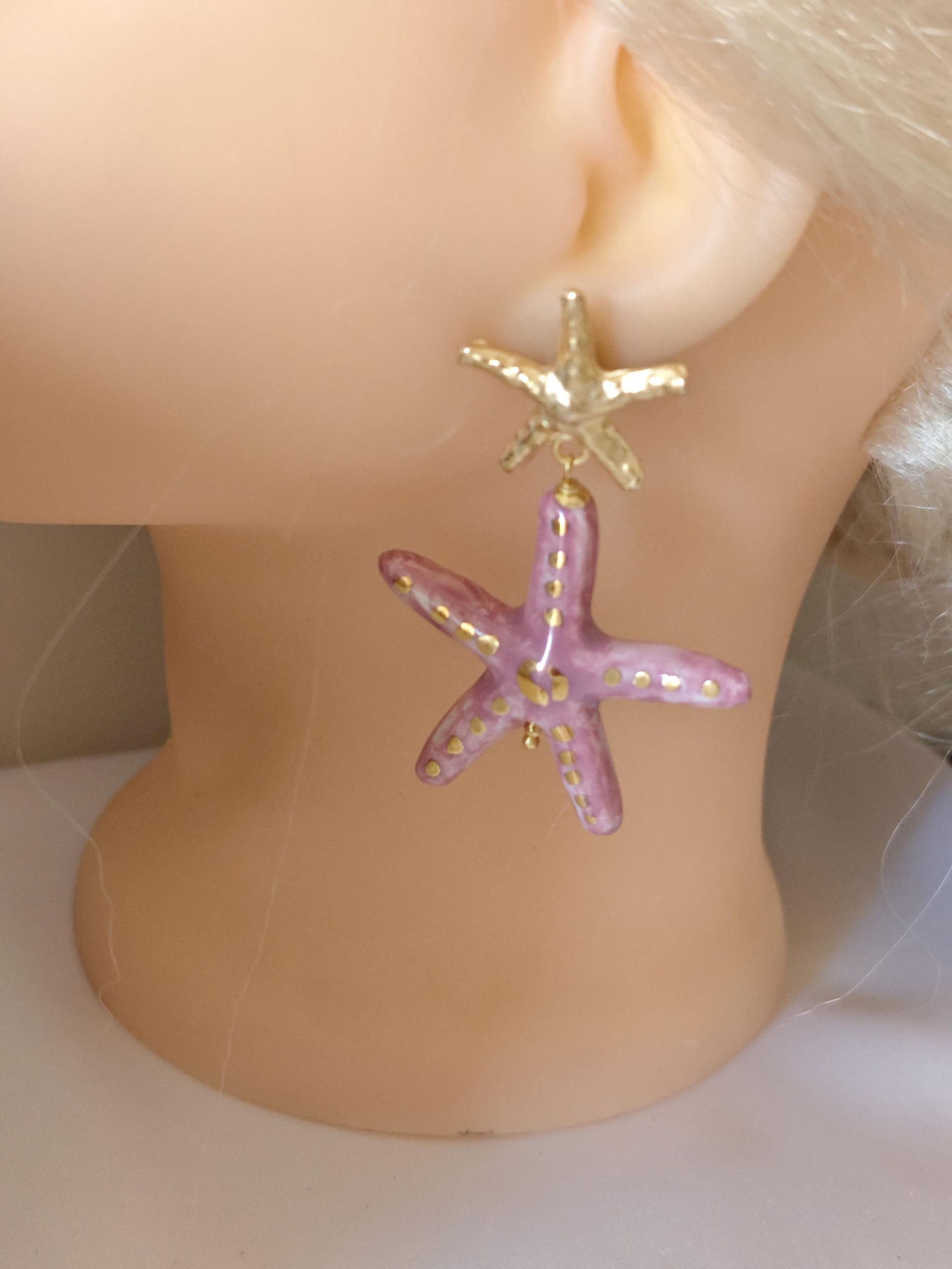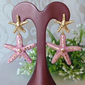 Orecchini pendenti con stelle marine in ceramica Caltagirone realizzata e dipinta a mano con applicazioni foglia oro 22 kt, 4 cm dimensioni.