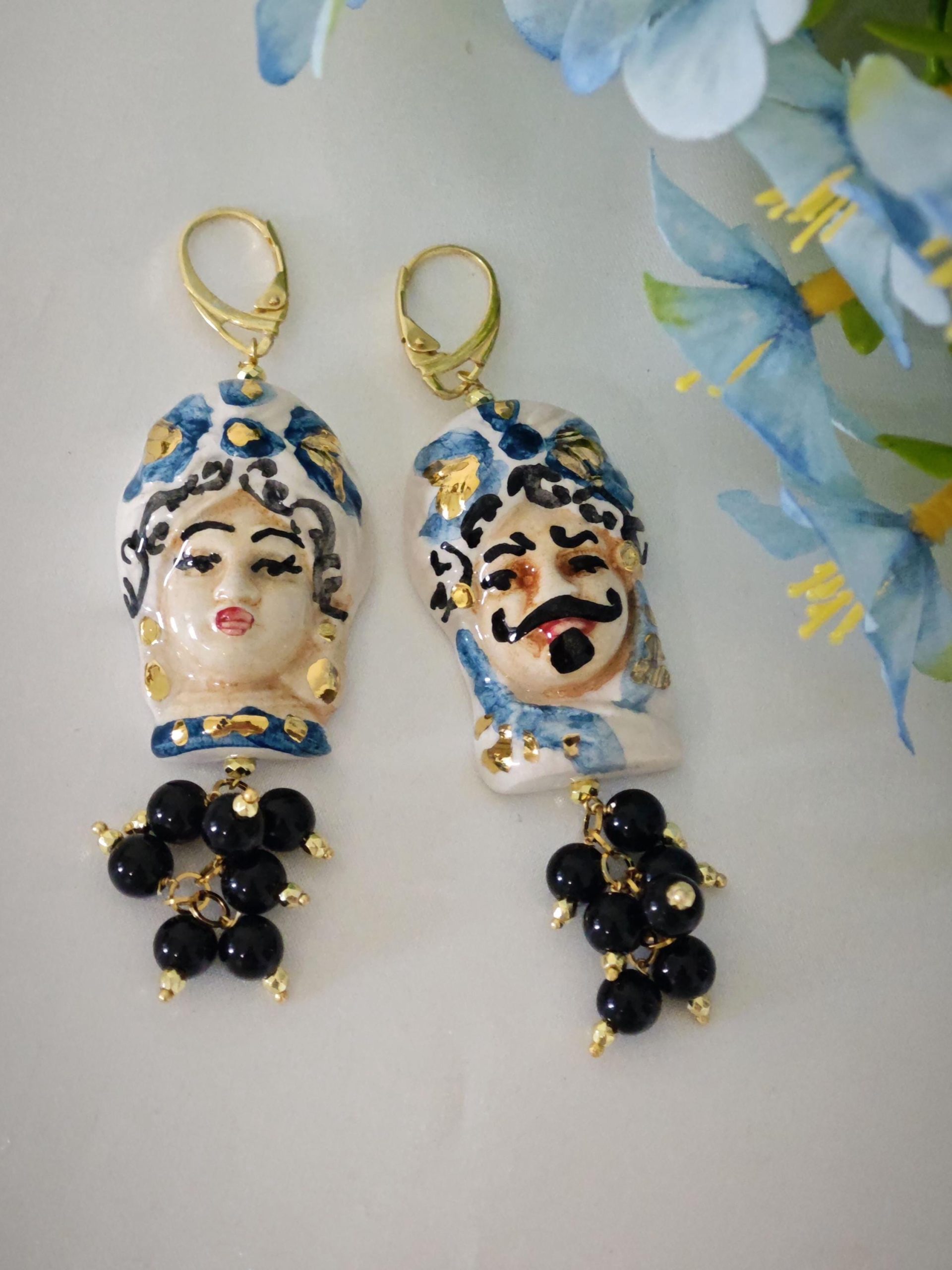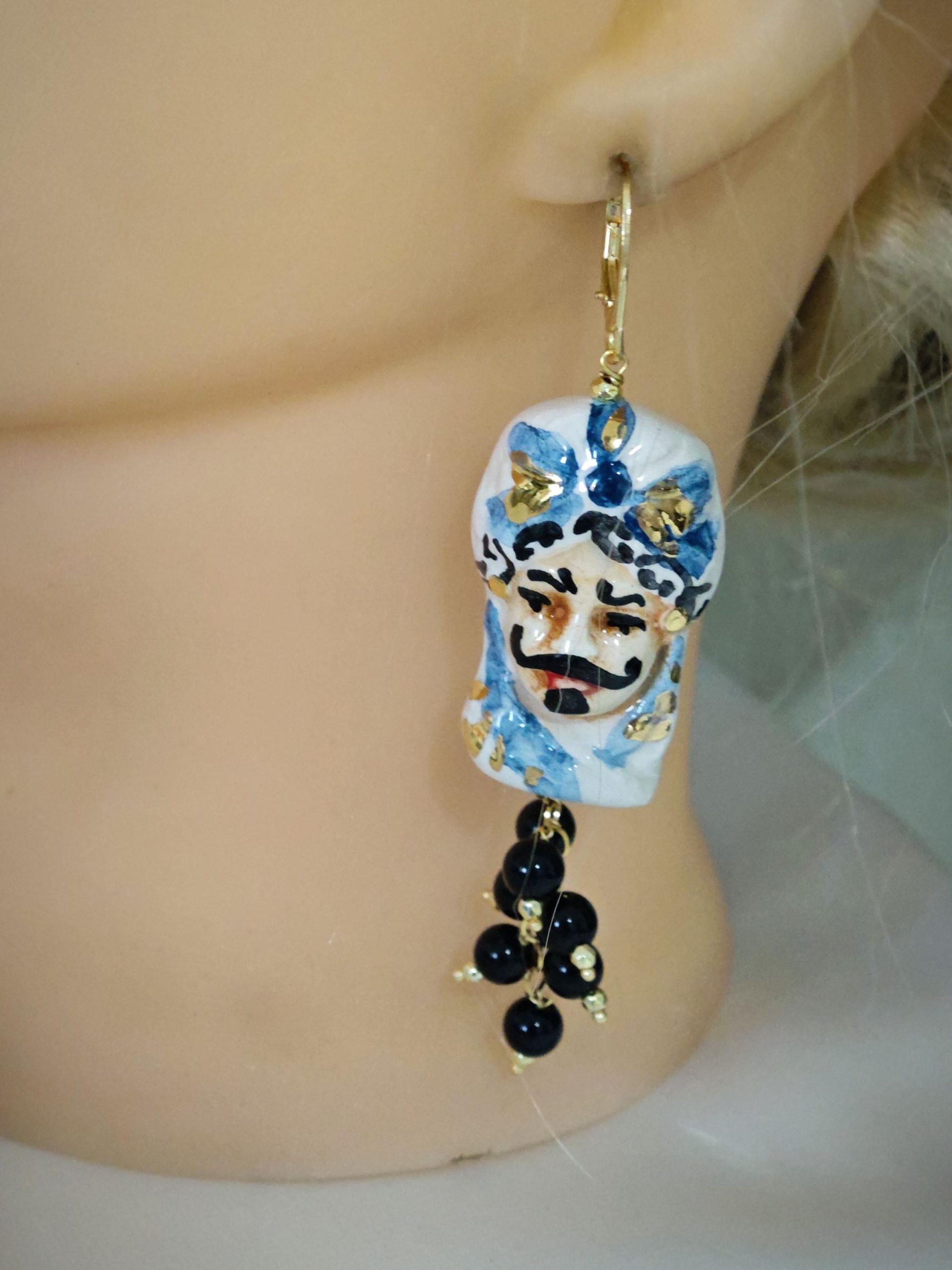 Orecchini con teste di moro in ceramica Caltagirone dipinta e realizzata a mano, con applicazioni foglia oro 22 kt, 4 cm dimensioni , grappolo pietre dure onice nero.
