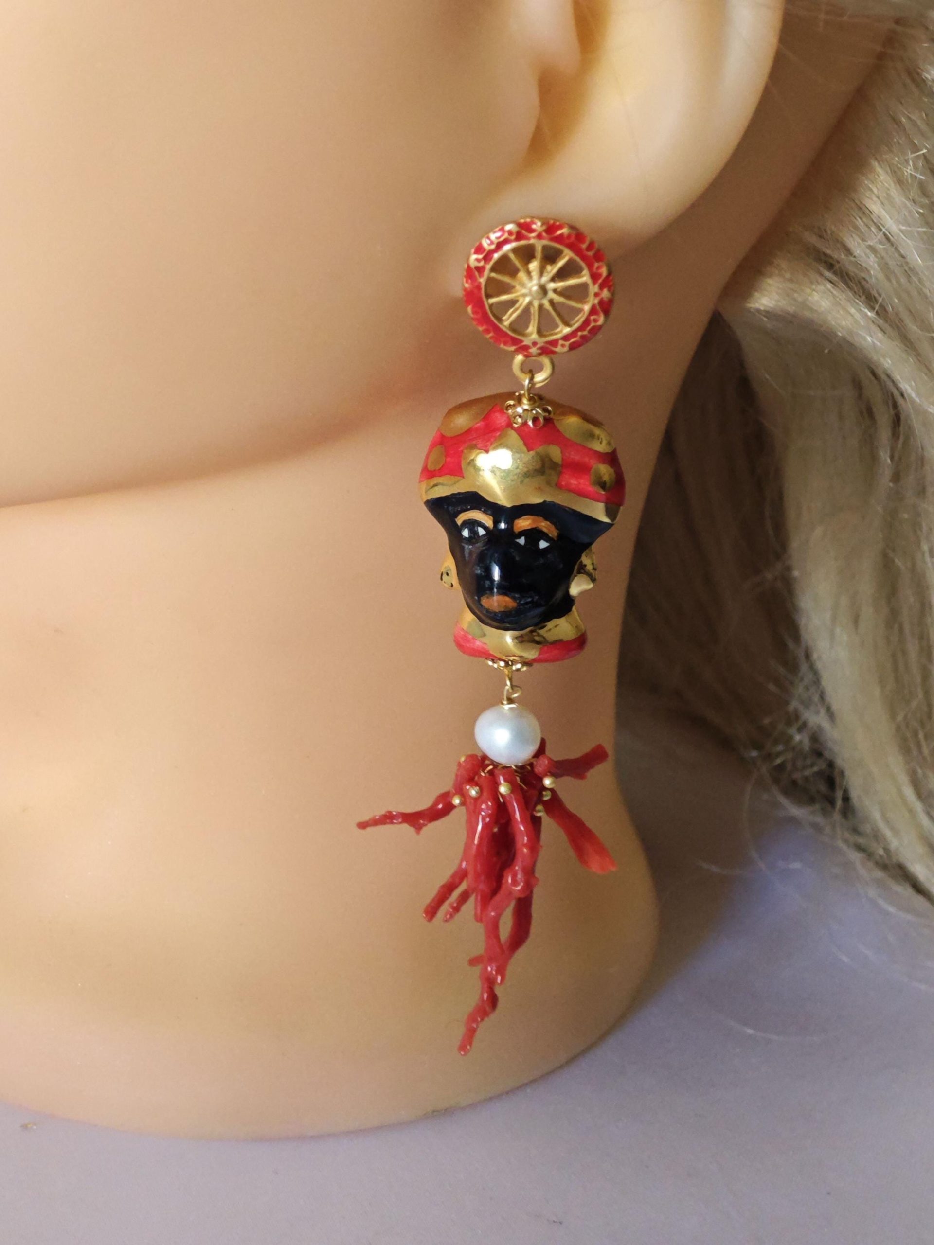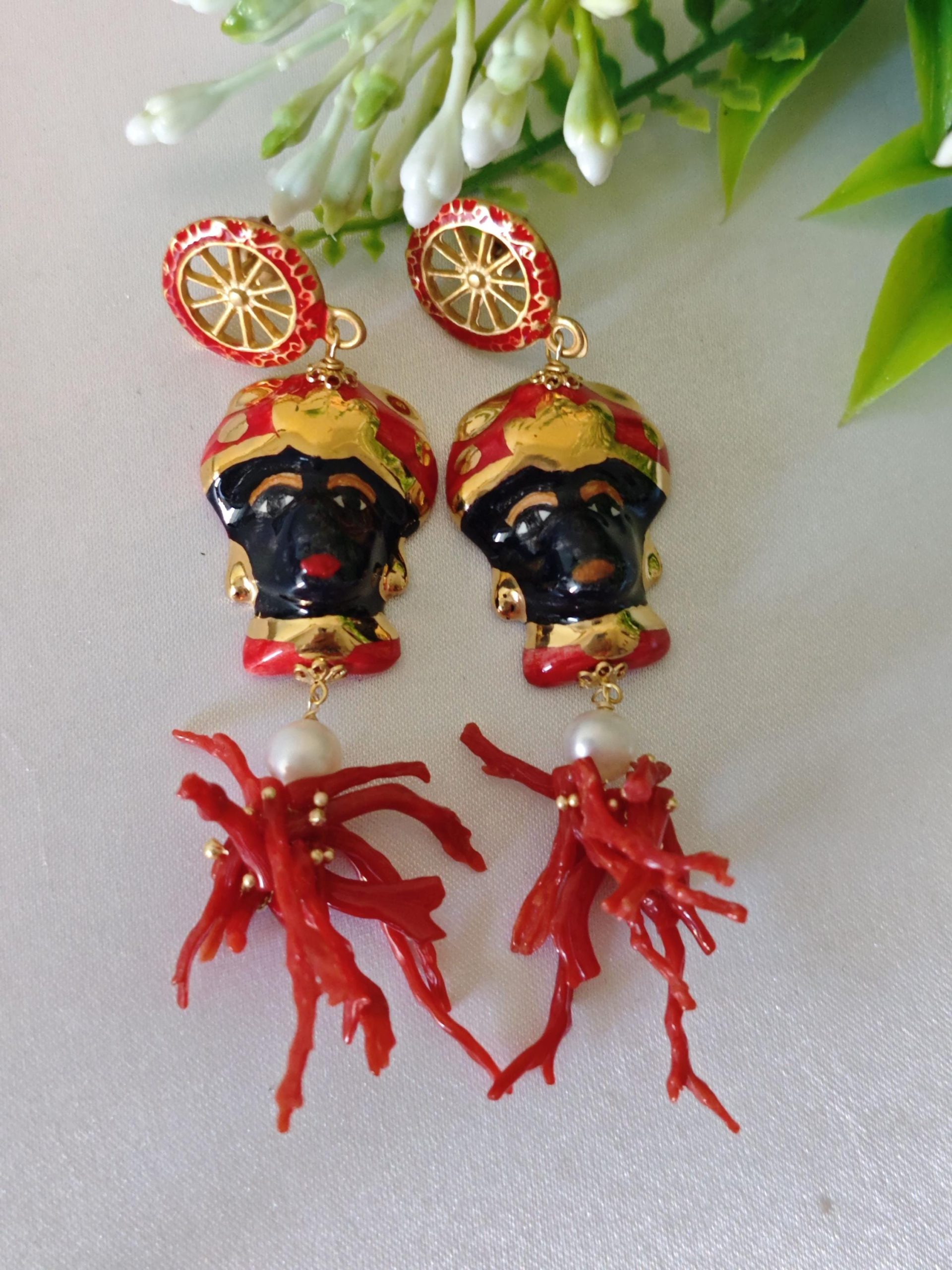 Orecchini pendenti con teste di moro in ceramica di Caltagirone realizzata e dipinta a mano, con applicazioni foglia oro 22 kt, 3 cm dimensioni, grappolo rametti corallo rosso mediterraneo e perle bianche naturali , chiusura a perno con farfallina con ruote carretto siciliano in ottone smaltato , lunghezza totale 9 cm.